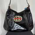 This product is Great. Gucci Patent Black Britt Bag.Medium size.Hobo bag with gold hardware.Signature large gold GG plate with Gucci web green&red.Magnetic snap closure. Lined interior with zip compartment.