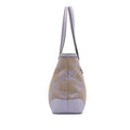 Product Details: Purple Gucci Medium Jumbo GG Ophidia Tote. This tote bag features a canvas body with leather trim, flat leather handles, an open top with magnetic snap closure, and interior zip and slip pockets. 11.4" L x 15" W x 5.5" D, 10.2" drop. Serial number 631685 493492.