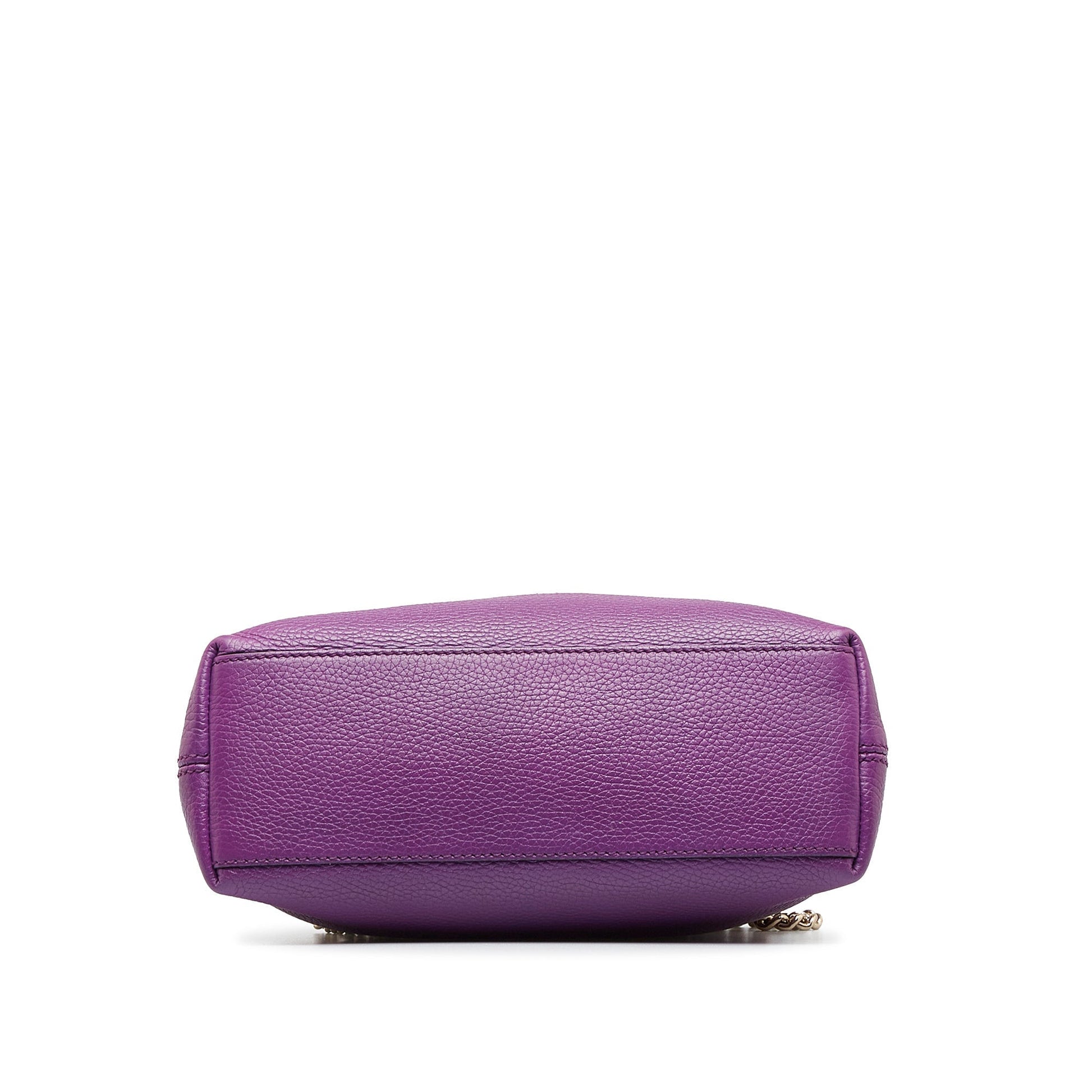 Product Details: Purple Gucci Soho Chain Tote. This tote bag features a leather body, chain link straps, an open top, and interior slip pockets. 6.7" L x 9.8" W x 3.9" D, 10.2" drop. Serial number 387043 498879.