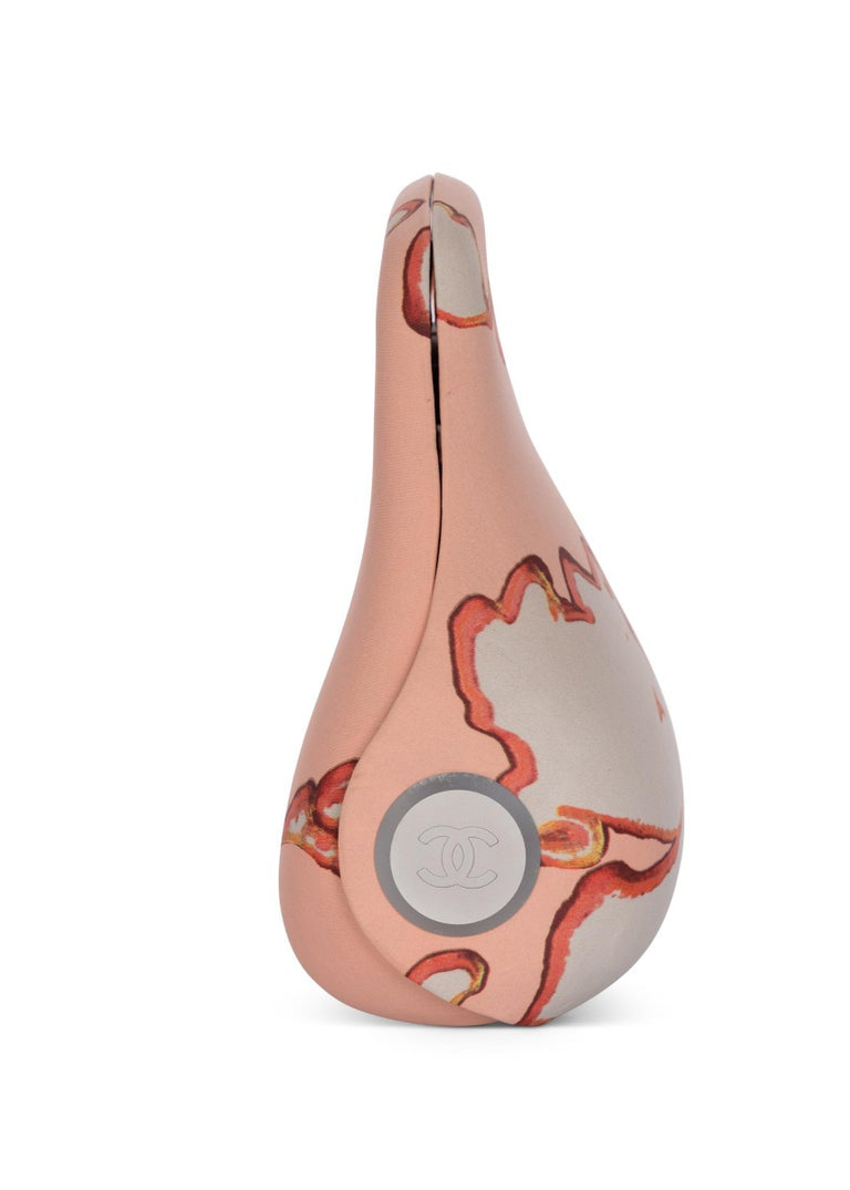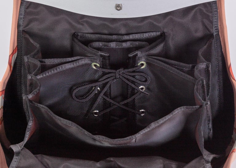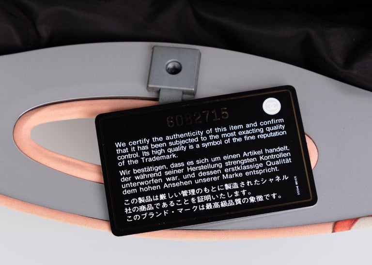 Tones of salmon, coral, and rose are marbled to create the image and form the design on the Bag. Lightly printed on the front is the interlocking CC logo. On each side is a grey logoed plate that makes up the swivel for the Bag to open. The interior is made from black nylon and features a corset lace detail at the middle and had 8 pockets created from the accordion style opening. Ergonomic for carry and excellent storage, this Chanel Bag is equally collectable and functional.