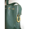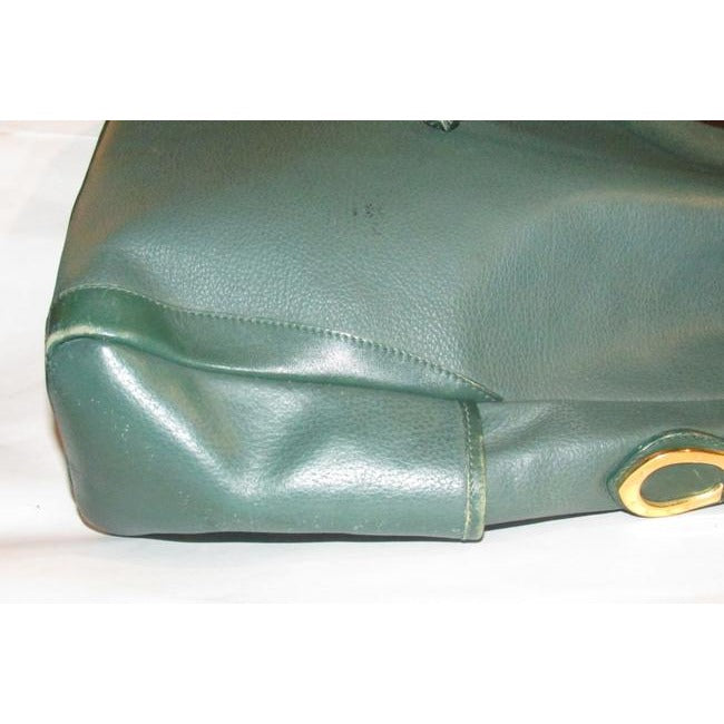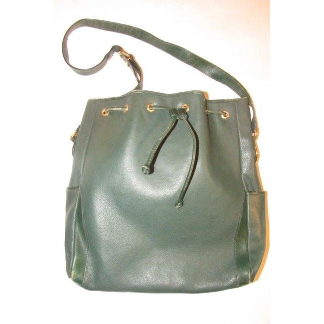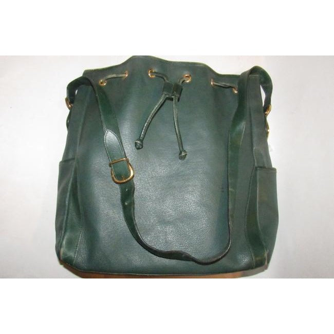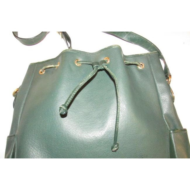 The bag is made of buttery soft, emerald green leather in a drawstring bucket style with lots of room. There is an interior, zip top pocket. The top and the piping are solid and show little wear throughout! There is a gold embossed, logo tag on the exterior, but other than that and the pulls and hardware, this purse is very understated. This drawstring style and its many variations was (and still is) a style staple Gucci has produced and perfected and this is a great example! This is a perfect signature purse in a timeless style! It has a classic look that will never go out of style. It'd be a fantastic addition to any collection!