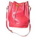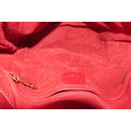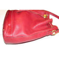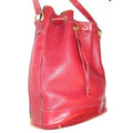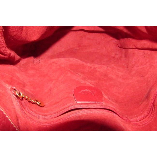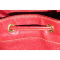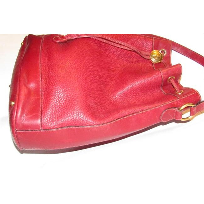 The bag is made a combination of red, pebbled and smooth leather in a bucket style, cross body or shoulder bag with lots of room! It has a drawstring top closure and an adjustable strap. The drawstring is connected and there is a gold engraved 'GG' accent that regulates how tight it is around the top. The purse has a footed bottom and gold engraved hardware. This is a fabulous purse has a lifetime to live with you!