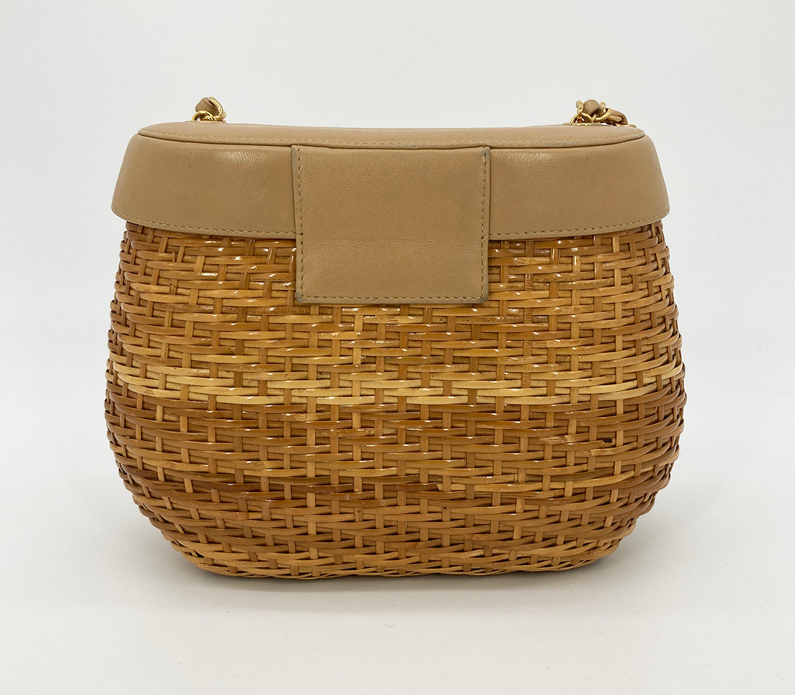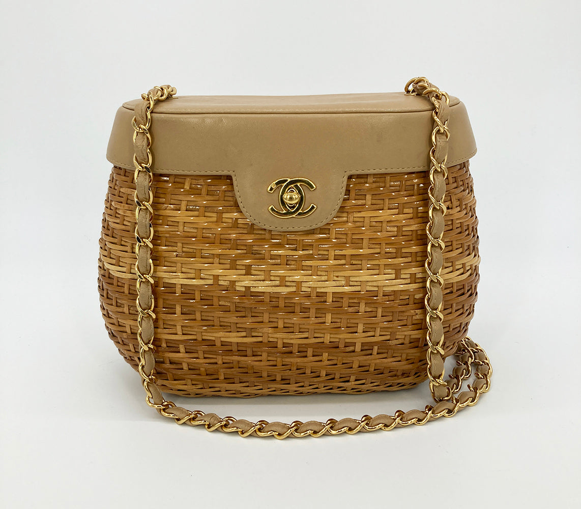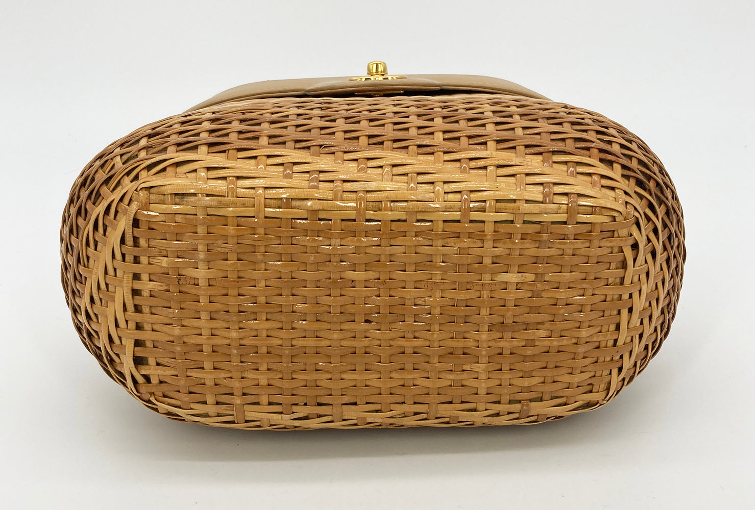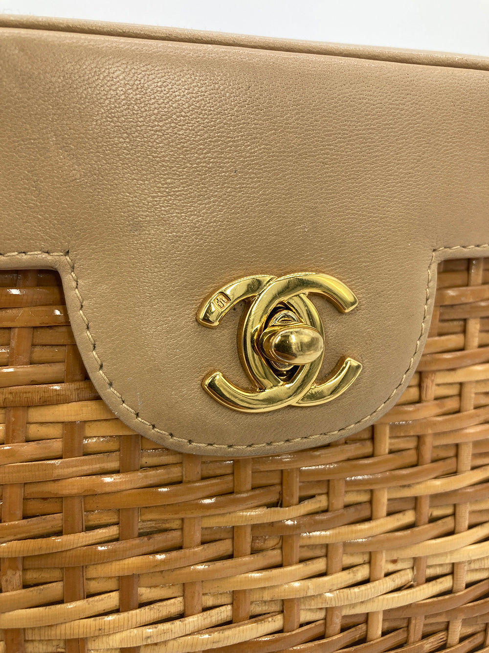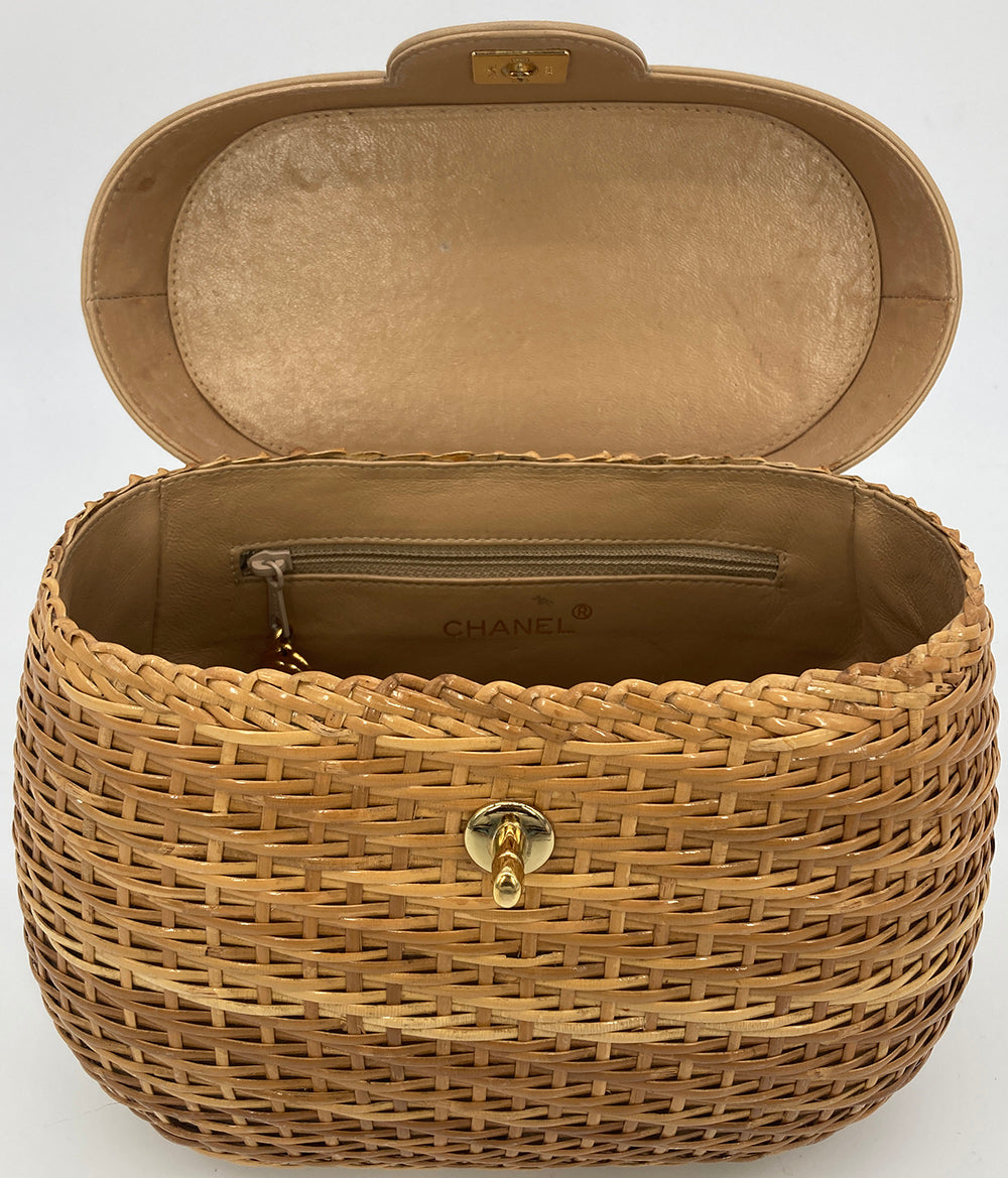 RARE VINTAGE Chanel Wicker Basket Bag in very good condition. Natural tan wicker basket body with tan leather top and gold hardware trim. woven chain and leather shoulder strap. Front twist CC logo closure opens to a tan leather interior with one slit and one zipped side pockets. Overall very good vintage condition. Light signs of use throughout with gentle scuffs on leather both inside and out. Deeper scuffs on leather under top flap. light wear on leather in shoulder strap. see photos for details. This is a rare collectors piece and a must-have for Chanel lovers. purchase includes care booklet and ity card. measurements: 9.25"x7"x4.5" 20.5" strap drop