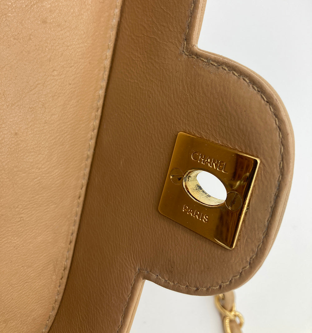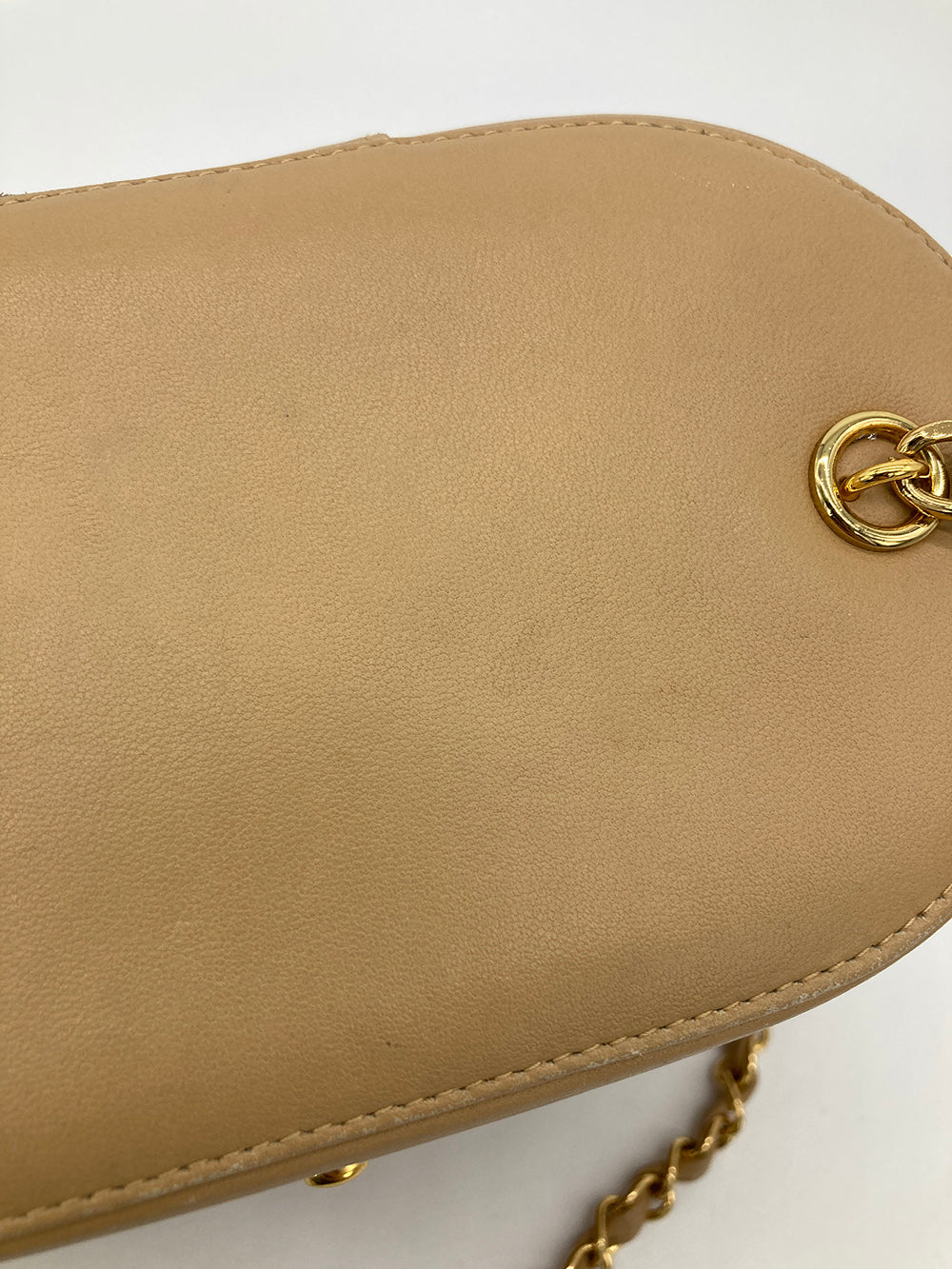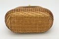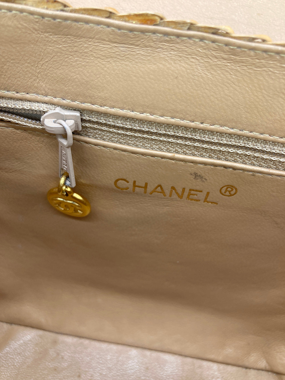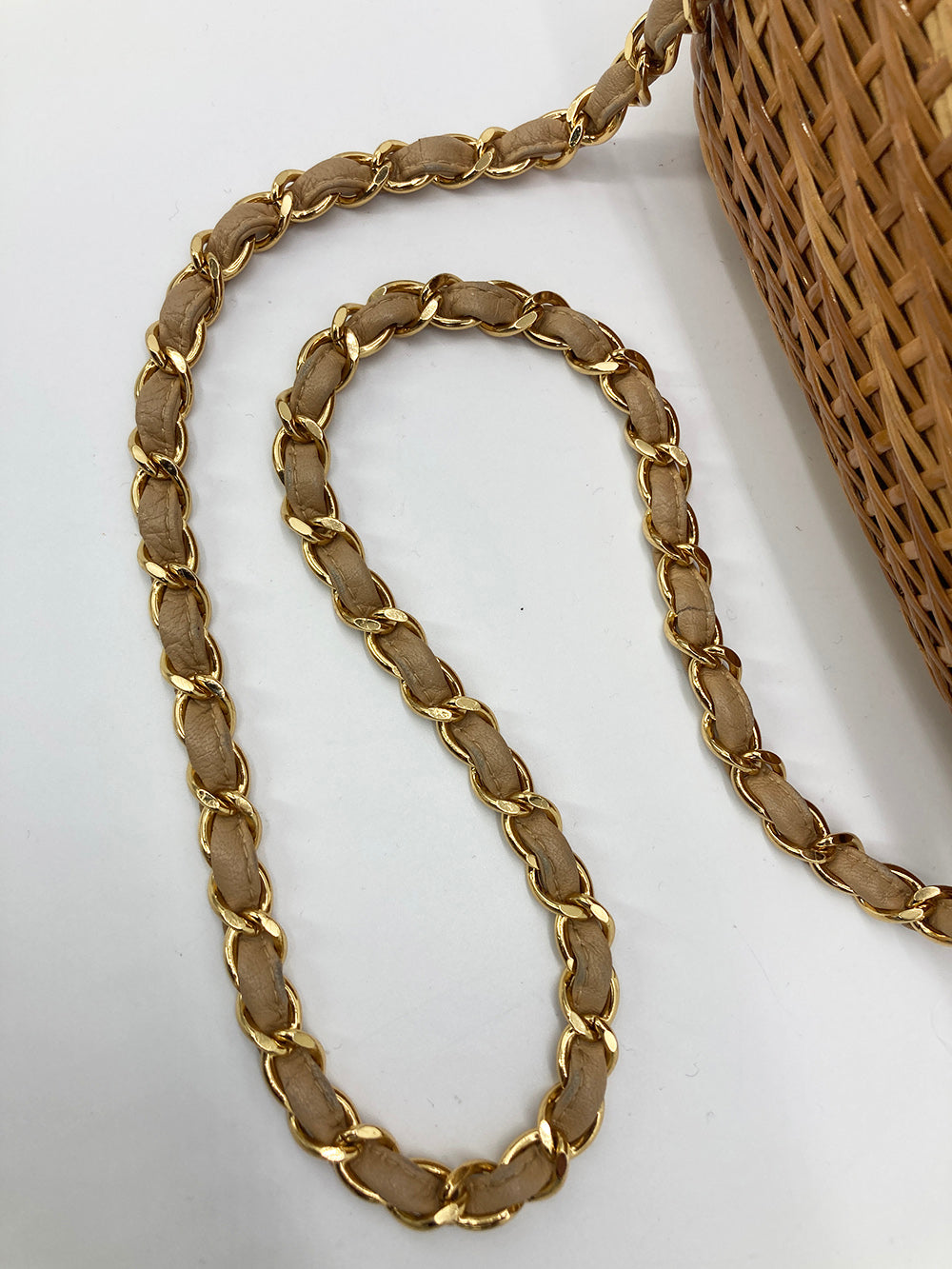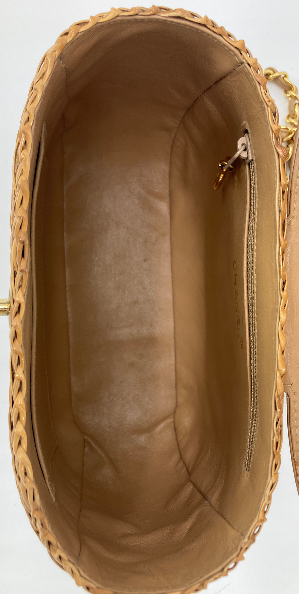 RARE VINTAGE Chanel Wicker Basket Bag in very good condition. Natural tan wicker basket body with tan leather top and gold hardware trim. woven chain and leather shoulder strap. Front twist CC logo closure opens to a tan leather interior with one slit and one zipped side pockets. Overall very good vintage condition. Light signs of use throughout with gentle scuffs on leather both inside and out. Deeper scuffs on leather under top flap. light wear on leather in shoulder strap. see photos for details. This is a rare collectors piece and a must-have for Chanel lovers. purchase includes care booklet and ity card. measurements: 9.25"x7"x4.5" 20.5" strap drop