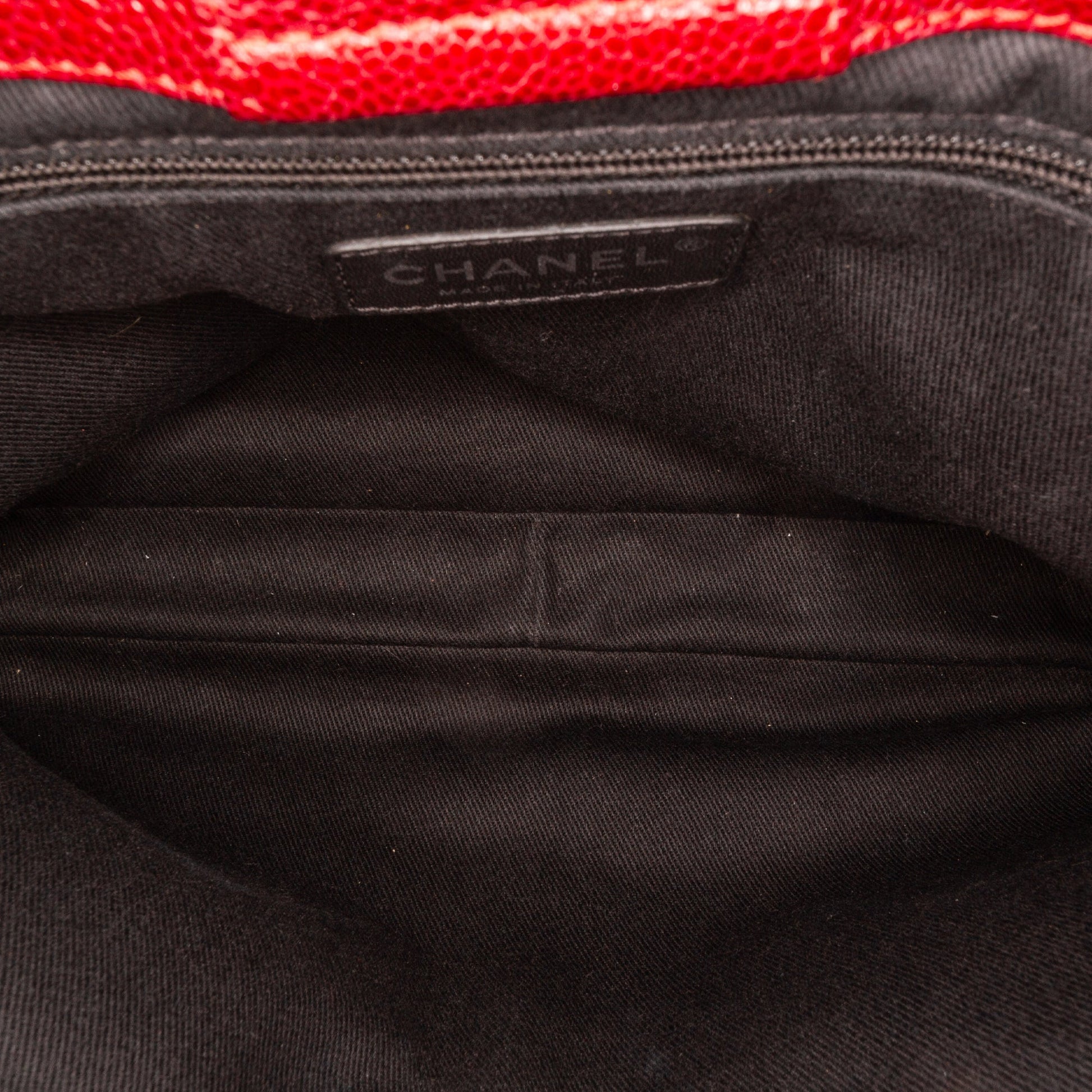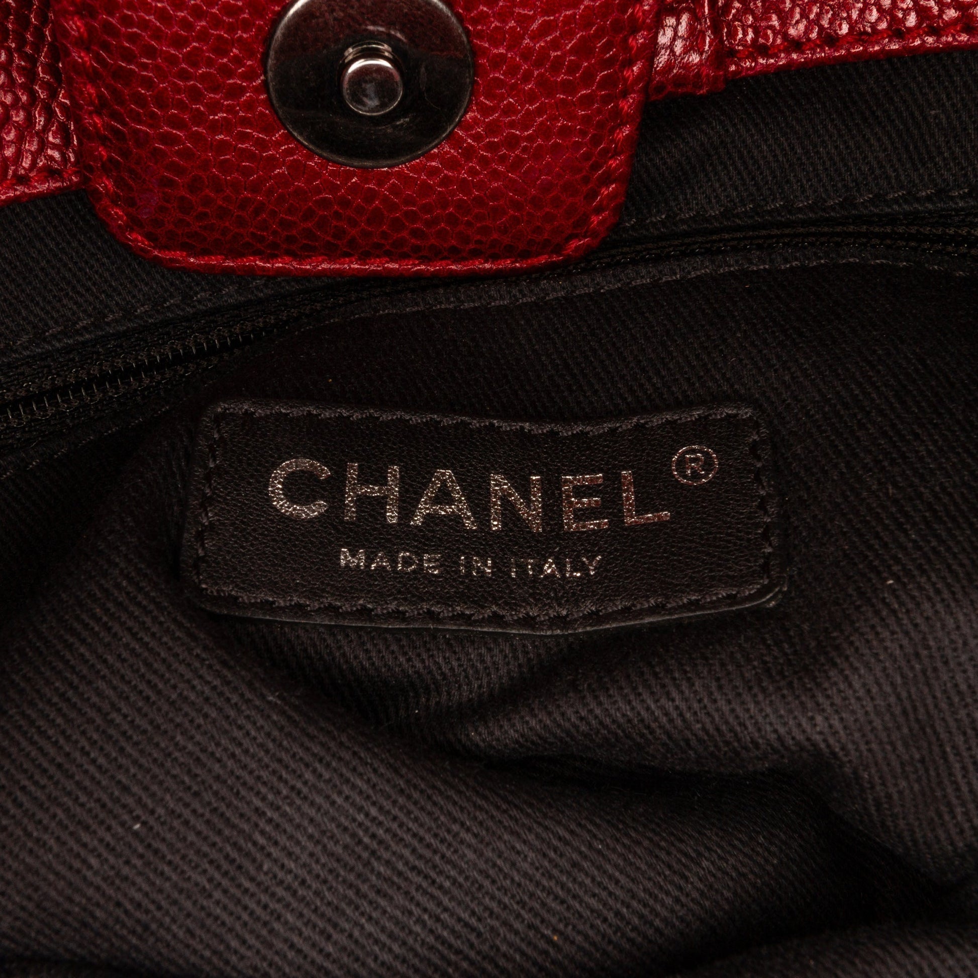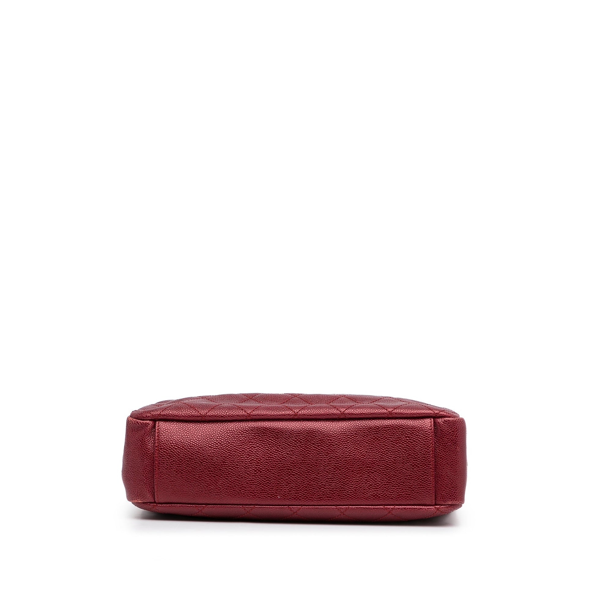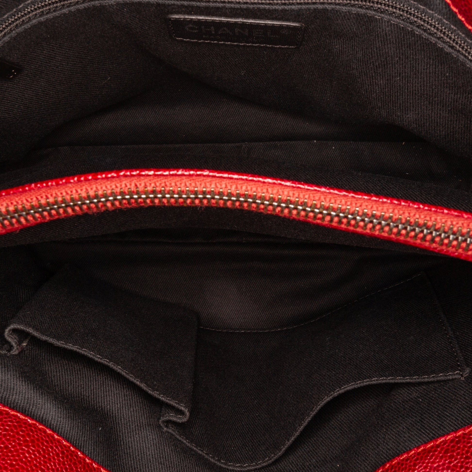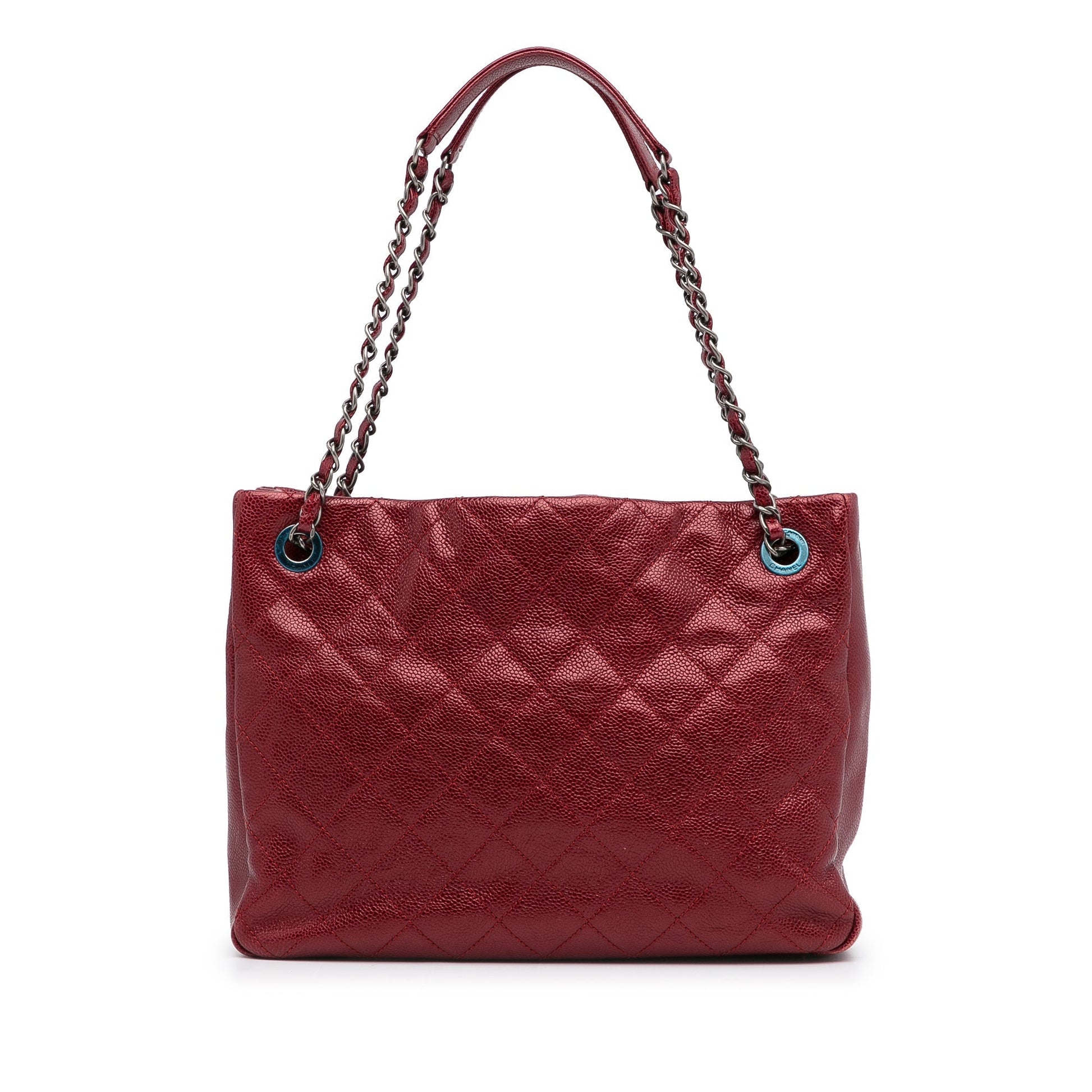 Product Details: Red Chanel Small Caviar City Shopper Tote Bag. The City Shopper bag features a quilted caviar leather body, curb chain straps, an open top, an interior zip compartment, and interior zip and slip pockets. 8.7" L x 11.4" W x 3.1" D, 8.7" drop. Serial number 17122695.