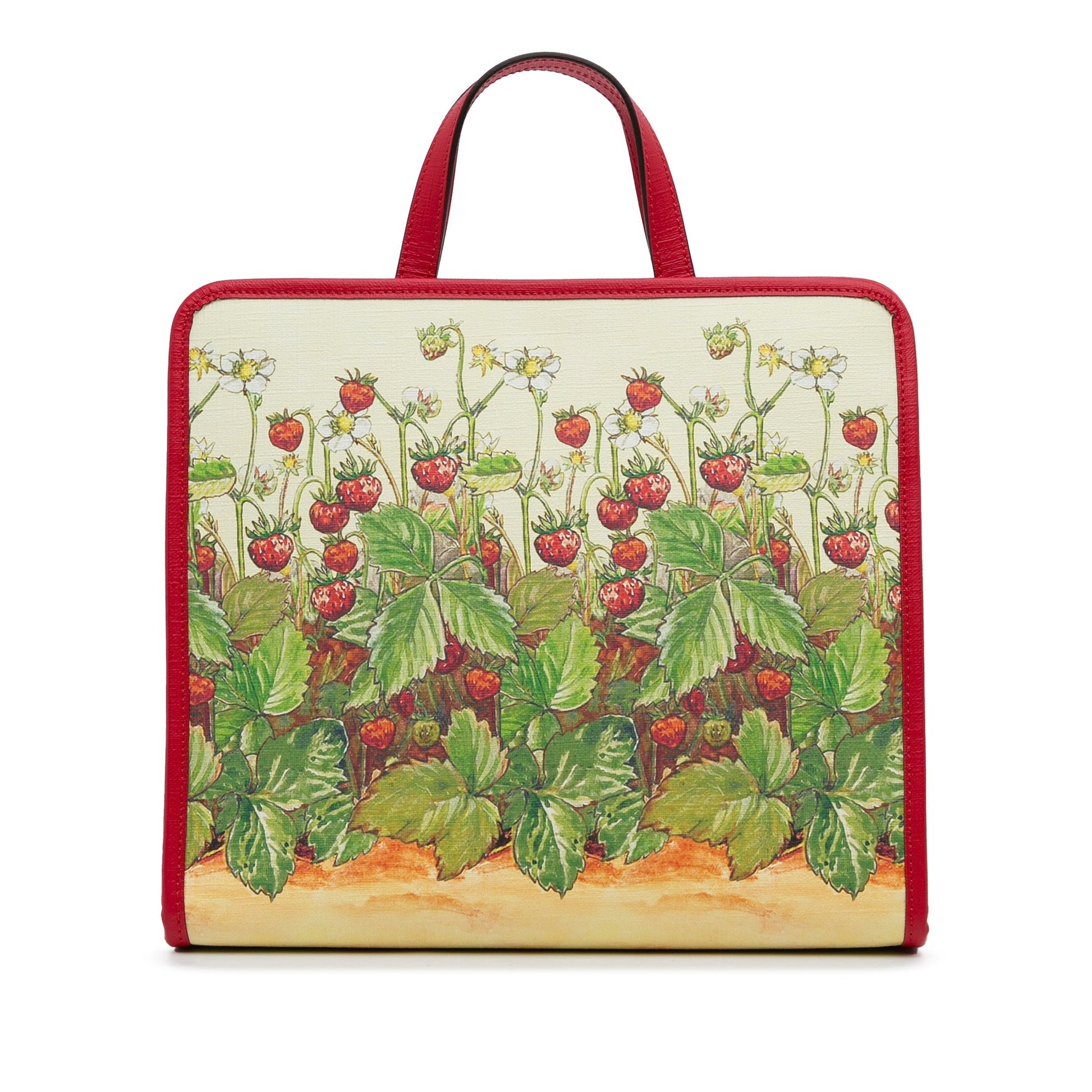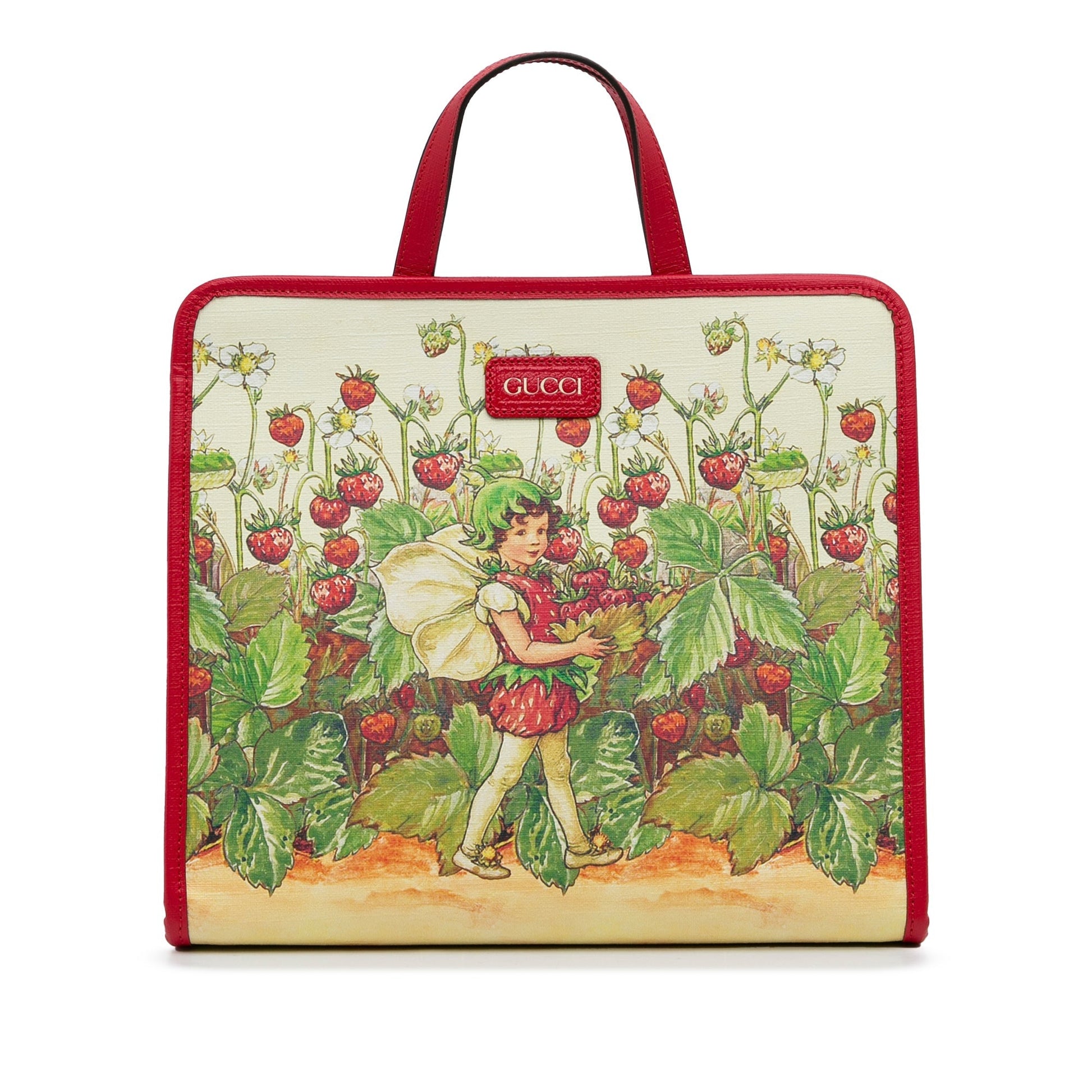 Product Details: Red Gucci Kids Strawberry Fairy Tote Bag. This tote bag features a printed coated canvas body, flat leather handles, an open top with magnetic snap button closure, and an interior slip pocket. 11.2" L x 10.2" W x 3.9" D, 3.3" drop. Serial number 605614 520981.