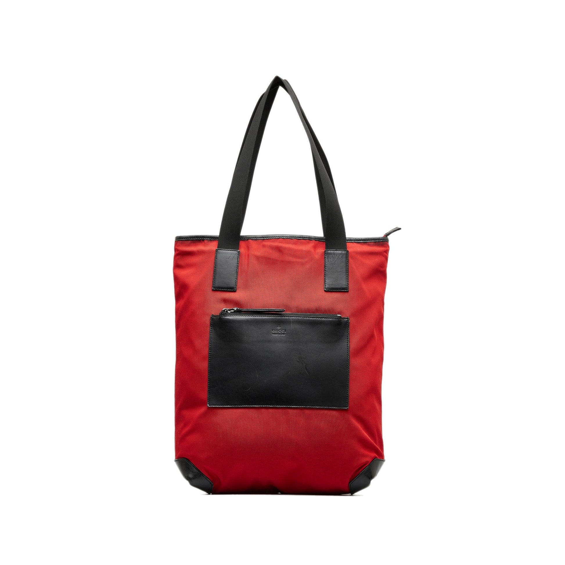 Product Details: Red Gucci Nylon Tote Bag. This tote bag features a nylon body, flat handles, a front exterior zip pocket, a top zip closure, and an interior zip pocket. 13.8" L x 10.6" W x 4.7" D, 8.3" drop. Serial number 019-0401 200047.