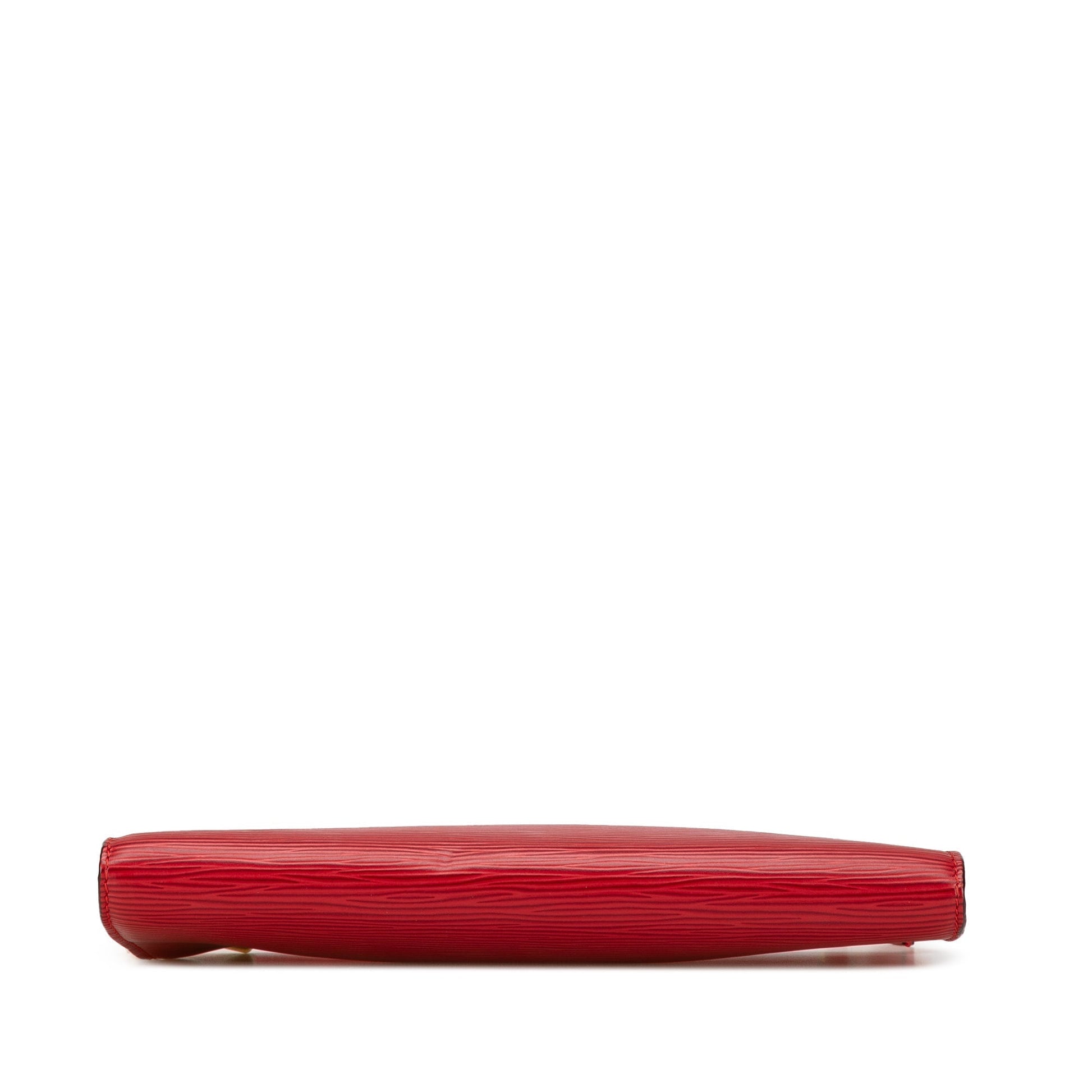 Product Details: Red Louis Vuitton Epi Pochette Accessoires Shoulder Bag. The Pochette Accessoires features an epi leather body, a flat leather shoulder strap, and a top zip closure. 4.9" L x 9.4" W x 0.8" D, 5.1" drop. Serial number AR1918.