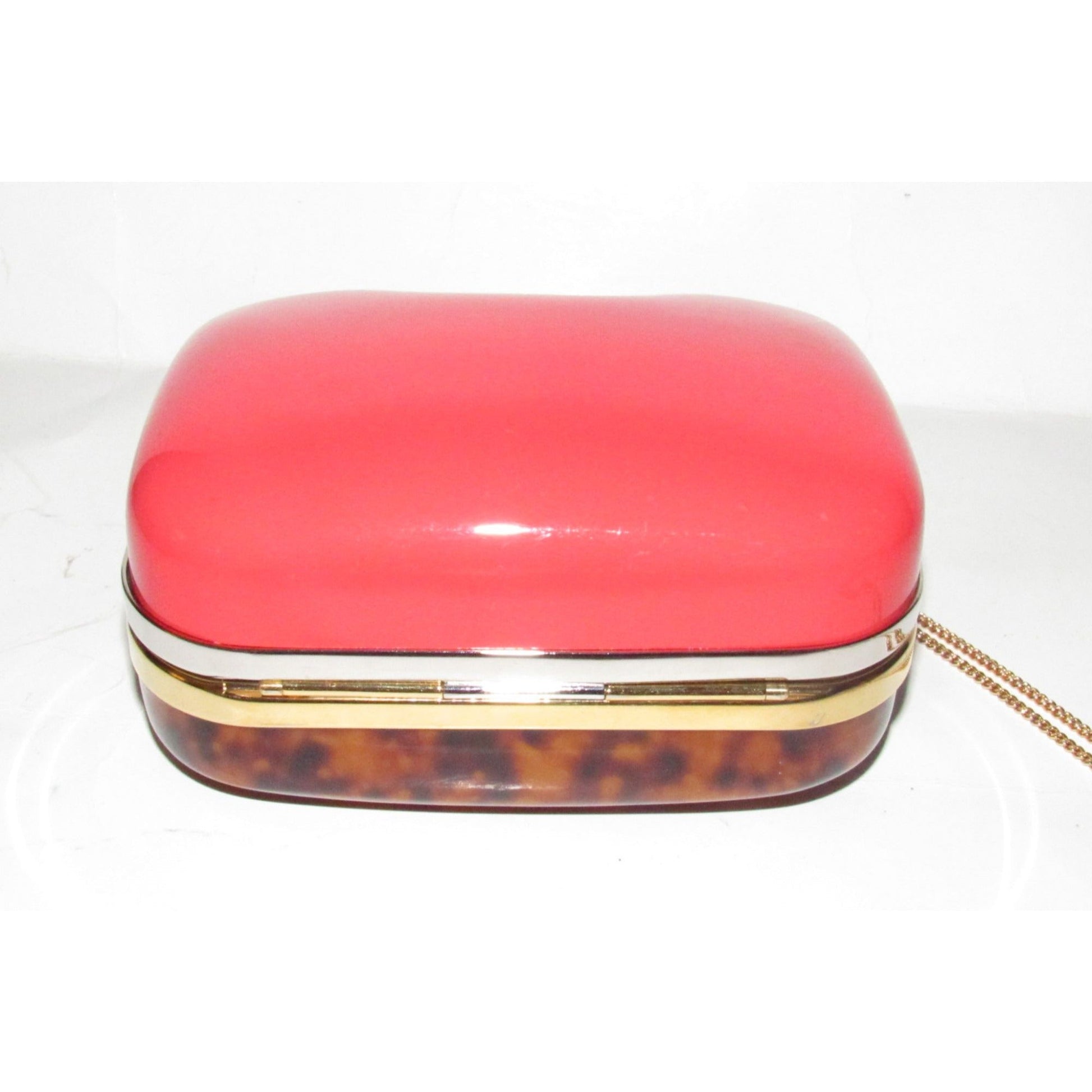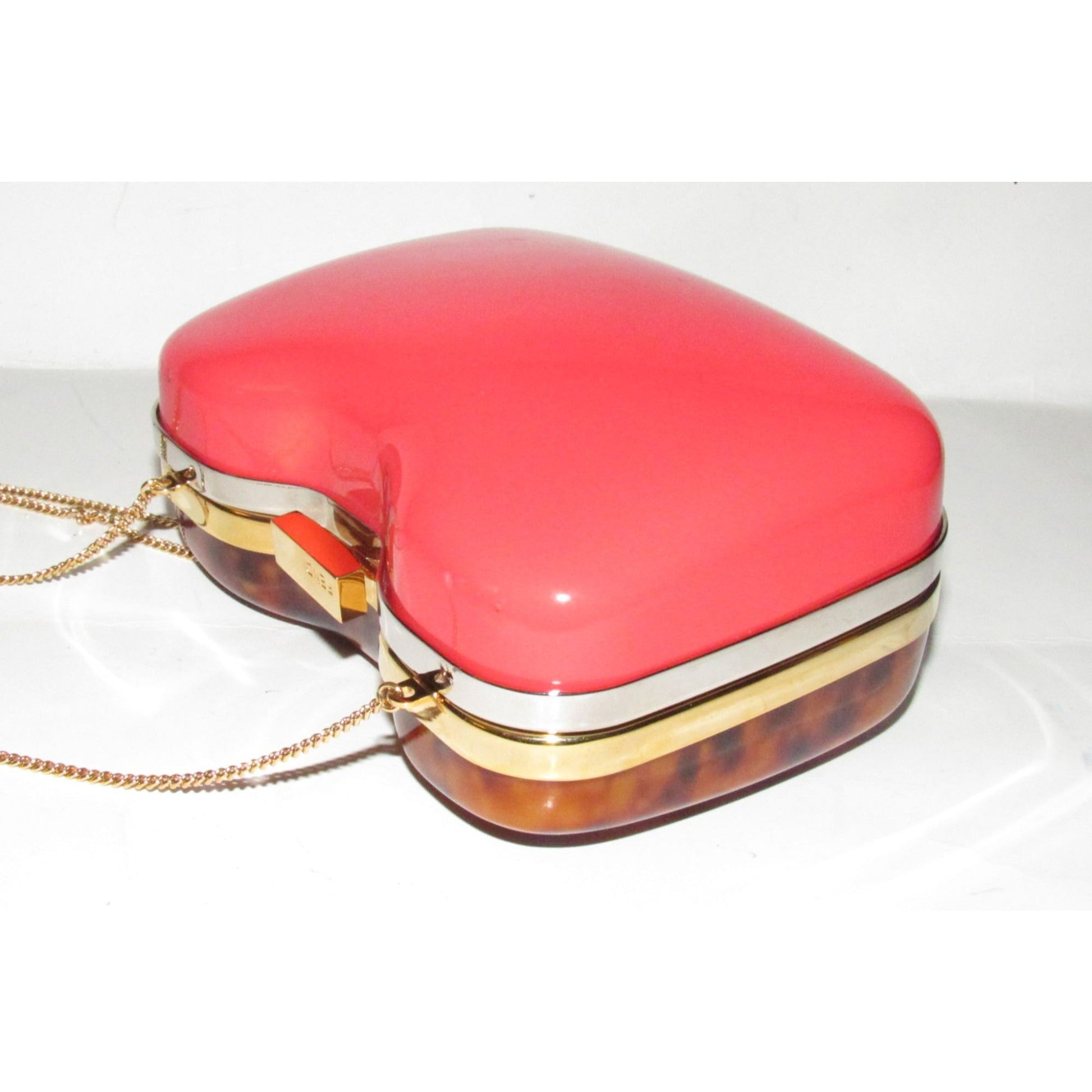 Retro, Fendi two way- clutch or cross body/shoulder clam shell style purse made of red & tortoise shell Lucite with a gold chain strap