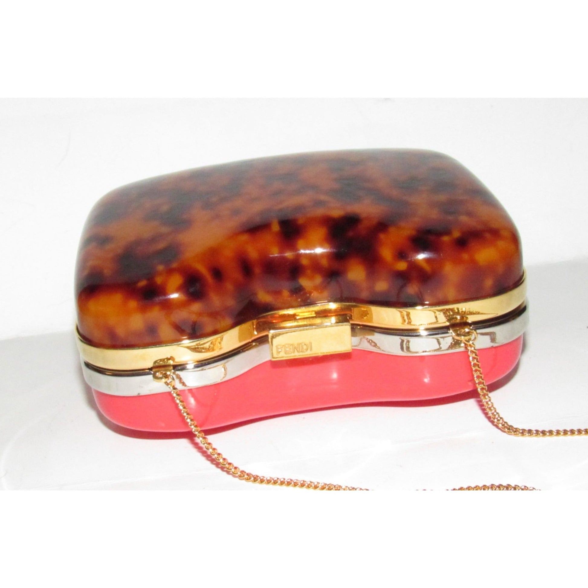 The purse has a very geometric Art Deco style design. It is made of two, hard, smooth Lucite sides, one in red, one in a tortoise shell and both framed in gold. Together, they make a clamshell style purse with a gold, push button latch top closure. engraved FENDI. It has a collapsible gold chain strap, too.
