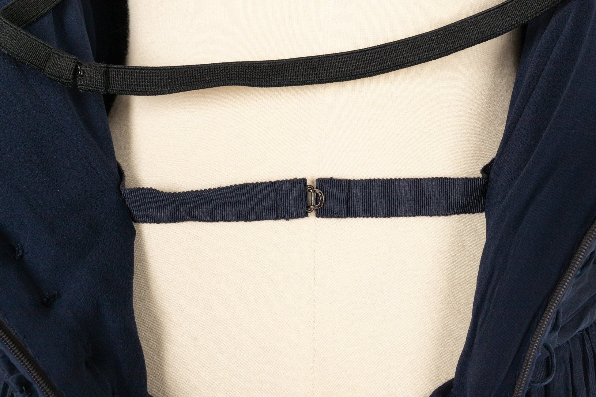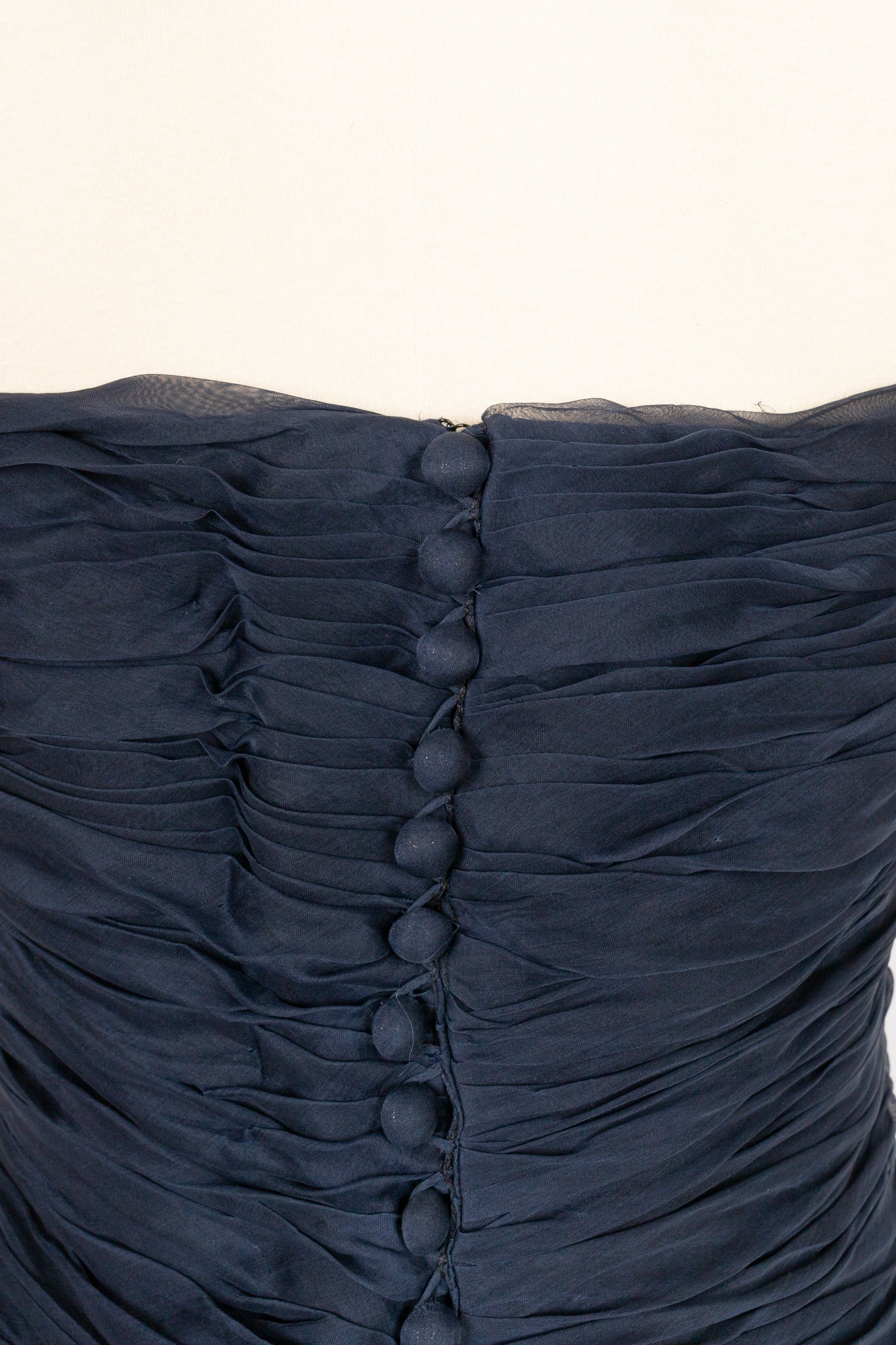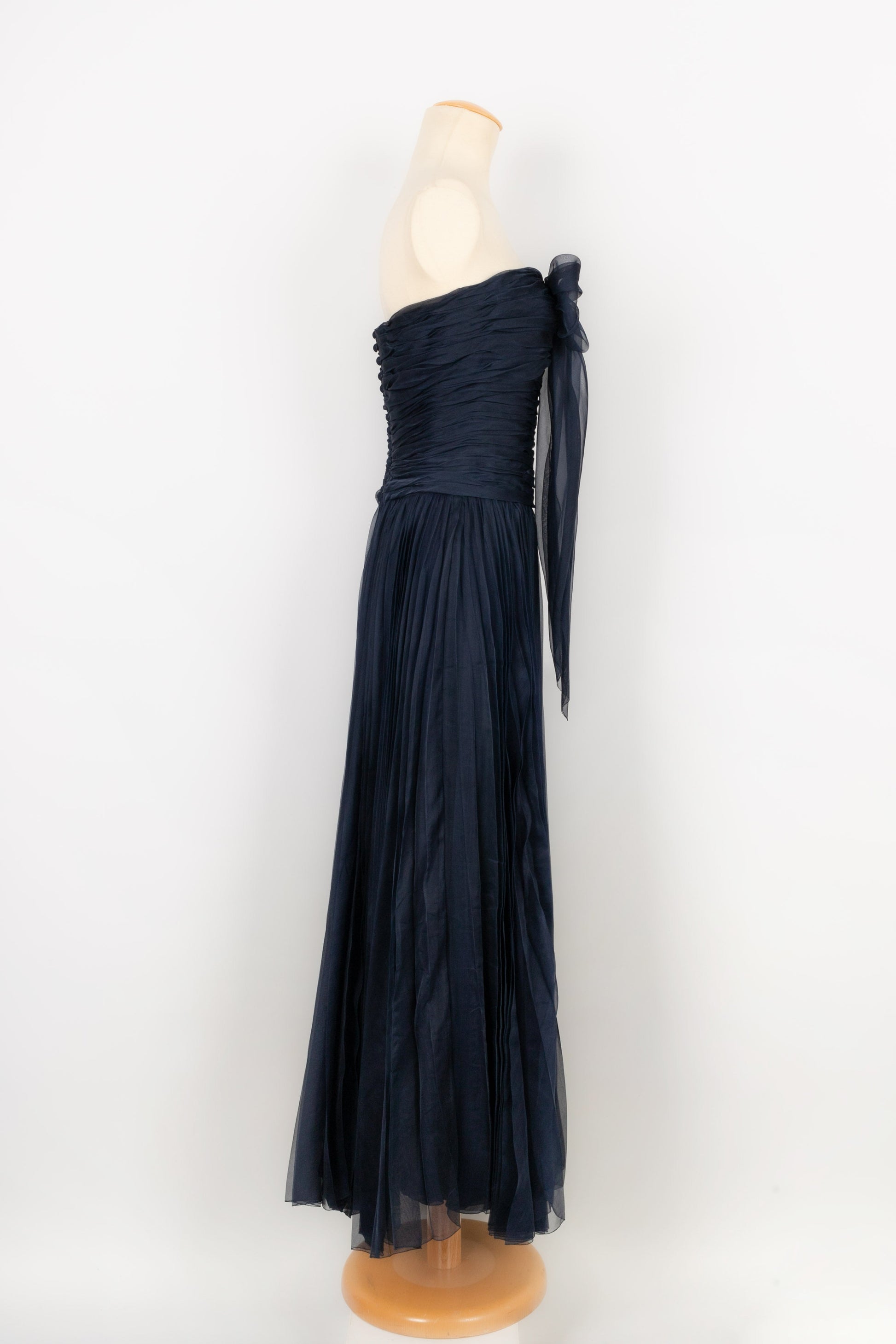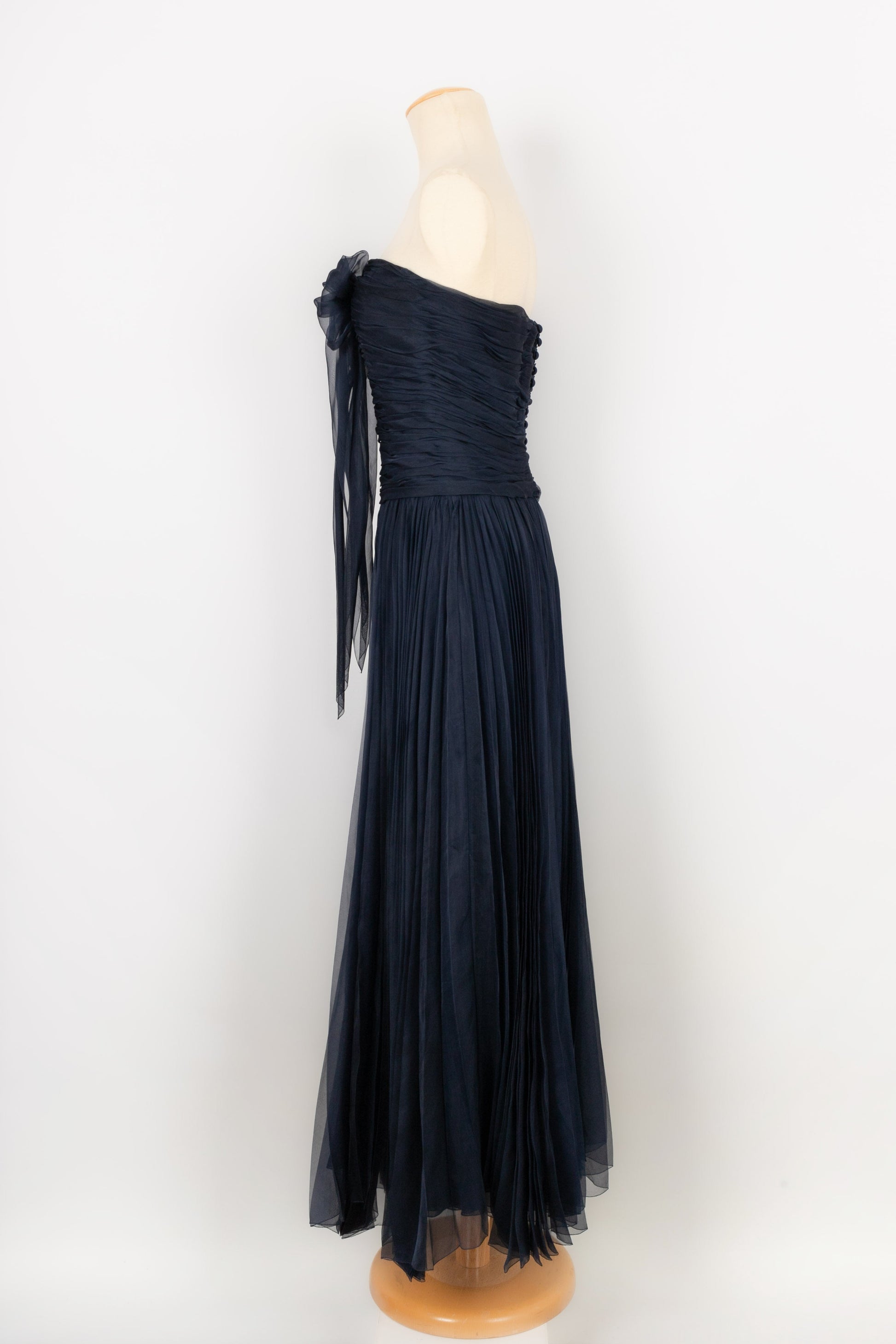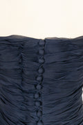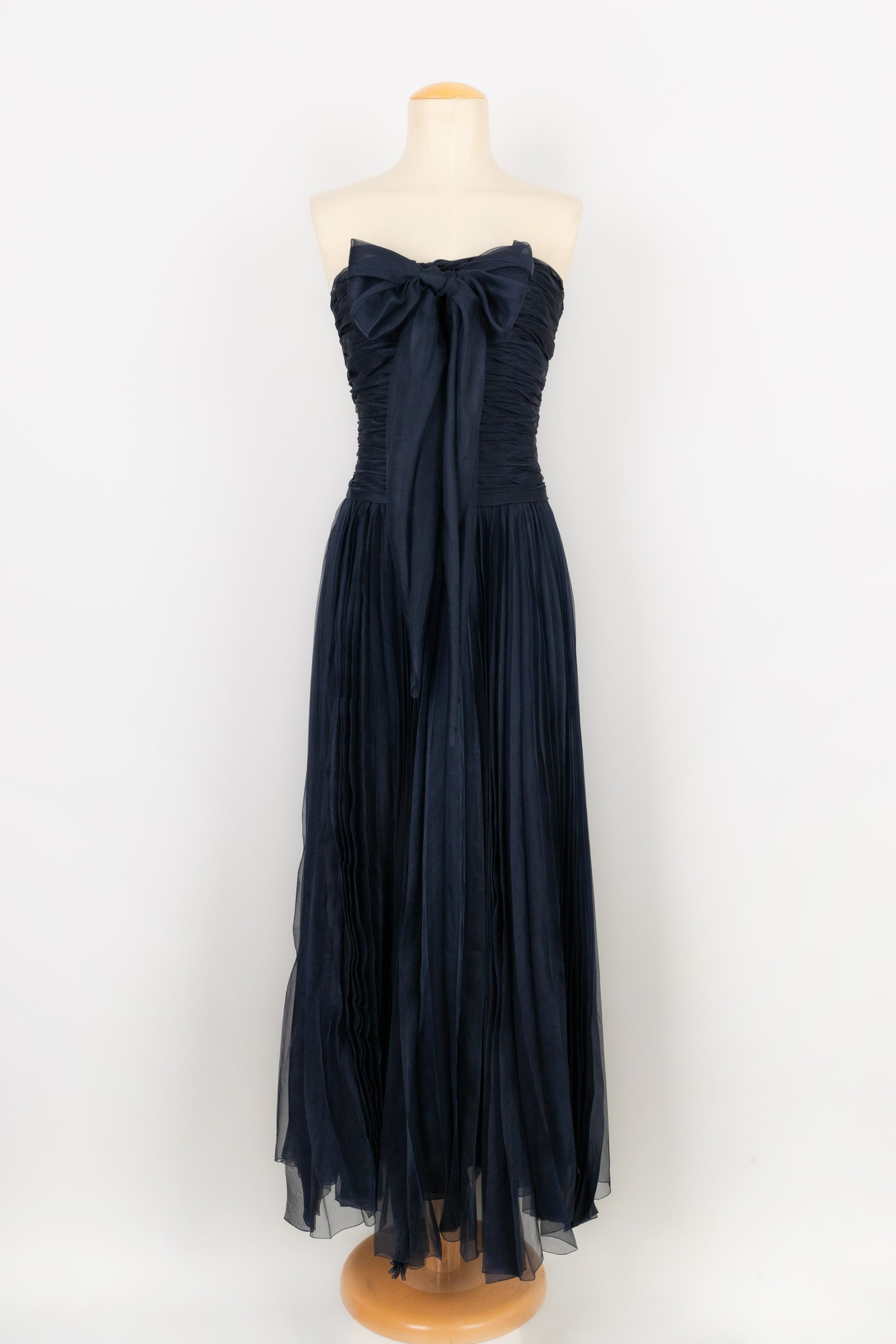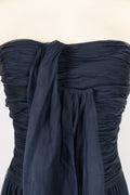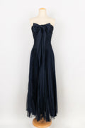 CHANEL - Longue robe bustier en taffetas de soie pliss� bleu nuit. Aucune �tiquette de taille ou de composition, elle convient � un 38FR.