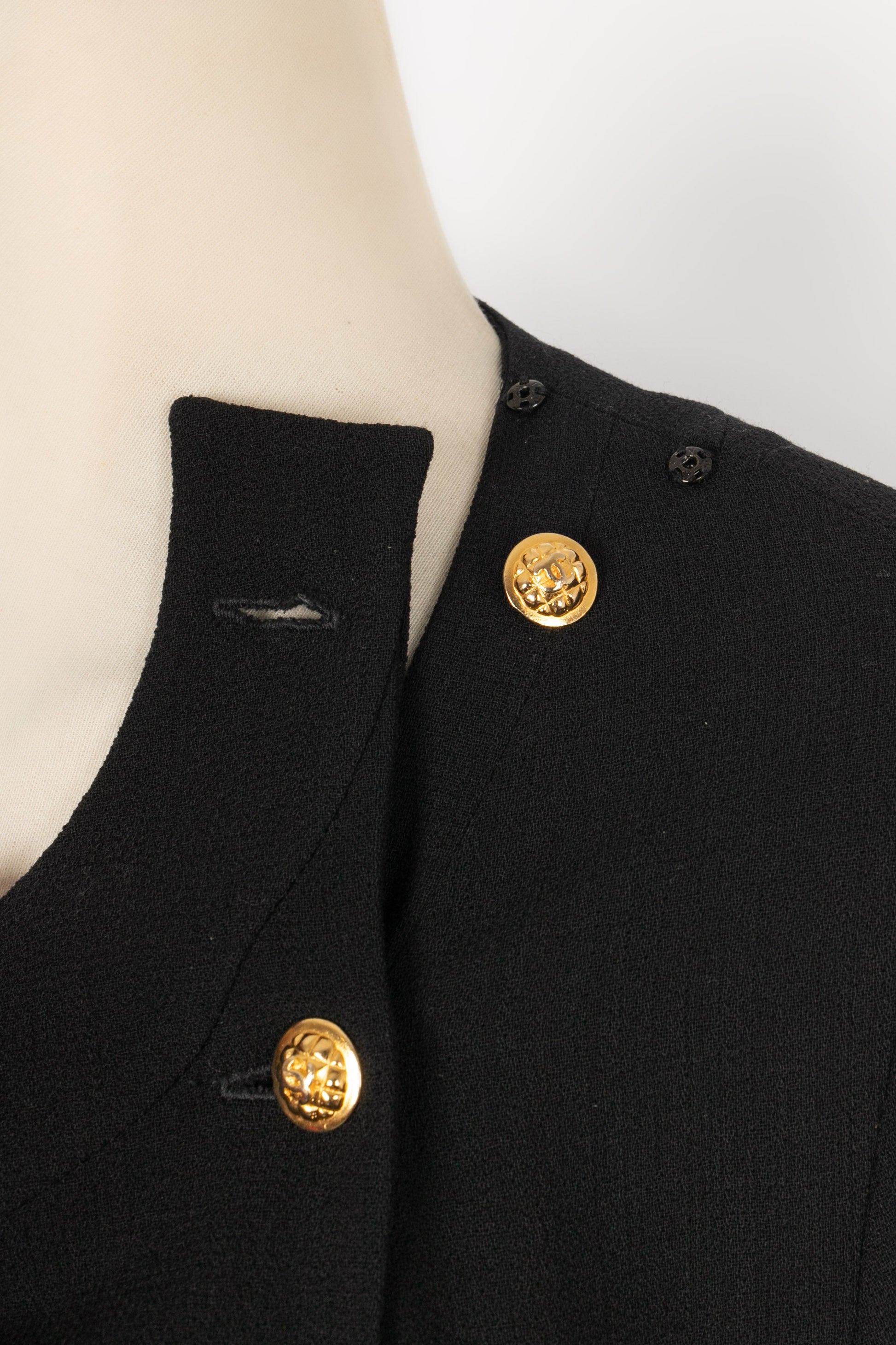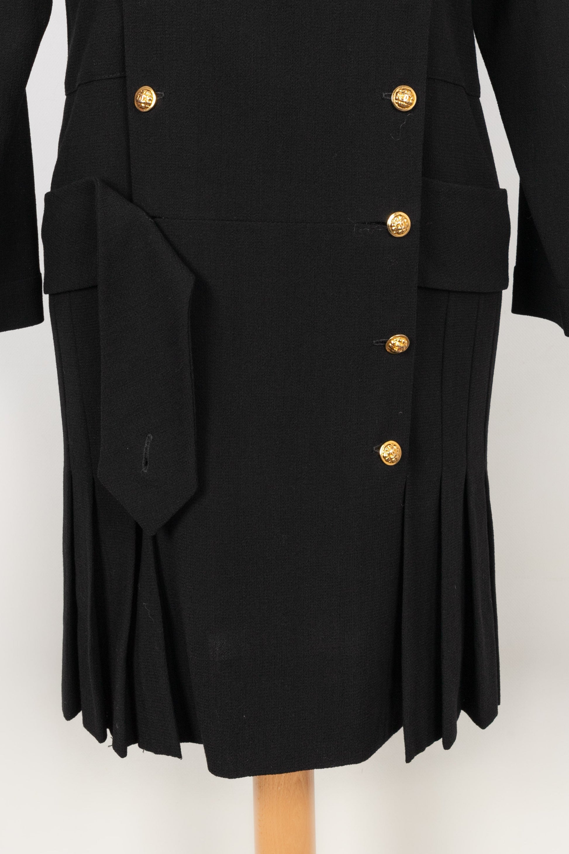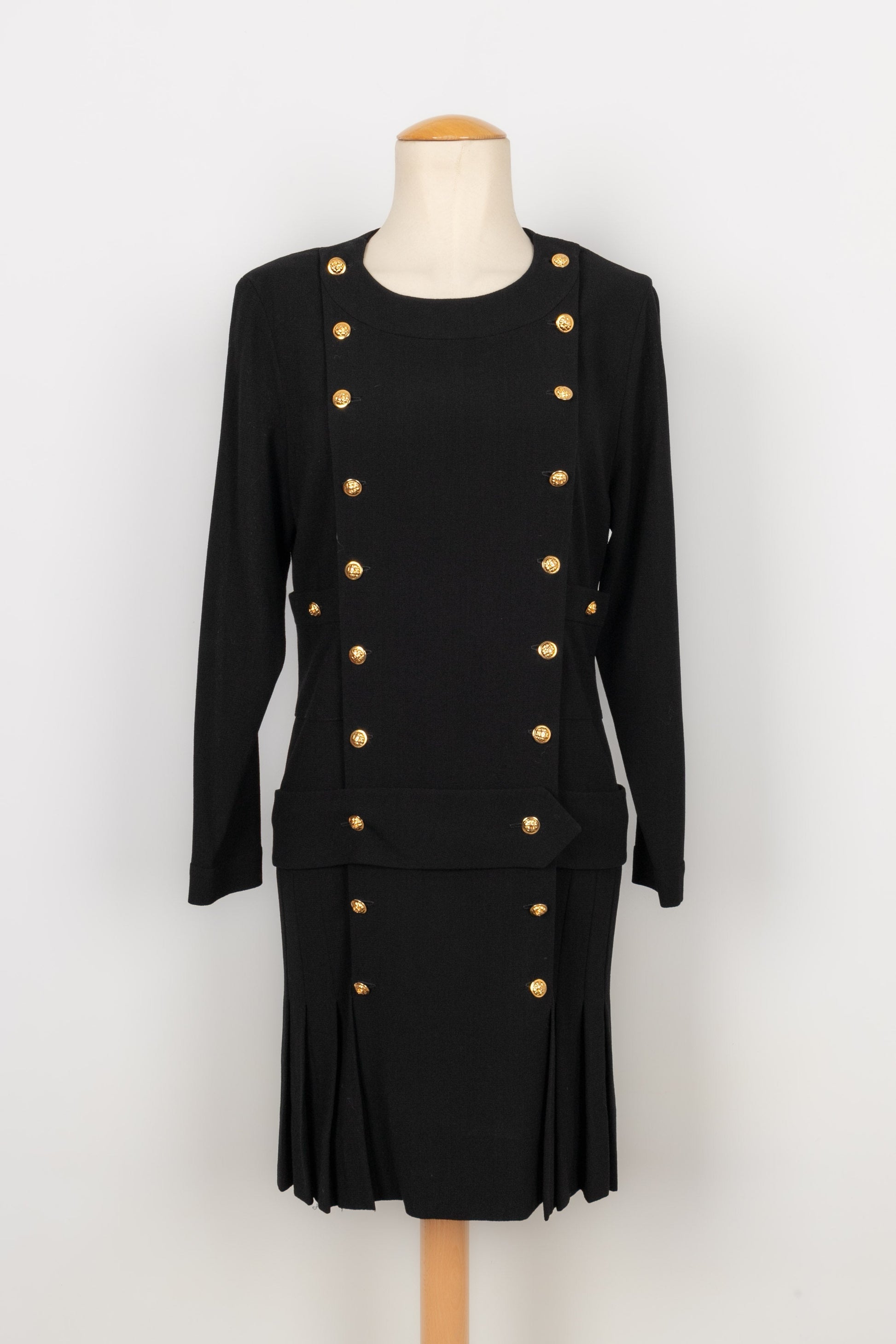 CHANEL - Robe noire � manches longues, agr�ment�e de boutons en m�tal dor�. Pas de taille indiqu�e, elle convient � un 38FR. Pi�ce datant de la fin des ann�es 1980.