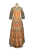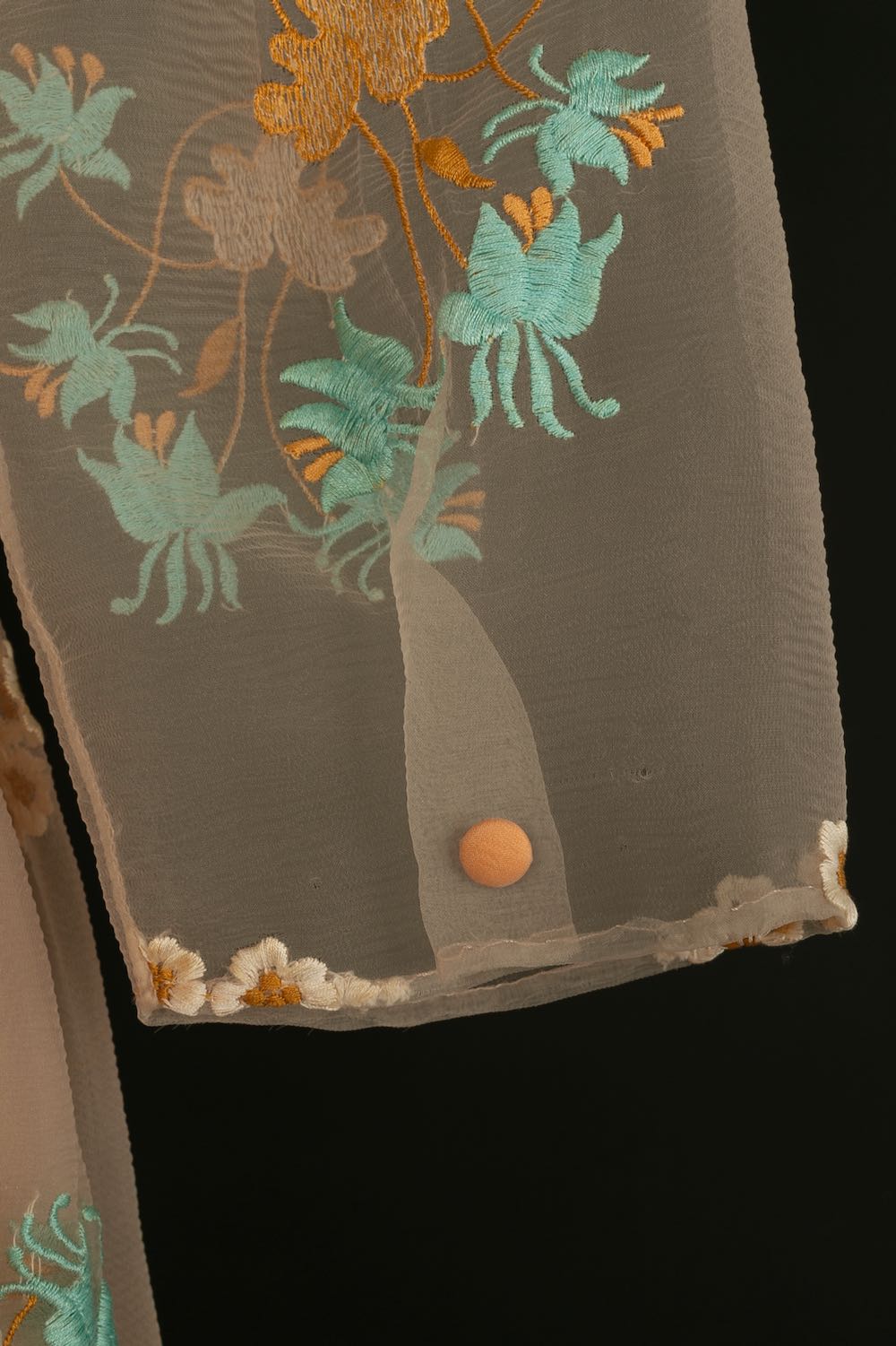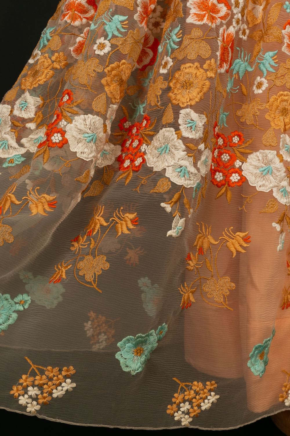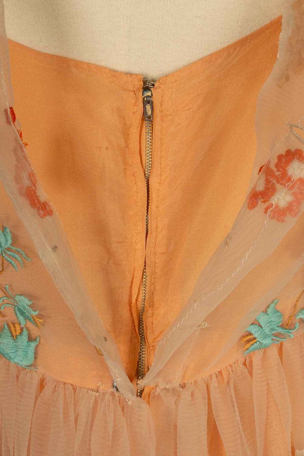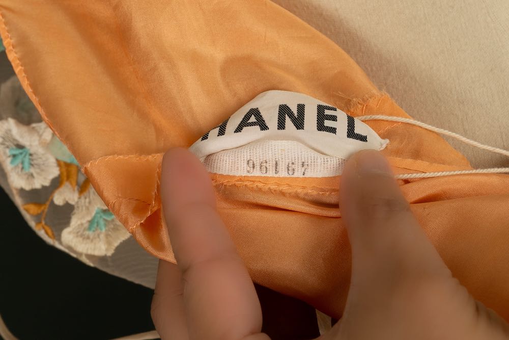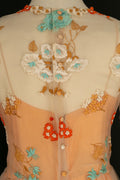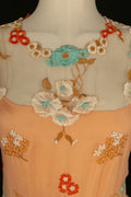 CHANEL - Robe en soie et organdi brod� de fleurs dans les tons de orange. Aucune �tiquette de taille ou de composition, elle convient � un 36FR. Collection Haute Couture Printemps-Et� 1972.