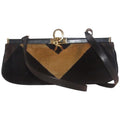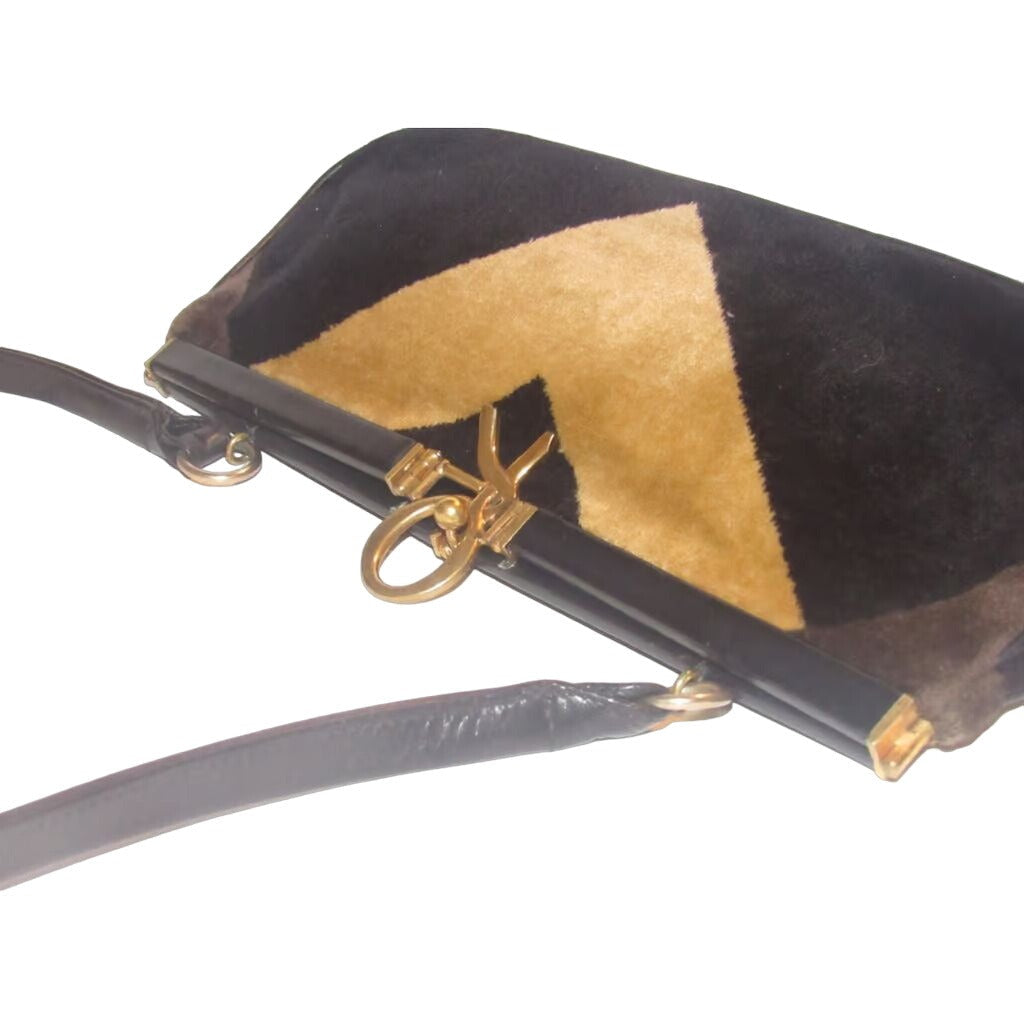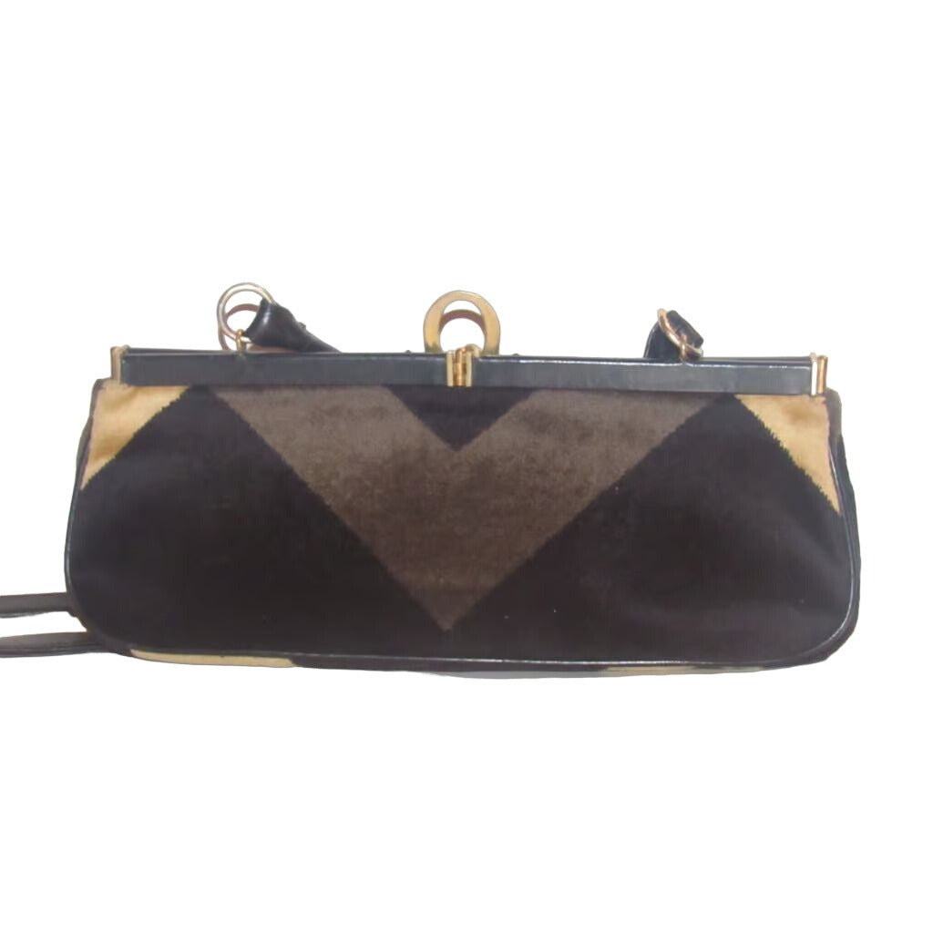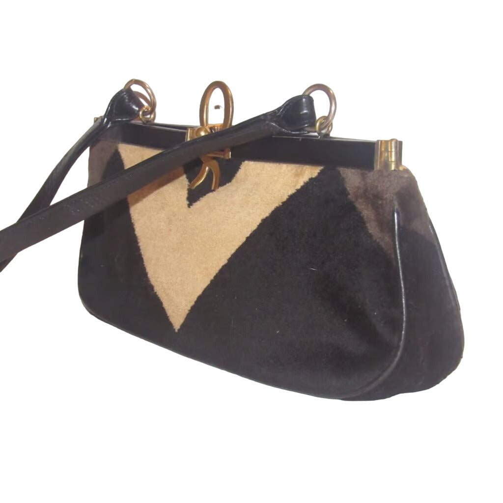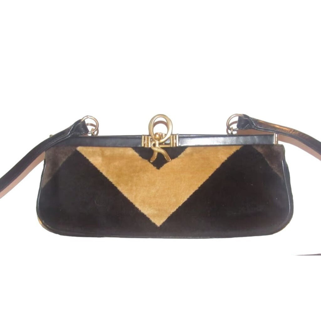 For sale is an AMAZING, vintage, Roberta di Camerino, RARE, hinged top, two-way- hand held satchel clutch or shoulder/cross body style purse made of velvet and black leather with a geometric design in shades of brown, removable strap and a bold gold 'R' at the closure! This vintage piece from Roberta di Camerino is gorgeous and is in beautiful condition!