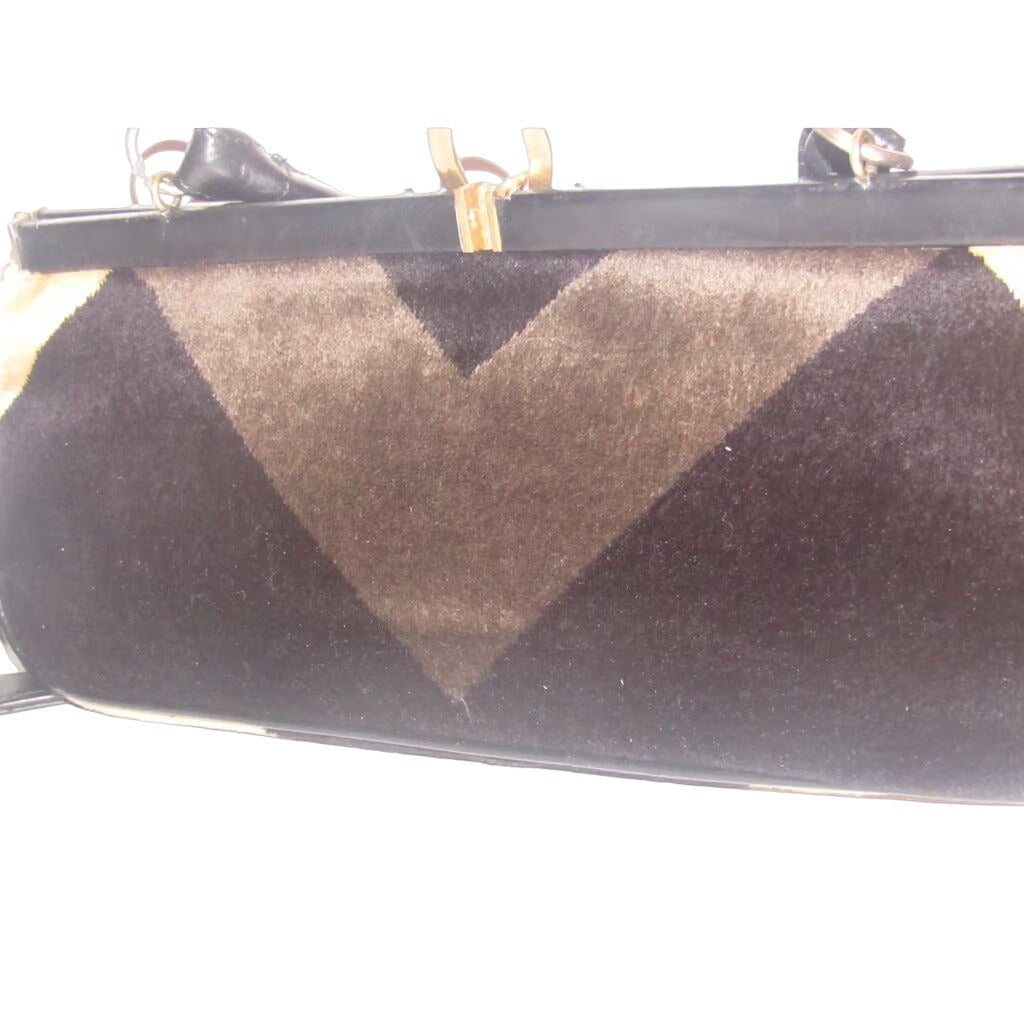 The bag is a rare, medium, two-way style, hand held satchel or shoulder bag/cross body style purse in a geometric design in rich shades of brown velvet by Roberta di Camerino! The purse is probably from the mid 20th century. It has a long strap that detaches and has a hinged back that allows you to open it and snap top closure with a bold gold 'R'. This is the designer purse that is perfect for when you want that edgy, one of a kind, vintage piece to accent your outfit!