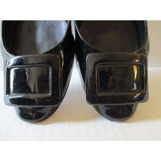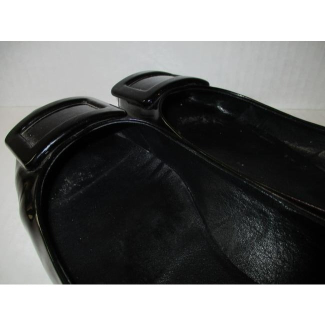 Gorgeous ballerina flats in glossy dark jade green patent finish leather upper with iconic 1-3/4 inch x 2-1/2 inch buckle. Comfort and style make these perfect for everyday wear - or, dress. Made in Italy. Size 9HB/39-1/2. Original box. All measurements are approximate.