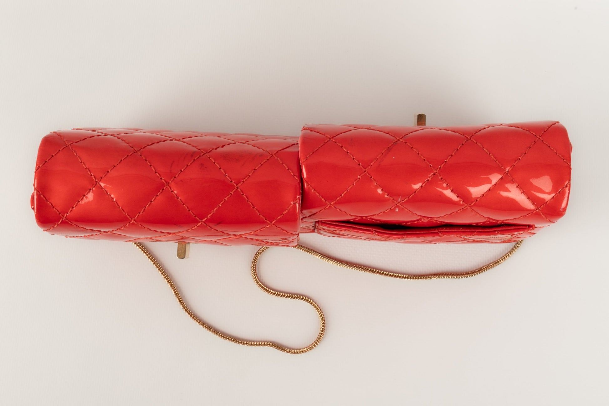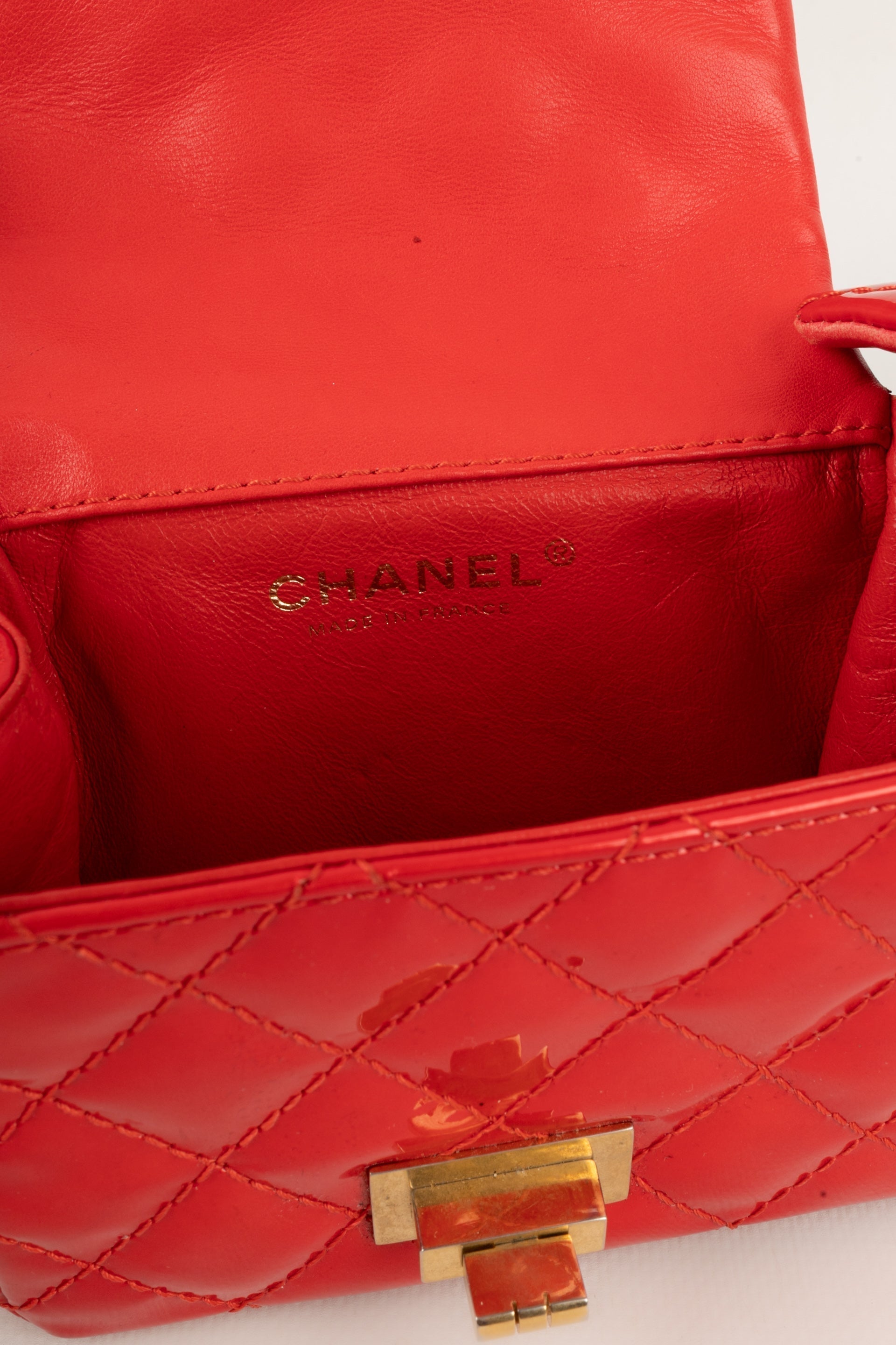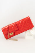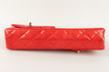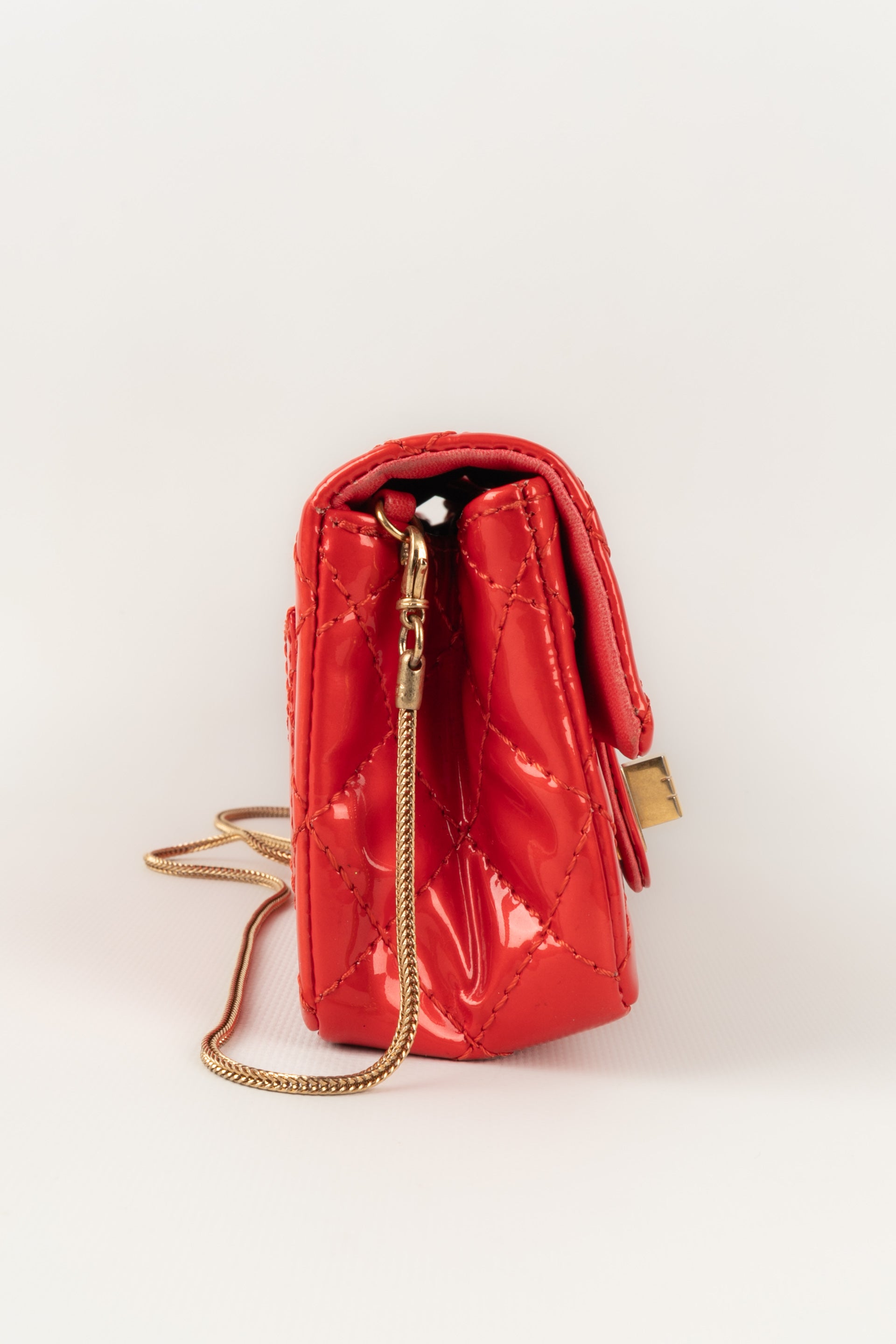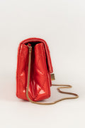 CHANEL - (Made in France) Sac baguette double poches en cuir verni rouge et attributs en métal doré. Numéro de série présent. Collection 2008/2009.