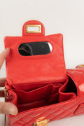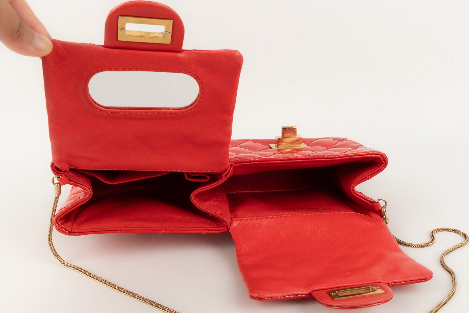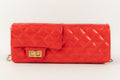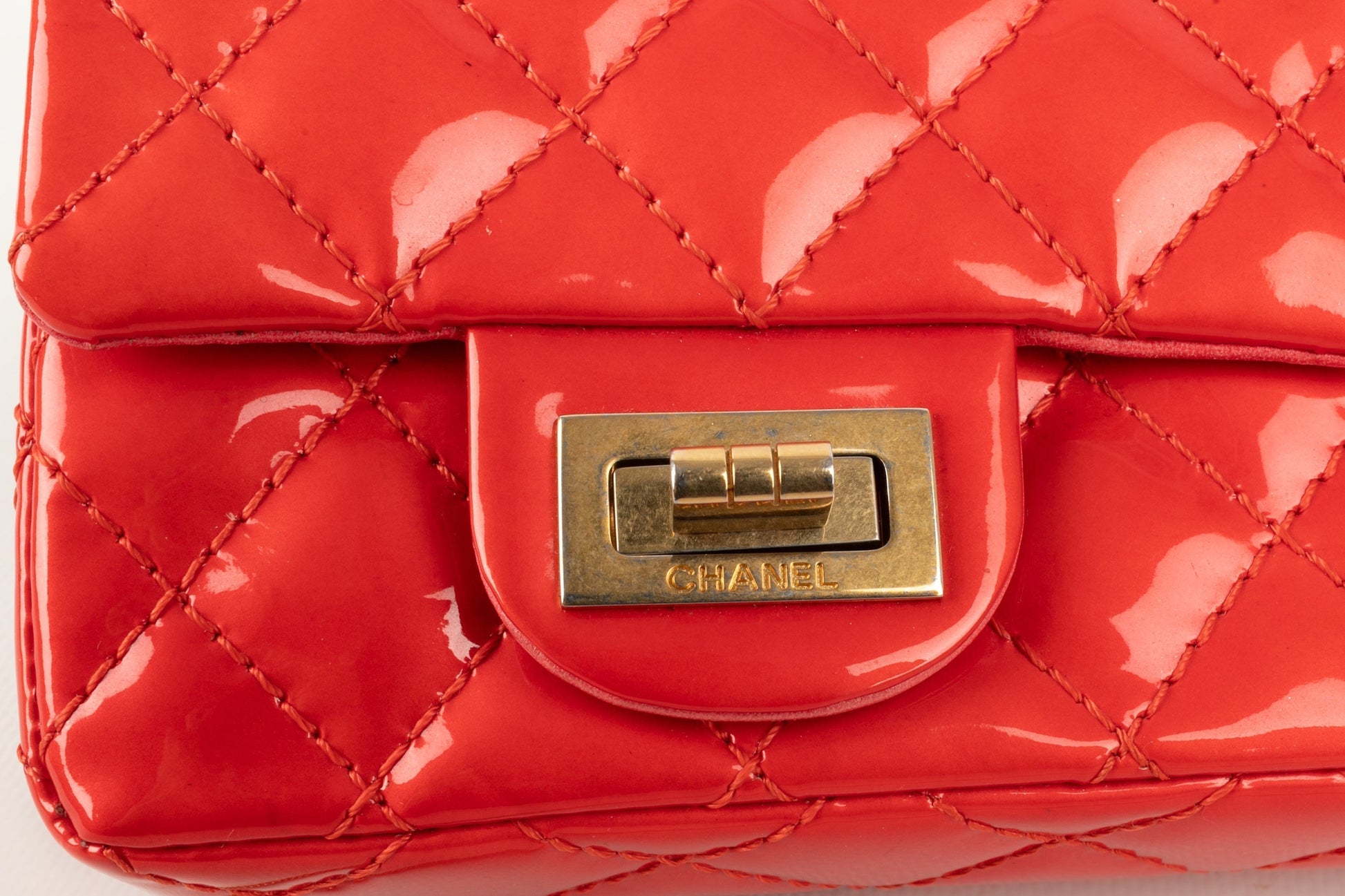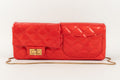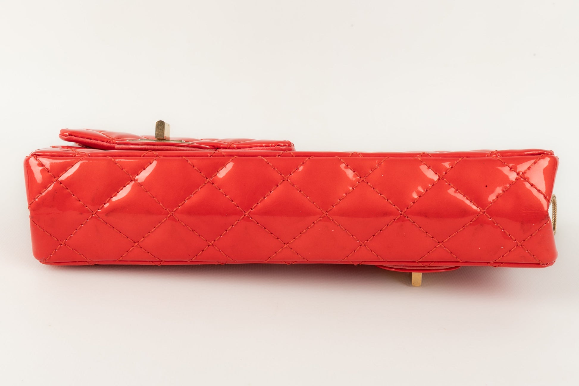 CHANEL - (Made in France) Sac baguette double poches en cuir verni rouge et attributs en métal doré. Numéro de série présent. Collection 2008/2009.
