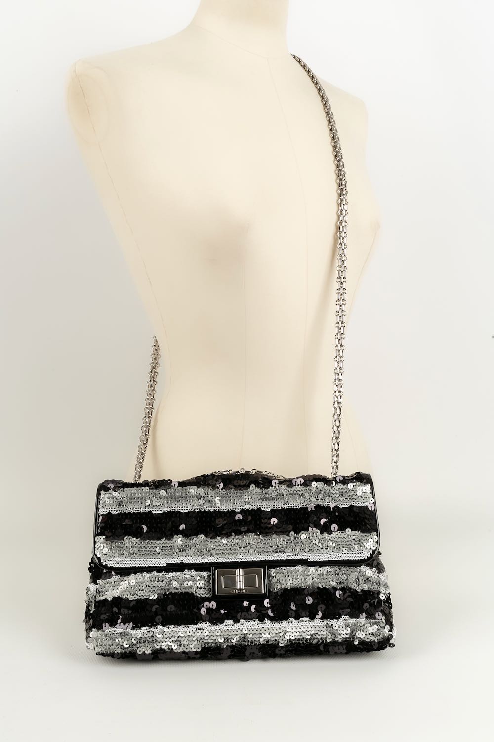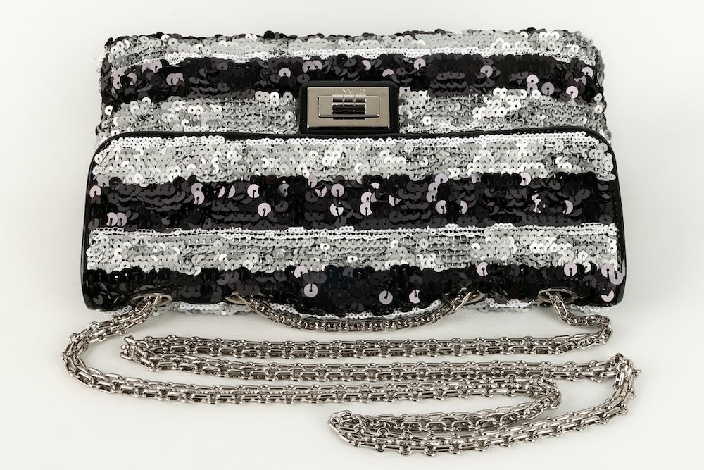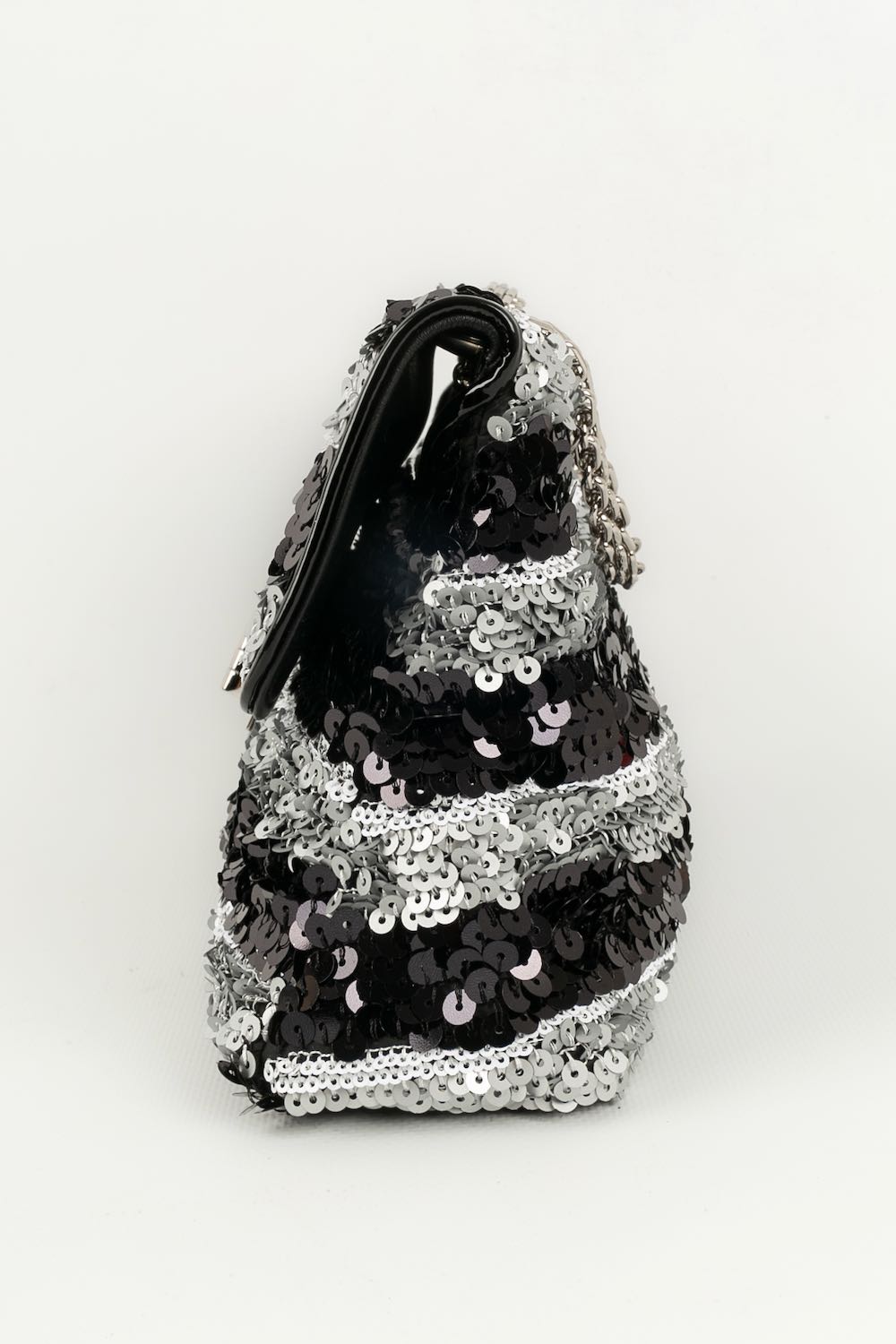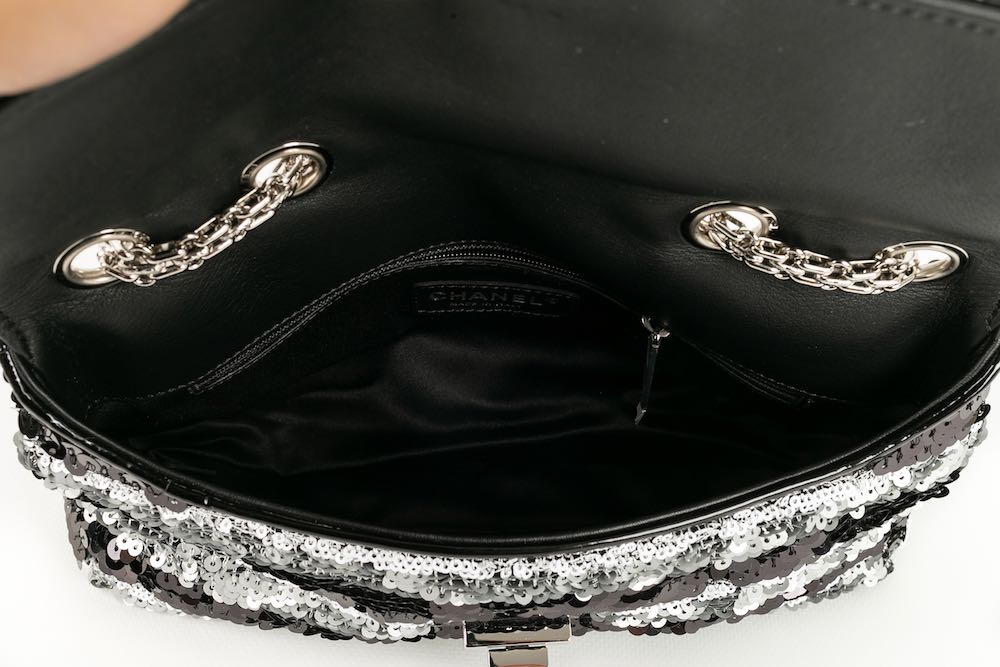 CHANEL - (Made in Italy) Sac � paillettes noires et argent�es et attributs en m�tal argent�. Num�ro de s�rie pr�sent. Collection 2011.
