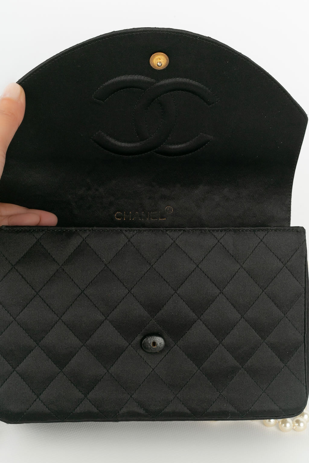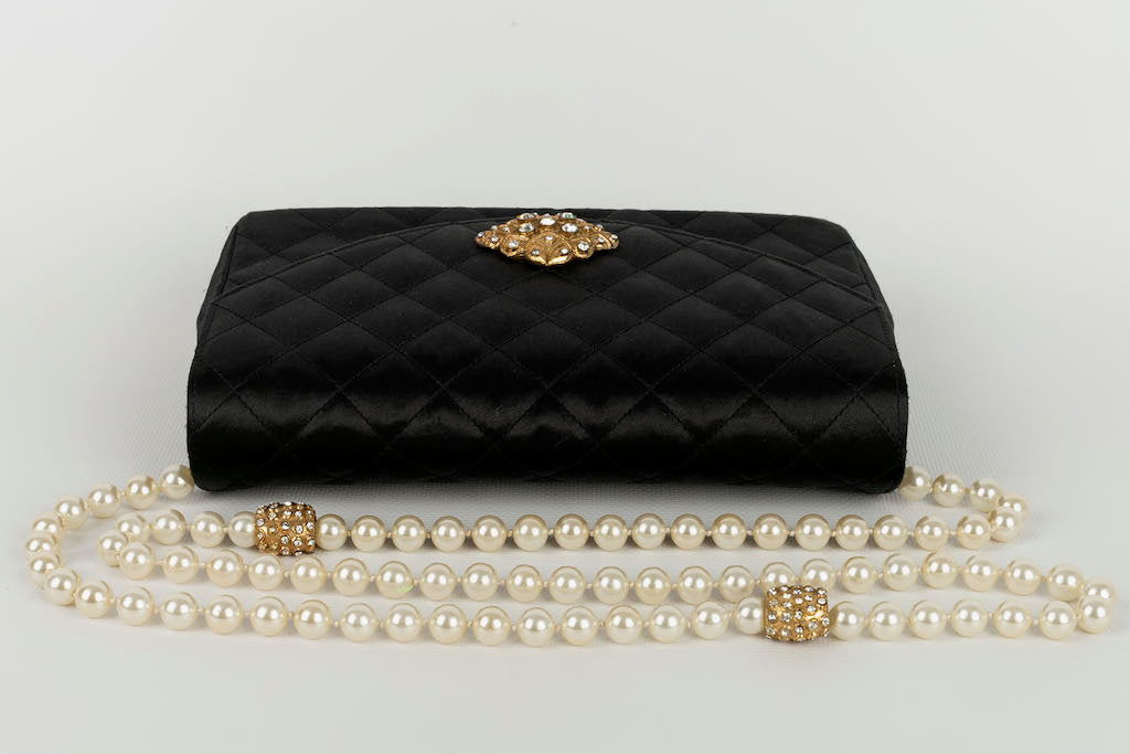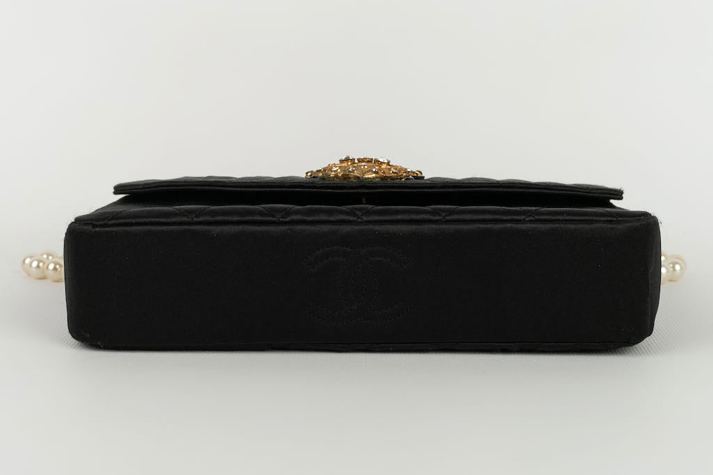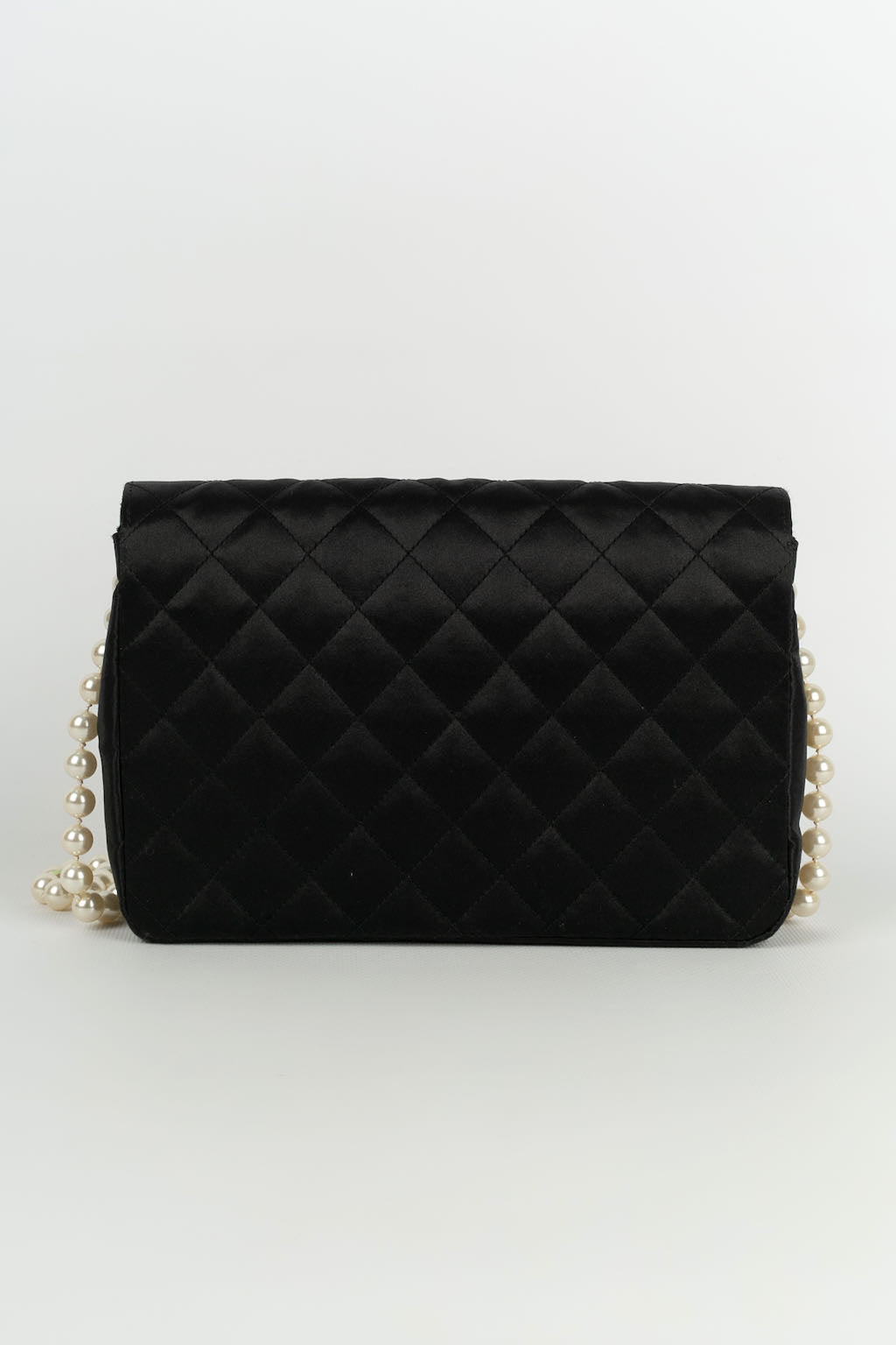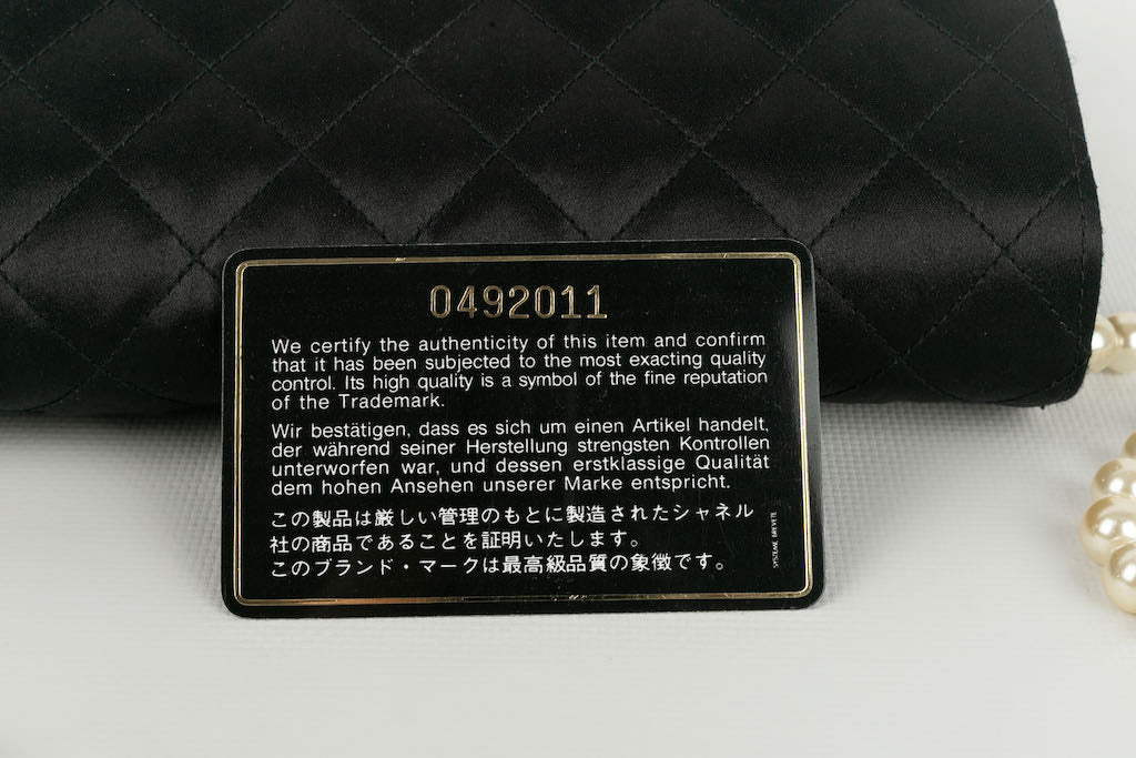 CHANEL -Sac du soir en satin matelass� et fermoir bijou. L'anse est faite de perles nacr�es et d'�l�ments strass�s. Num�ro de s�rie et carte d'it� pr�sents. Collection Automne-Hiver 1987/1988. A signaler, rares marques sur le satin.