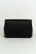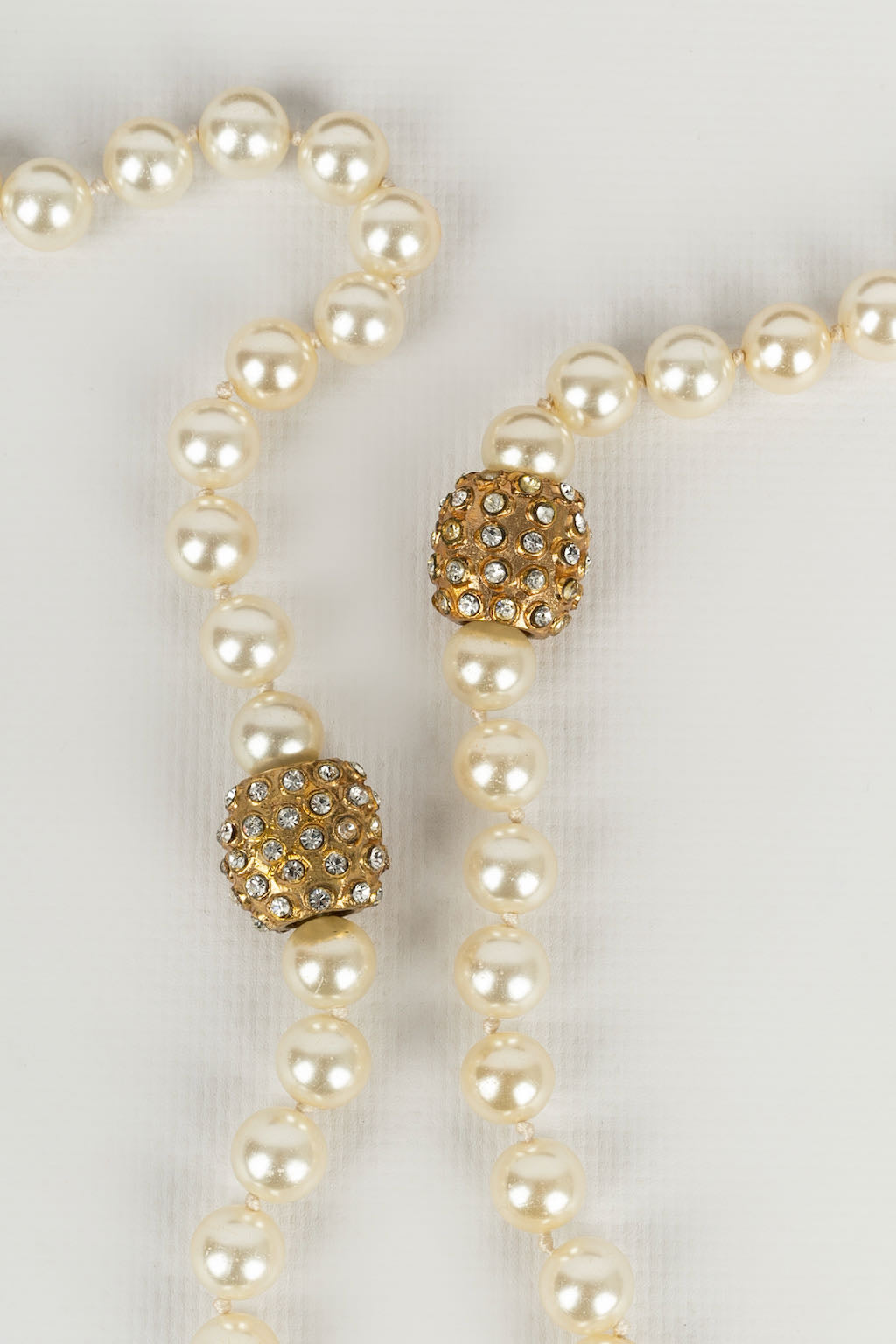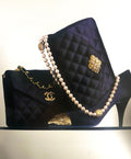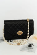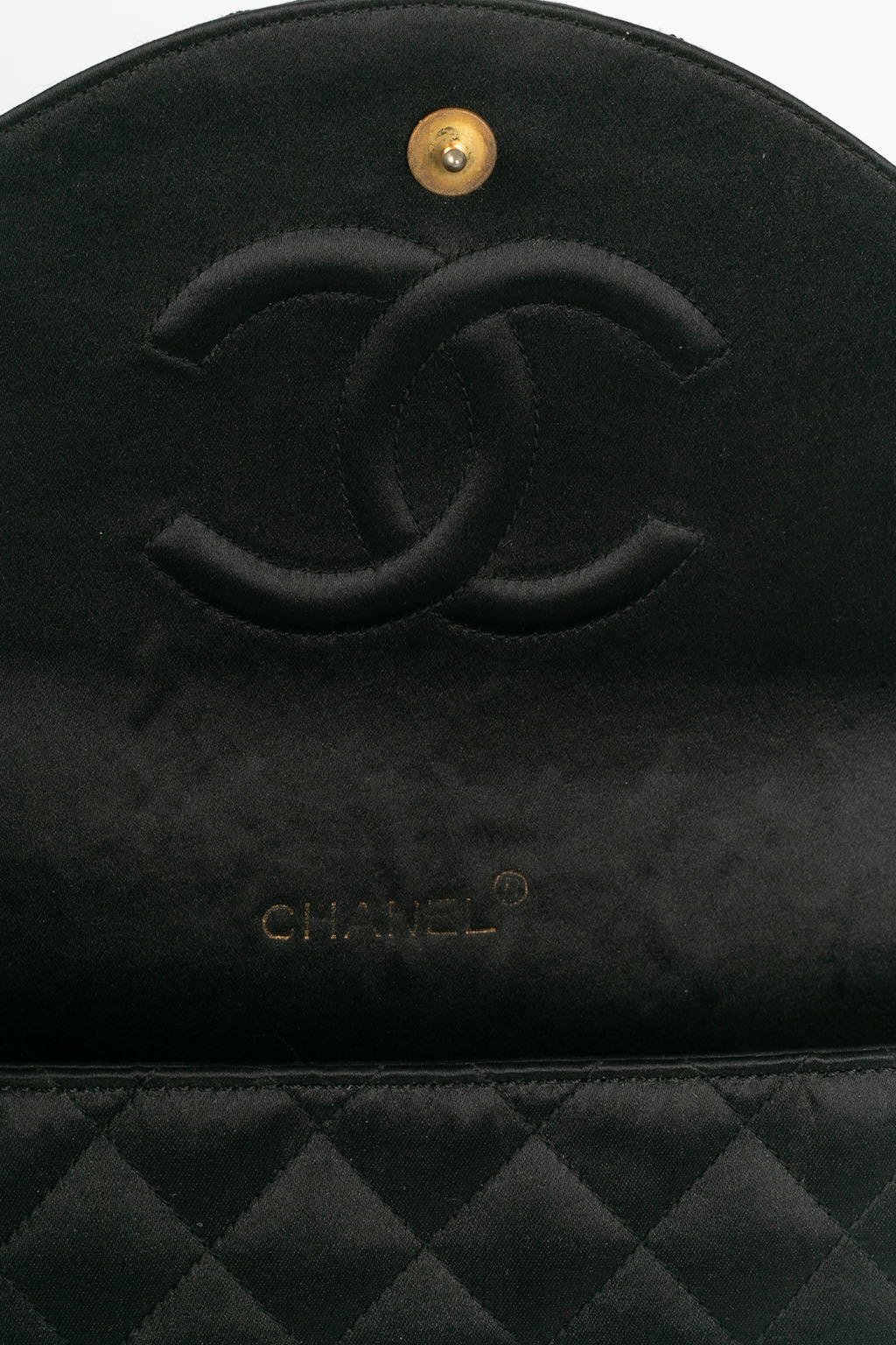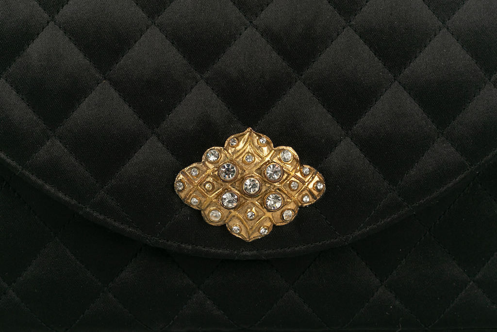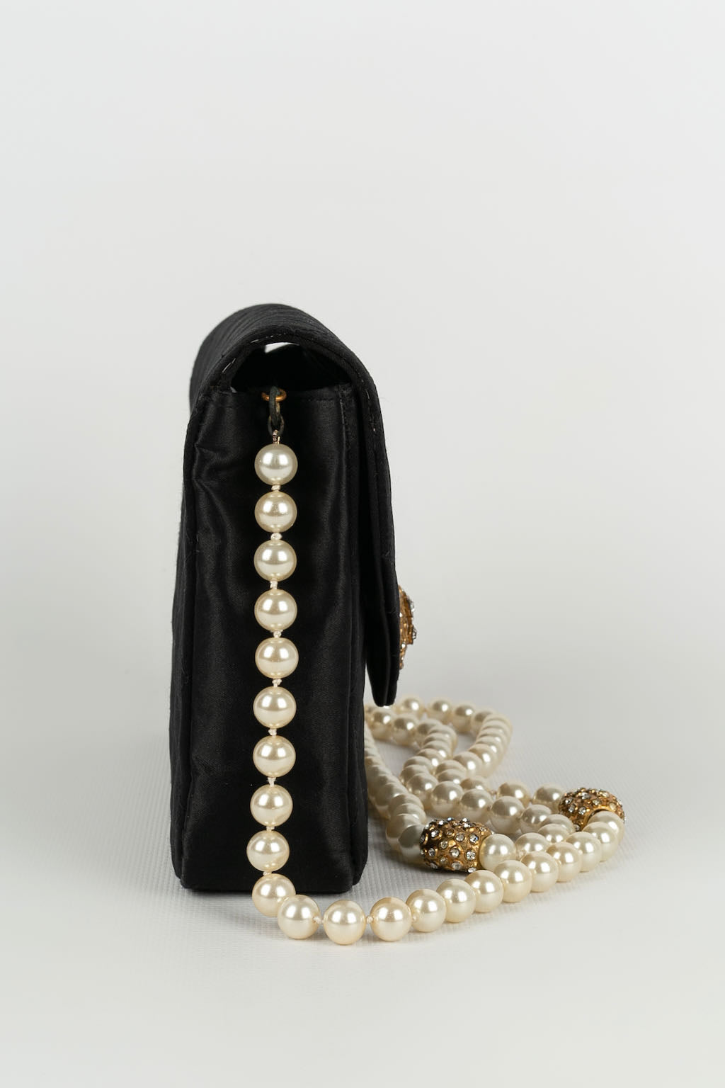 CHANEL -Sac du soir en satin matelass� et fermoir bijou. L'anse est faite de perles nacr�es et d'�l�ments strass�s. Num�ro de s�rie et carte d'it� pr�sents. Collection Automne-Hiver 1987/1988. A signaler, rares marques sur le satin.