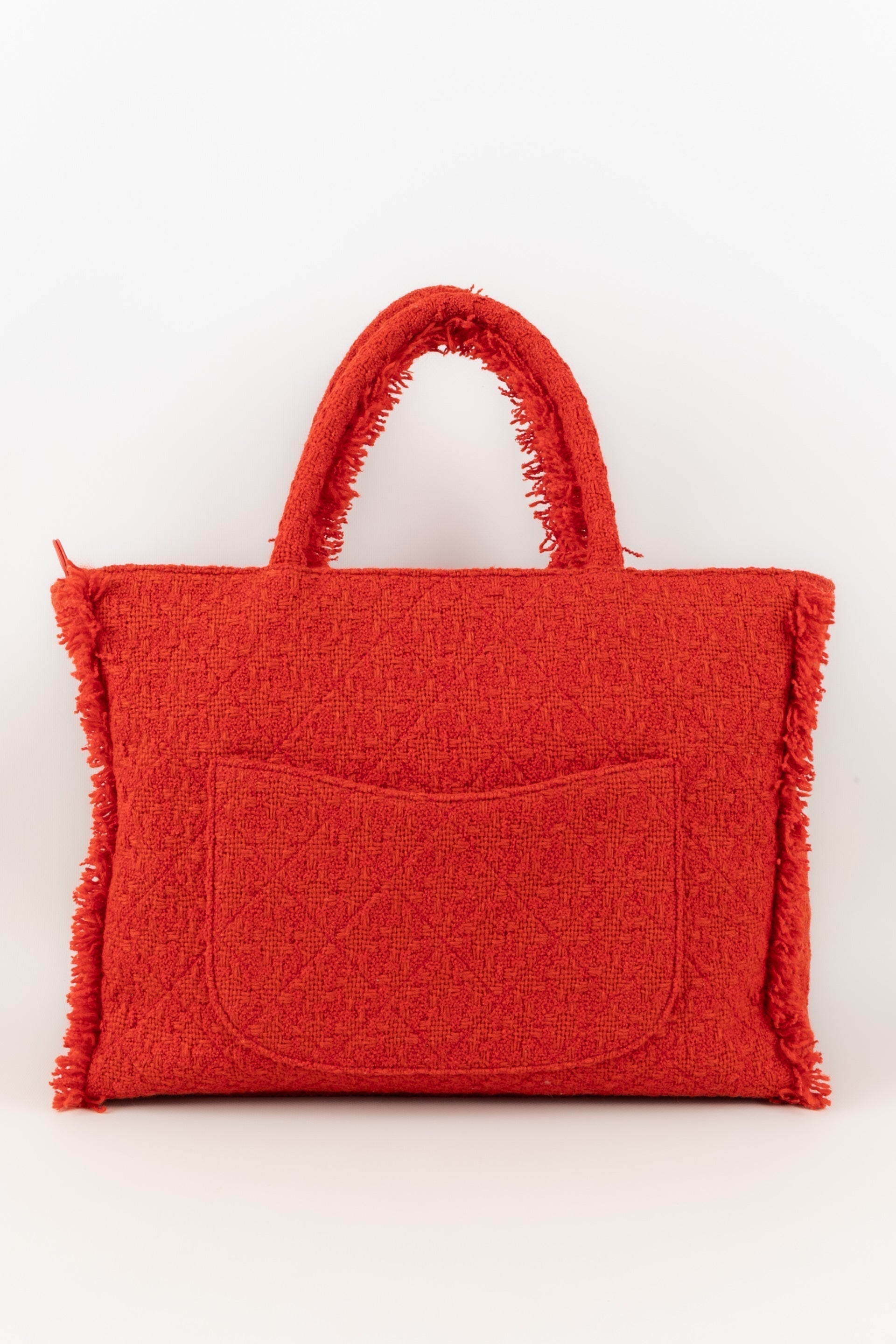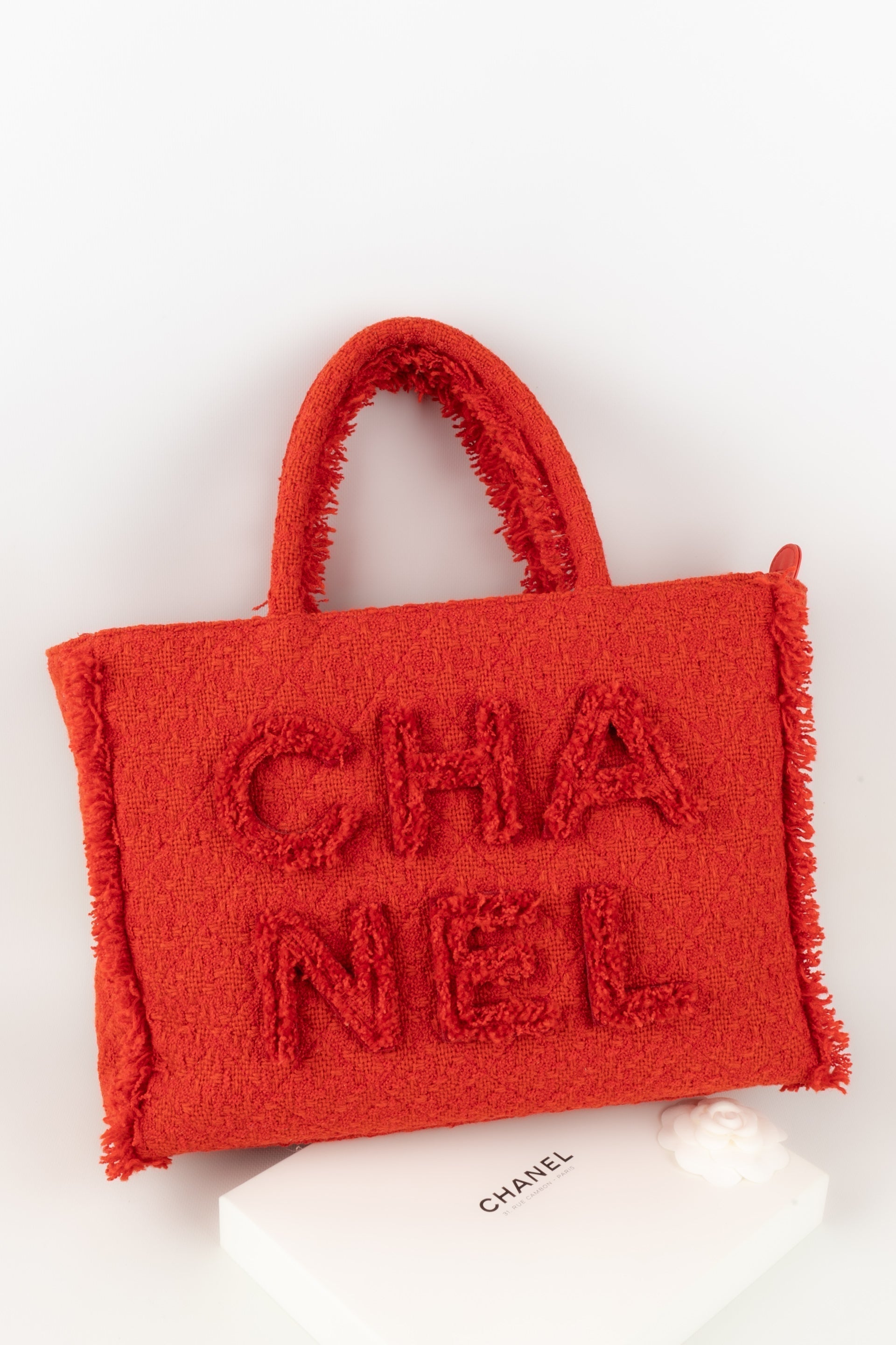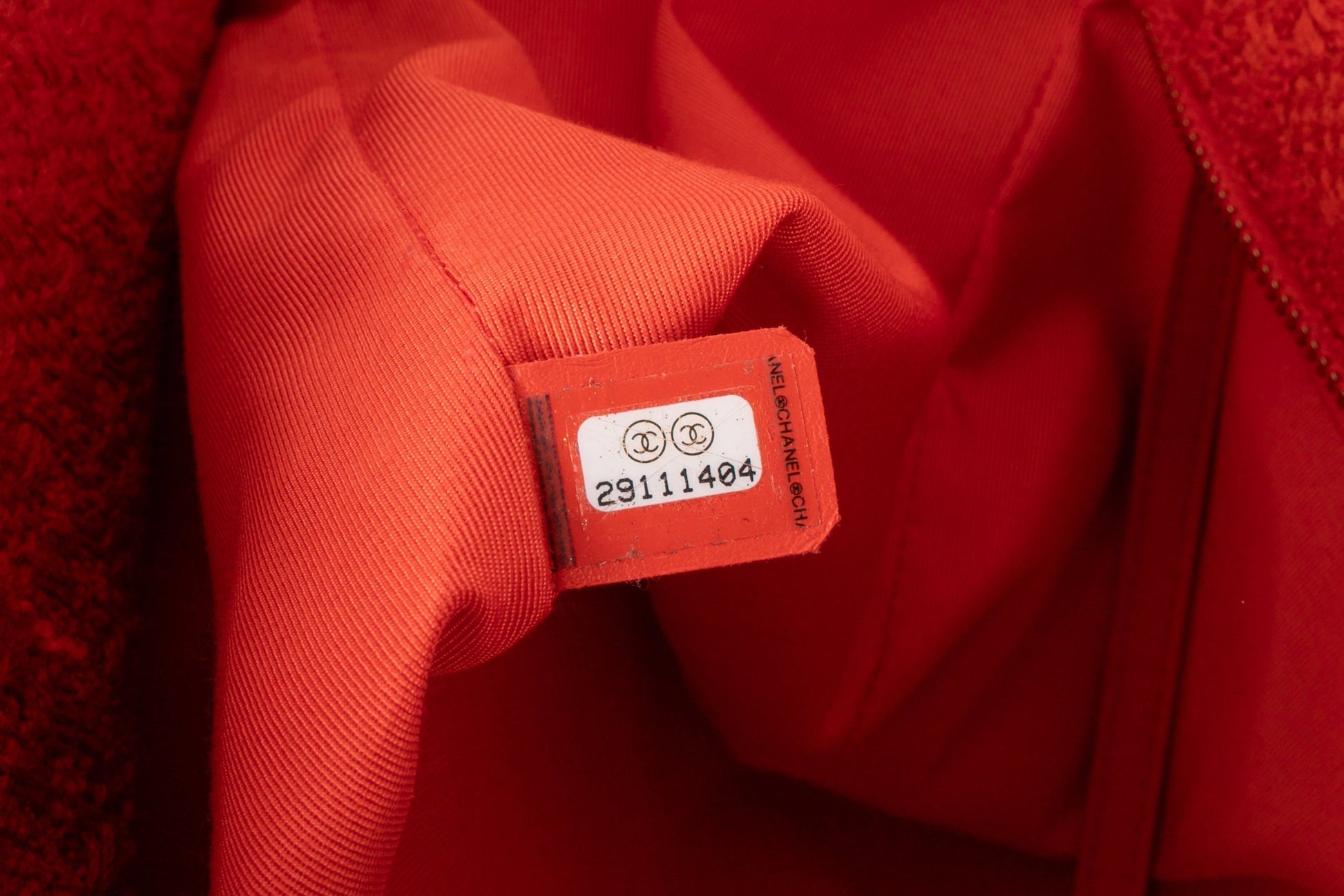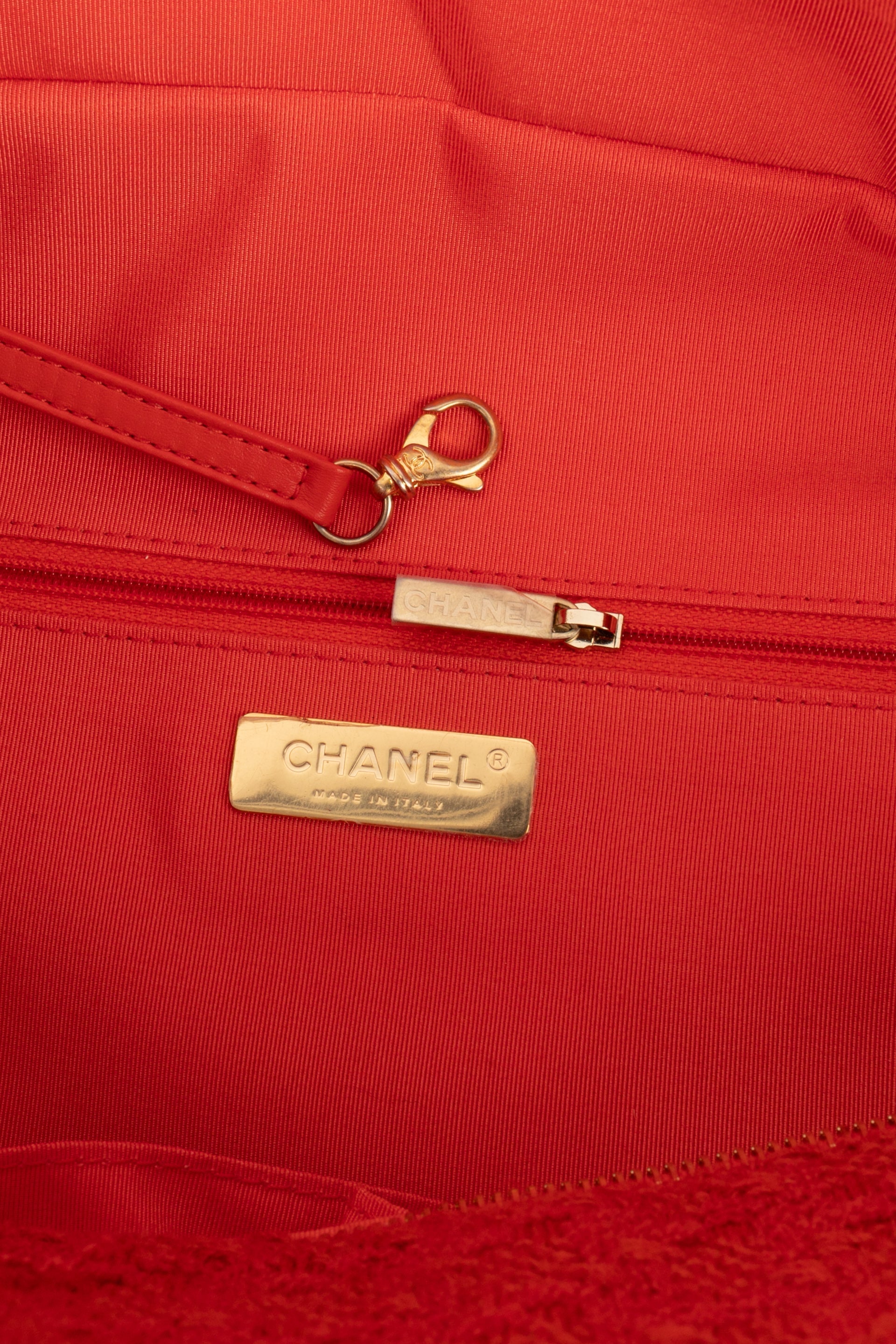 CHANEL -(Made in Italy) Sac cabas en tweed rouge, attributs en métal doré. Numéro de série présent et carte d'ité présents. Collection 2019.