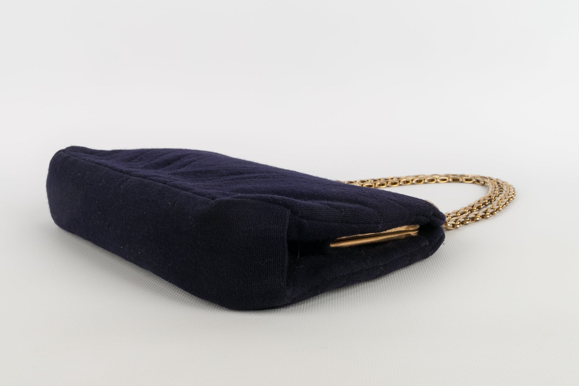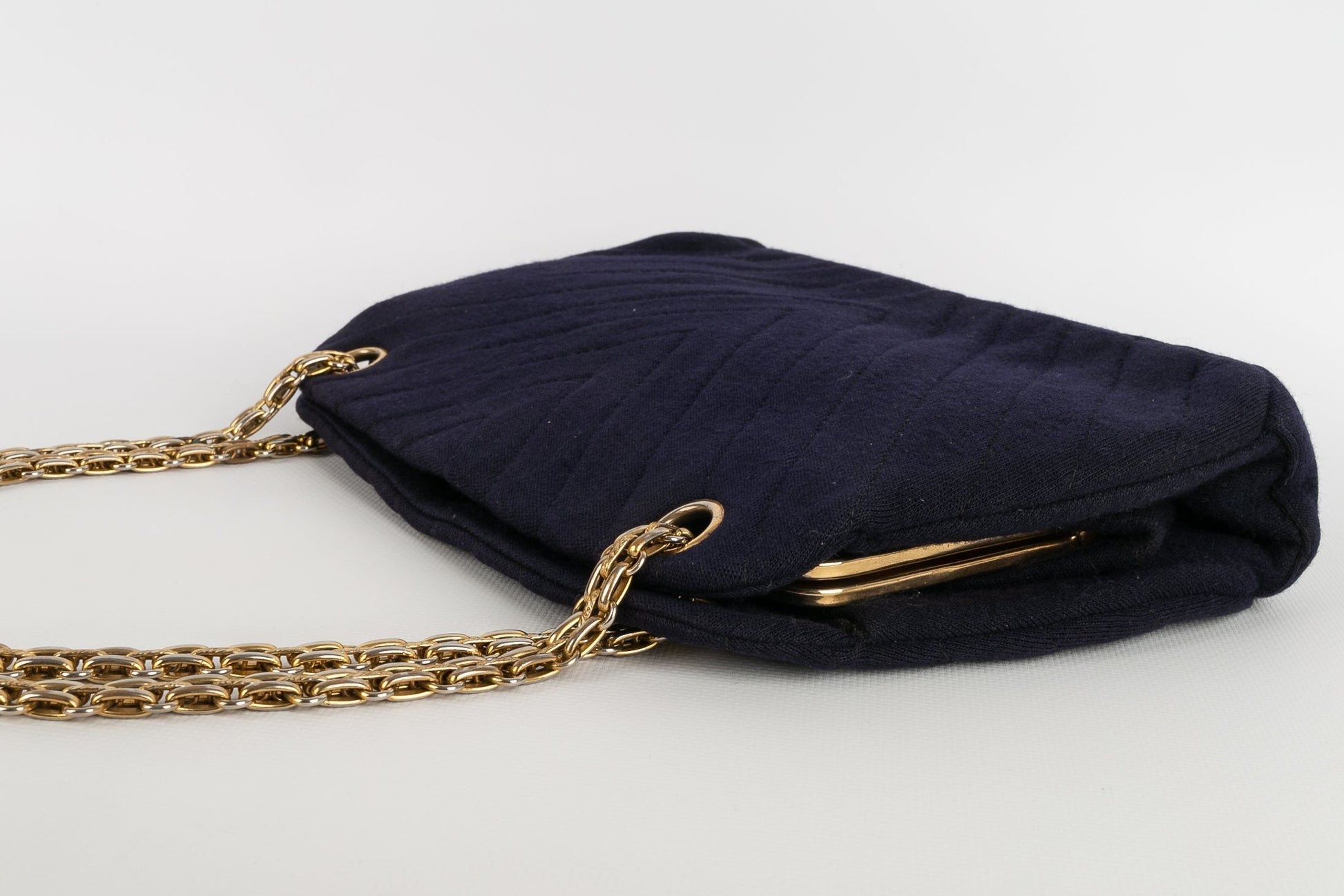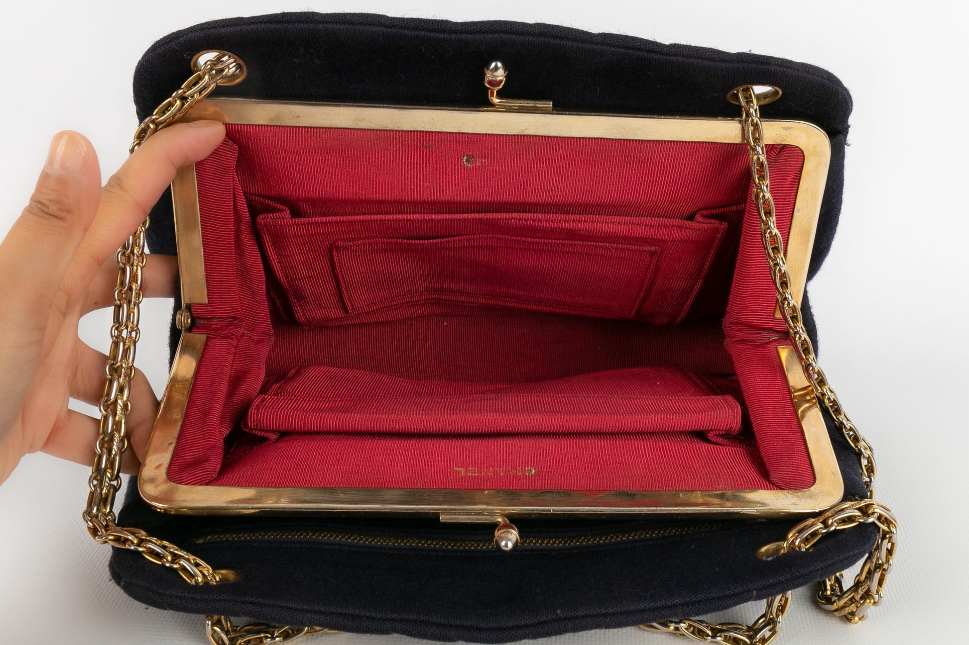 CHANEL -Sac en jersey bleu marine et int�rieur rouge. Attributs en m�tal dor�.