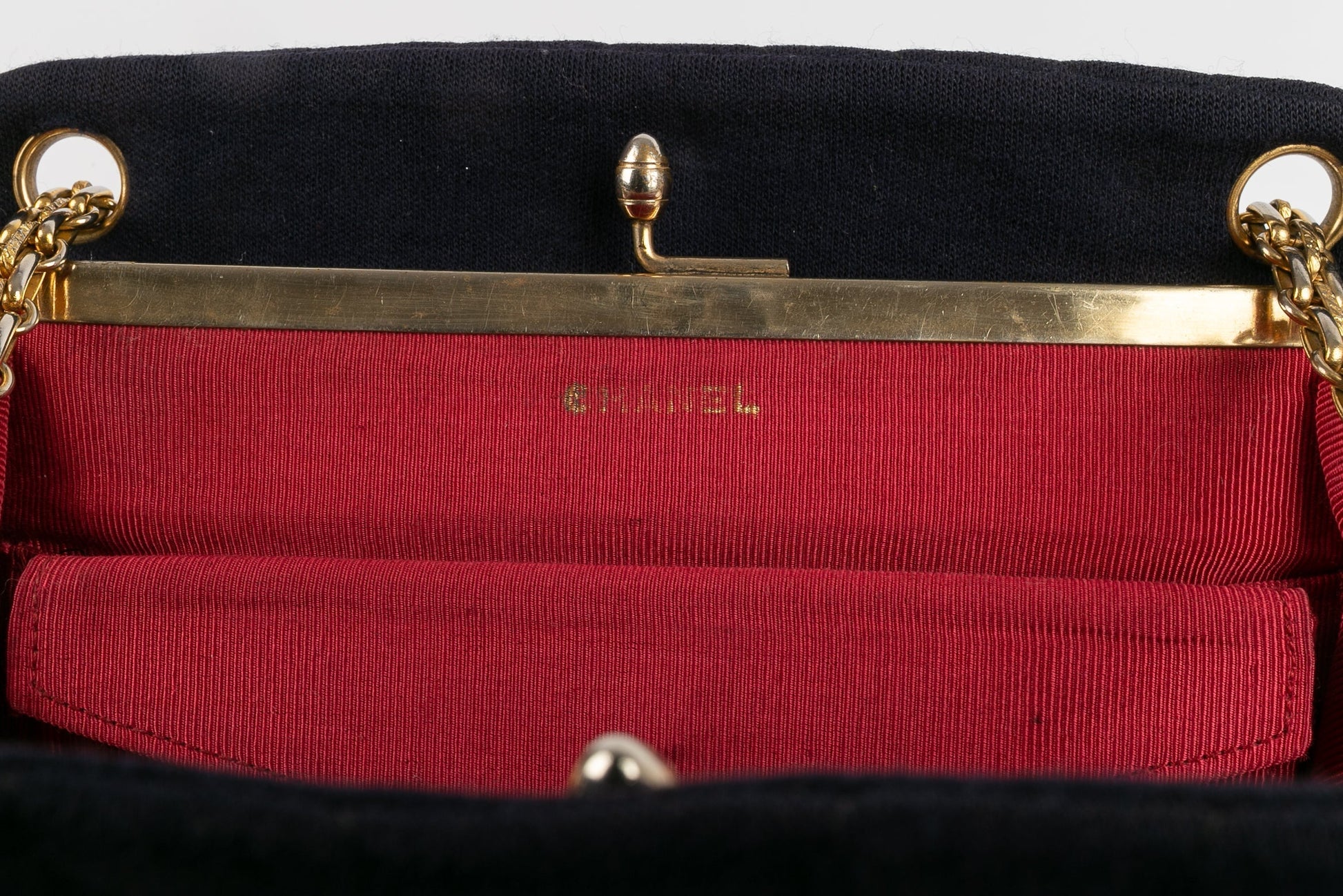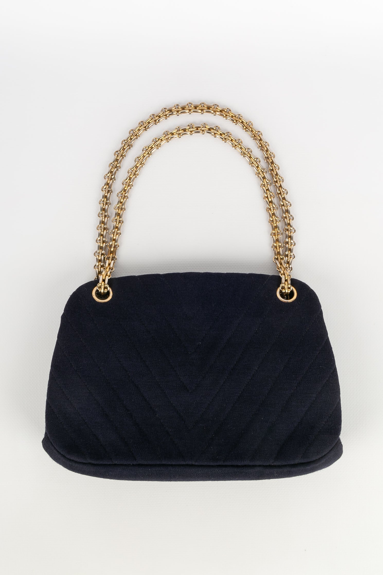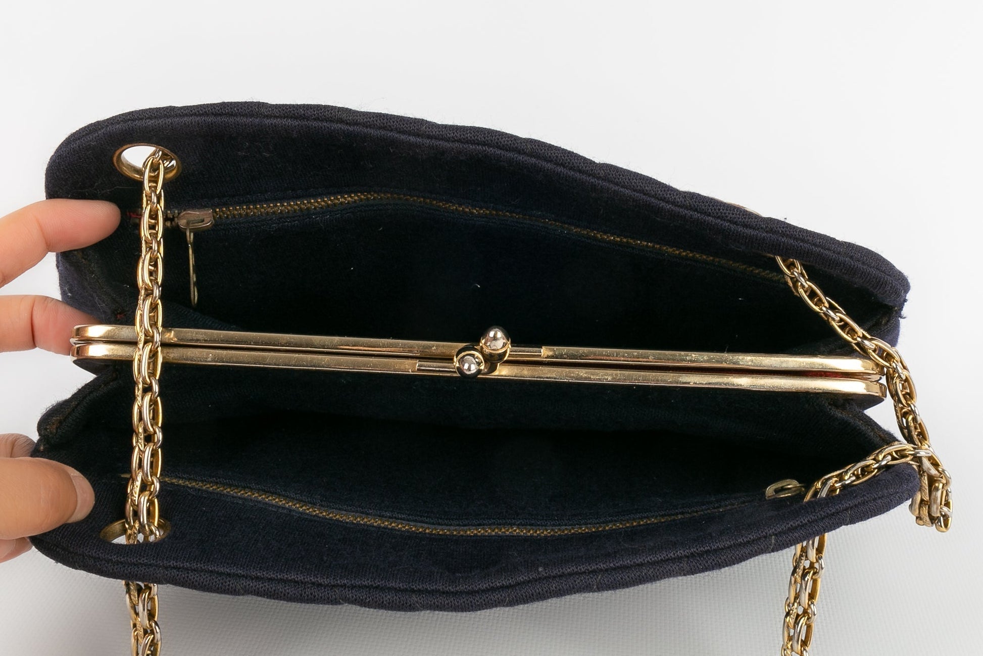 CHANEL -Sac en jersey bleu marine et int�rieur rouge. Attributs en m�tal dor�.
