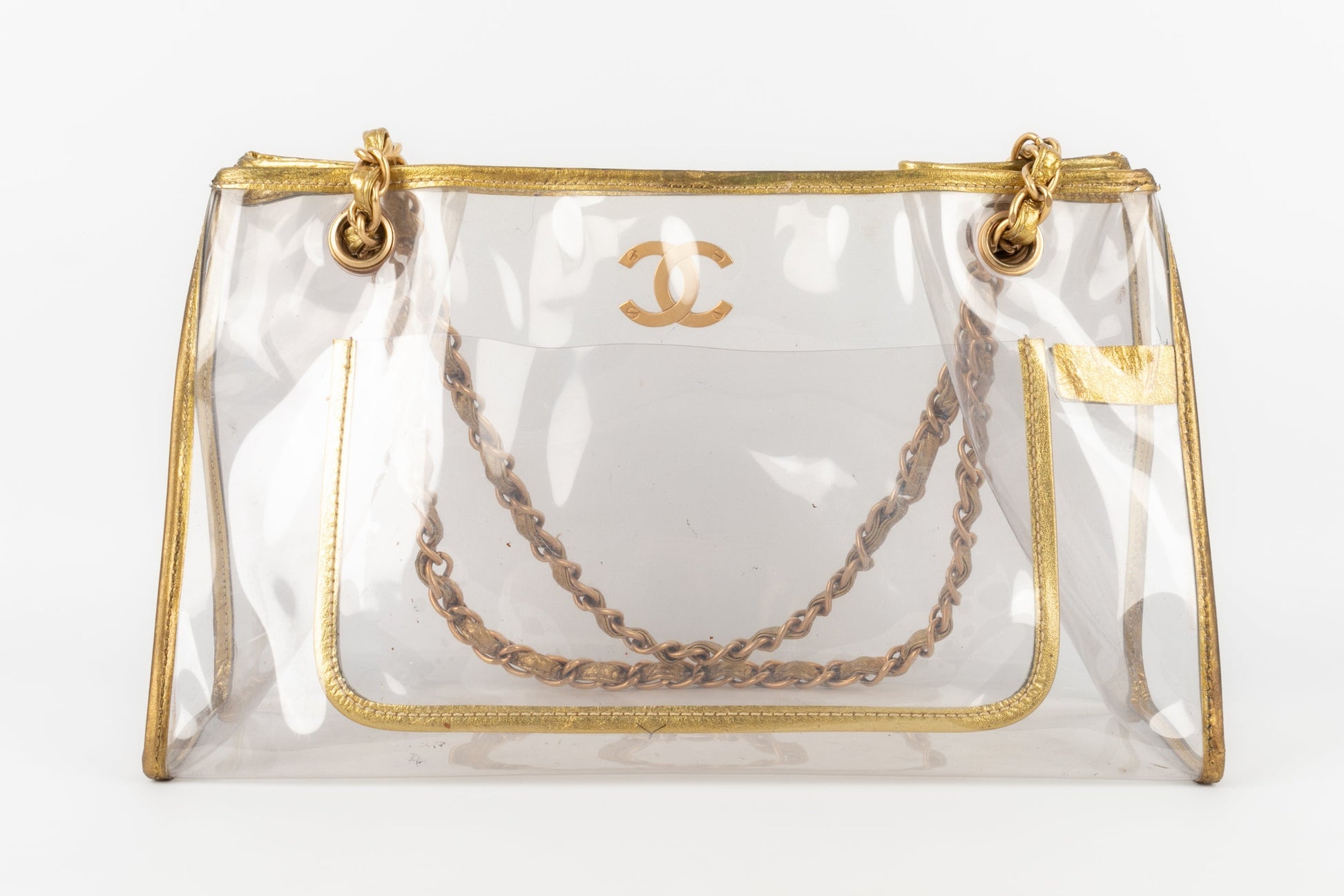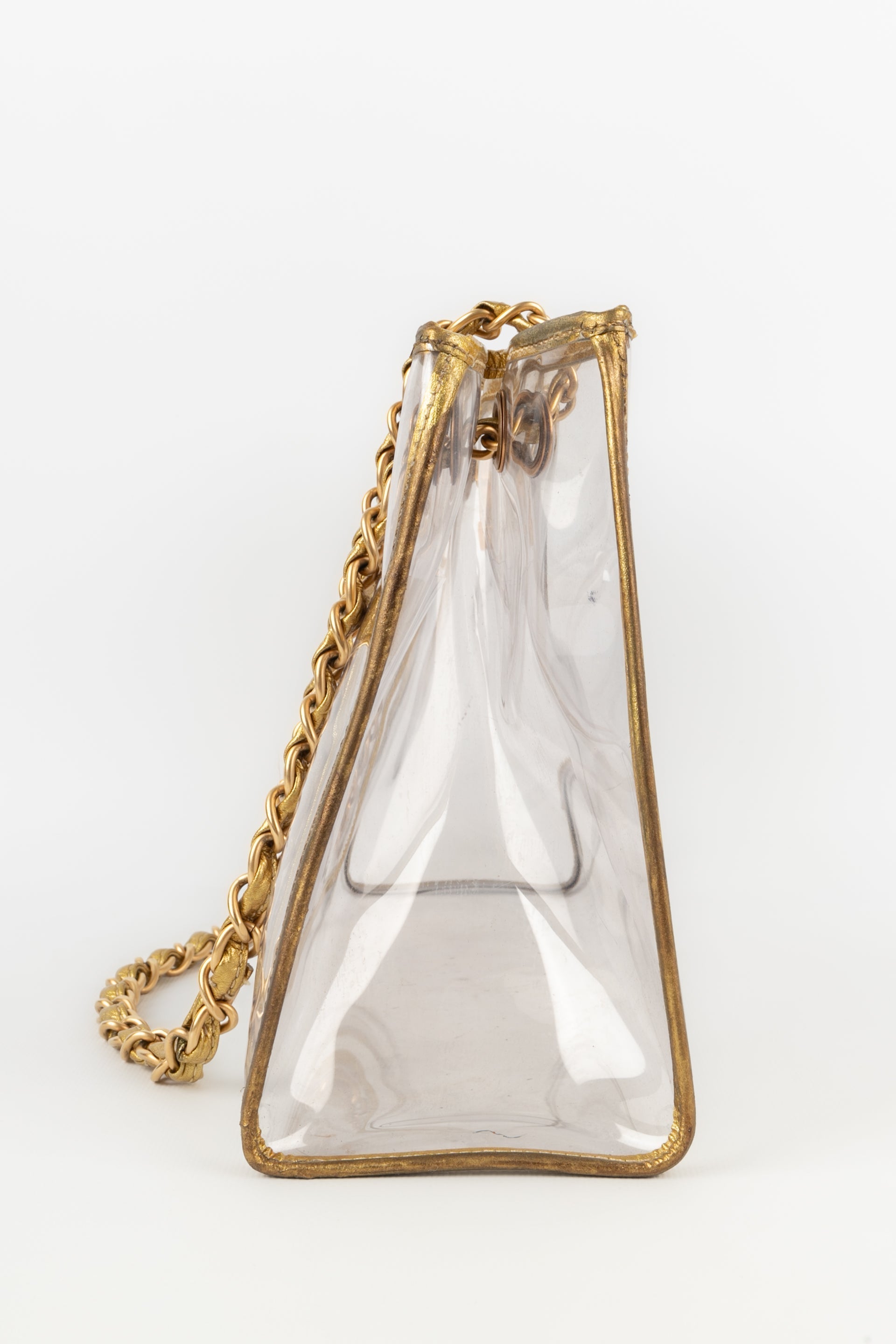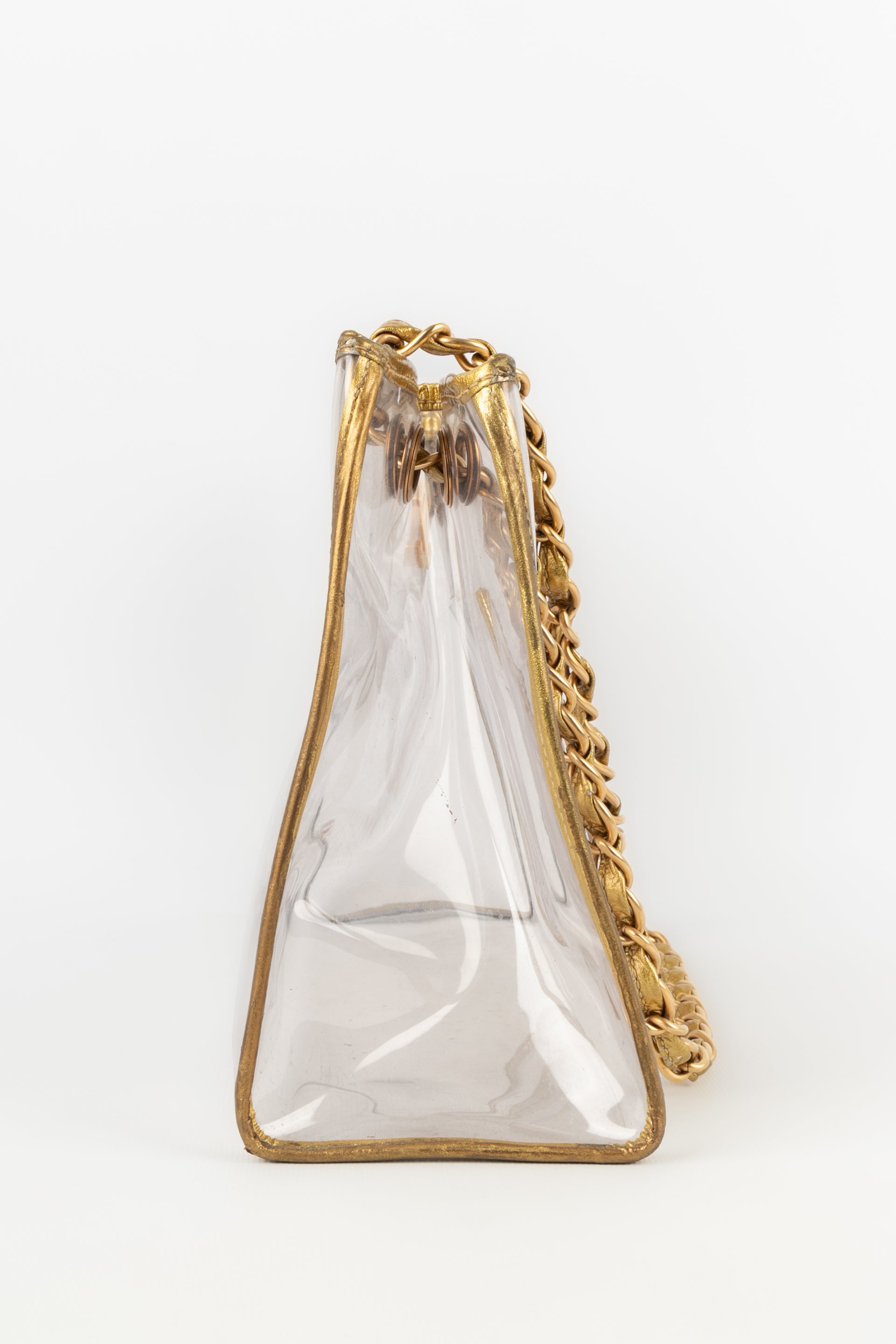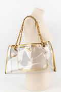 CHANEL -(Made in France) Sac à main en tissu pvc transparent, cuir et métal doré. Collection 2006/2008. A signaler, quelques marques sur le cuir doré.