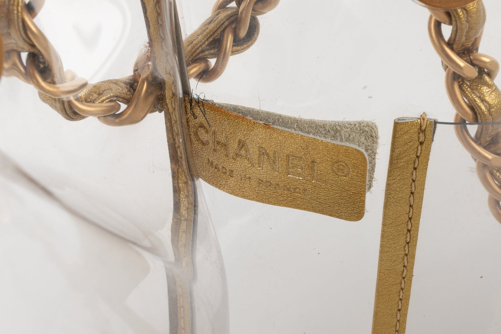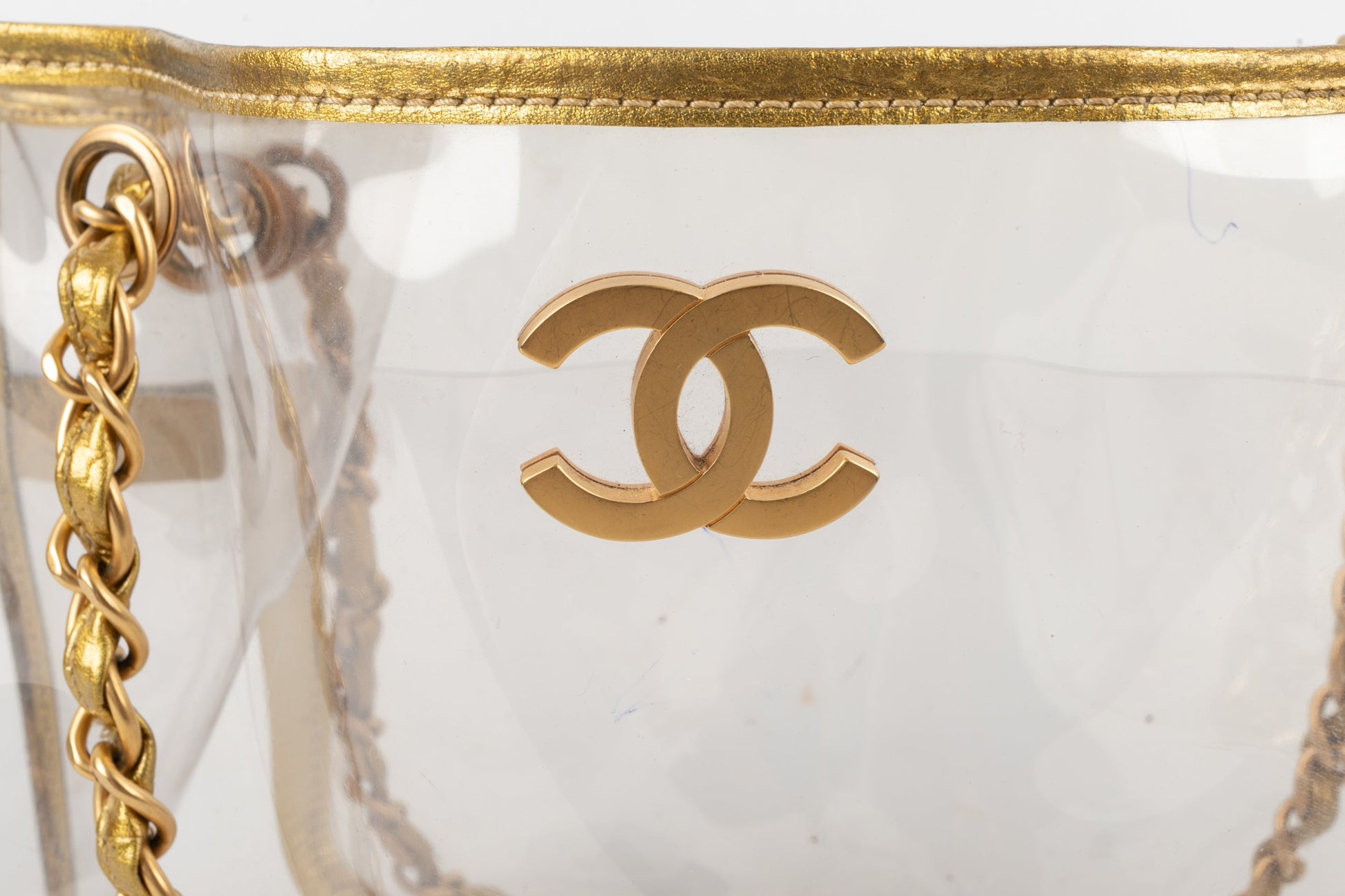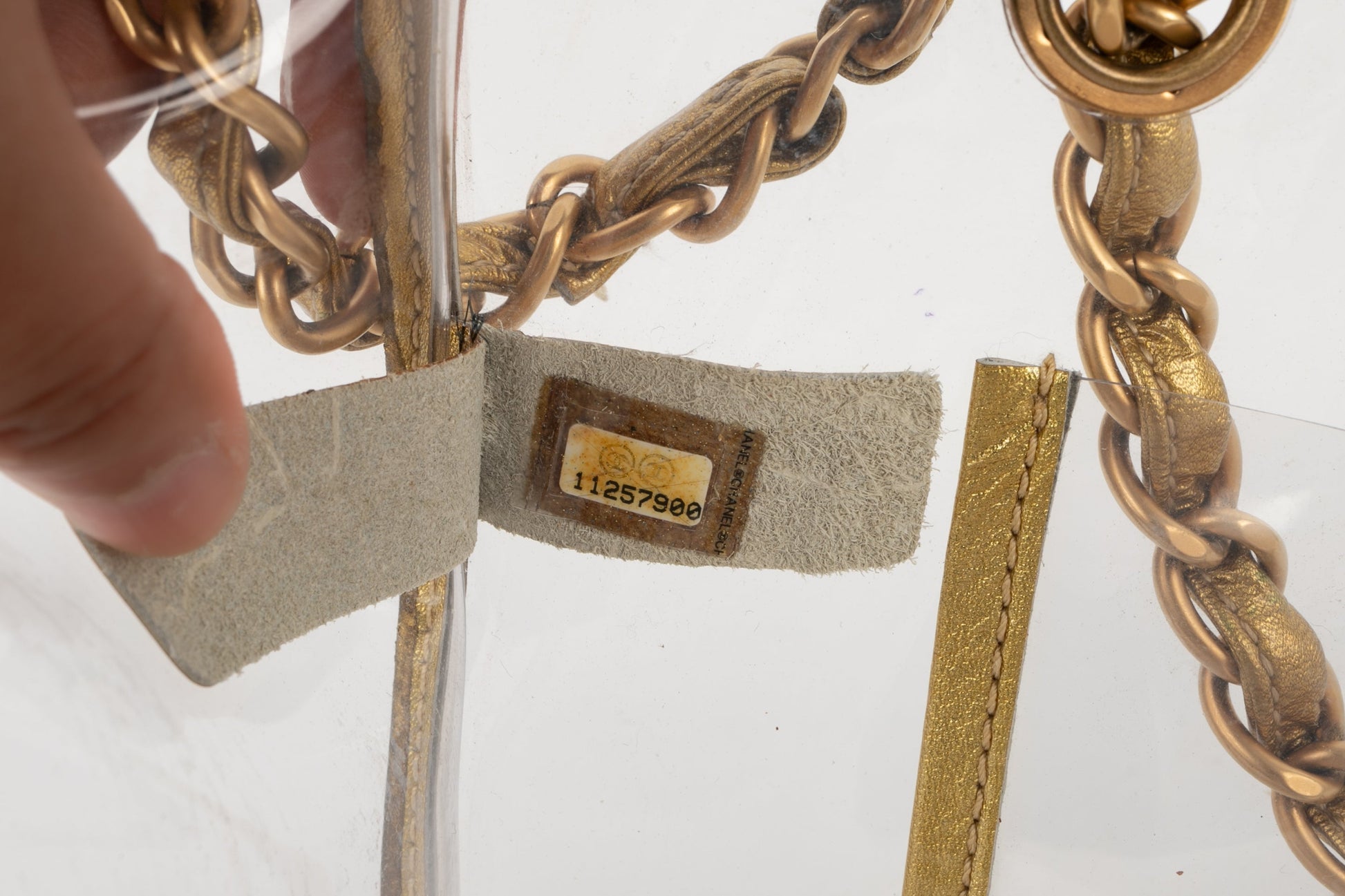 CHANEL -(Made in France) Sac à main en tissu pvc transparent, cuir et métal doré. Collection 2006/2008. A signaler, quelques marques sur le cuir doré.