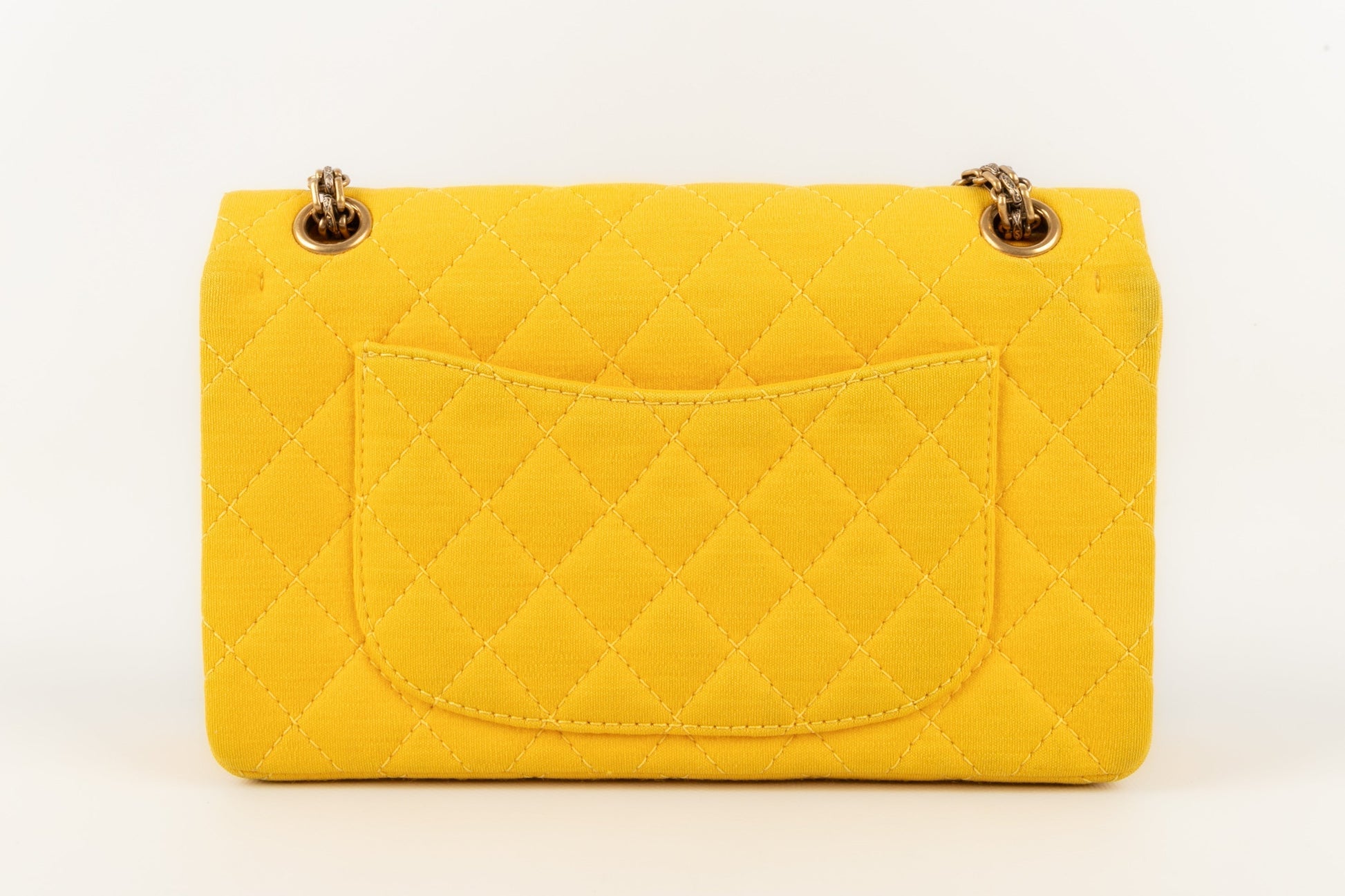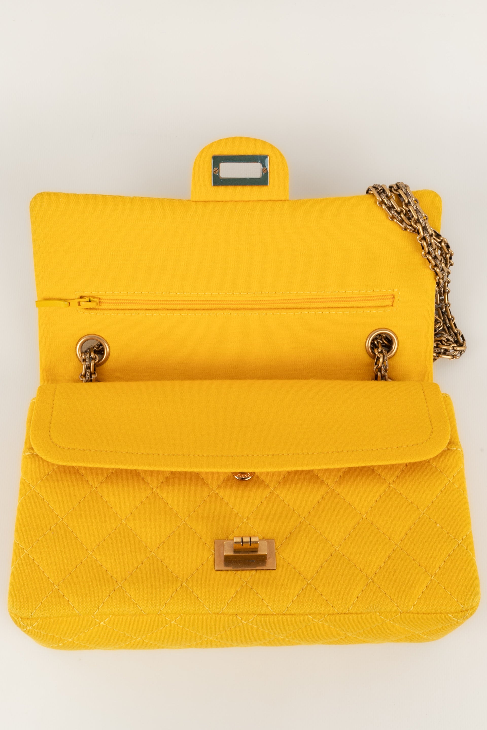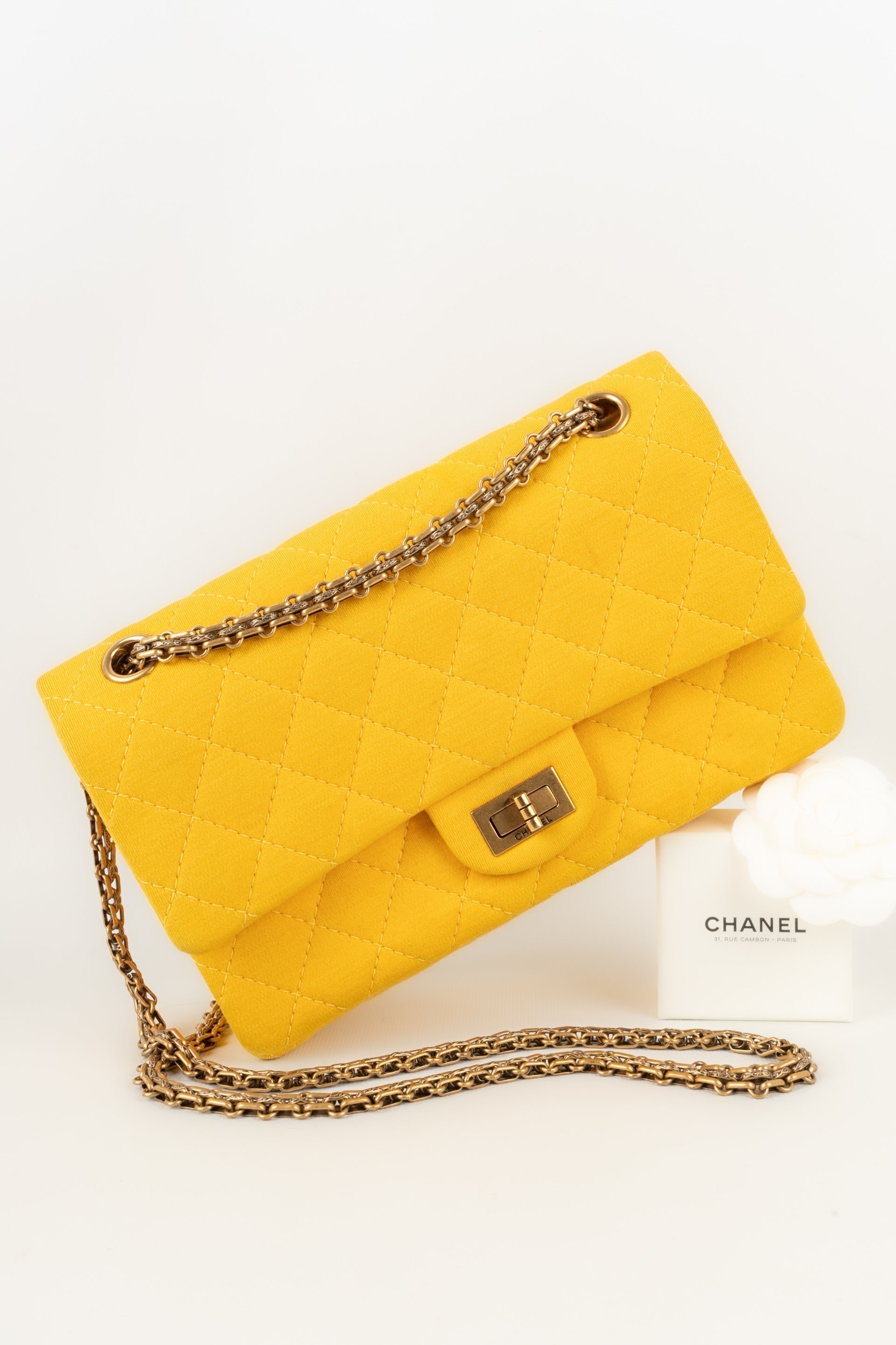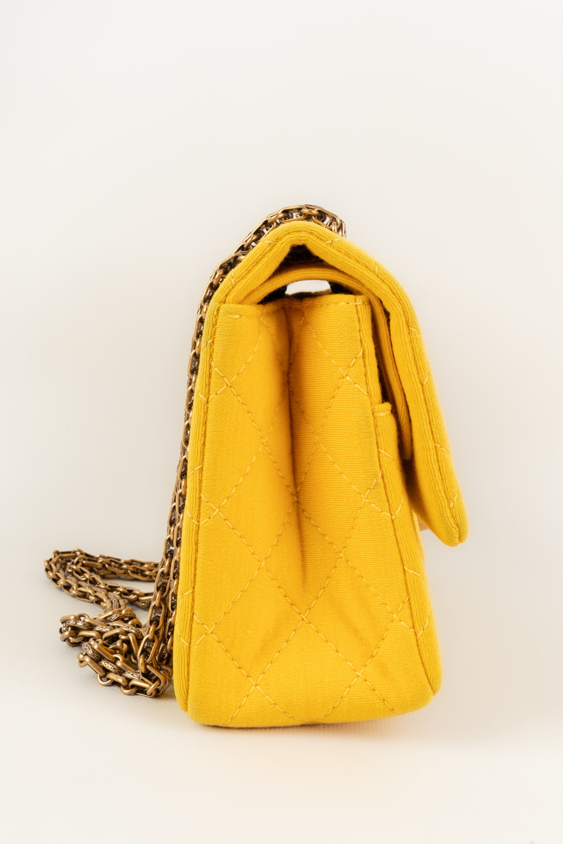 CHANEL -(Made in France) Sac en tissu jaune matelassé et intérieur en cuir. Attributs en métal doré. Numéro de série présent. Sac issu des ventes privées 2019. Collection 2015/2016.