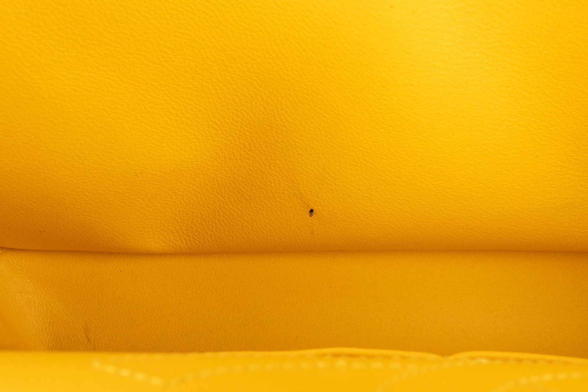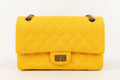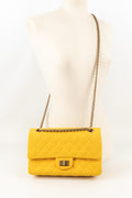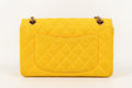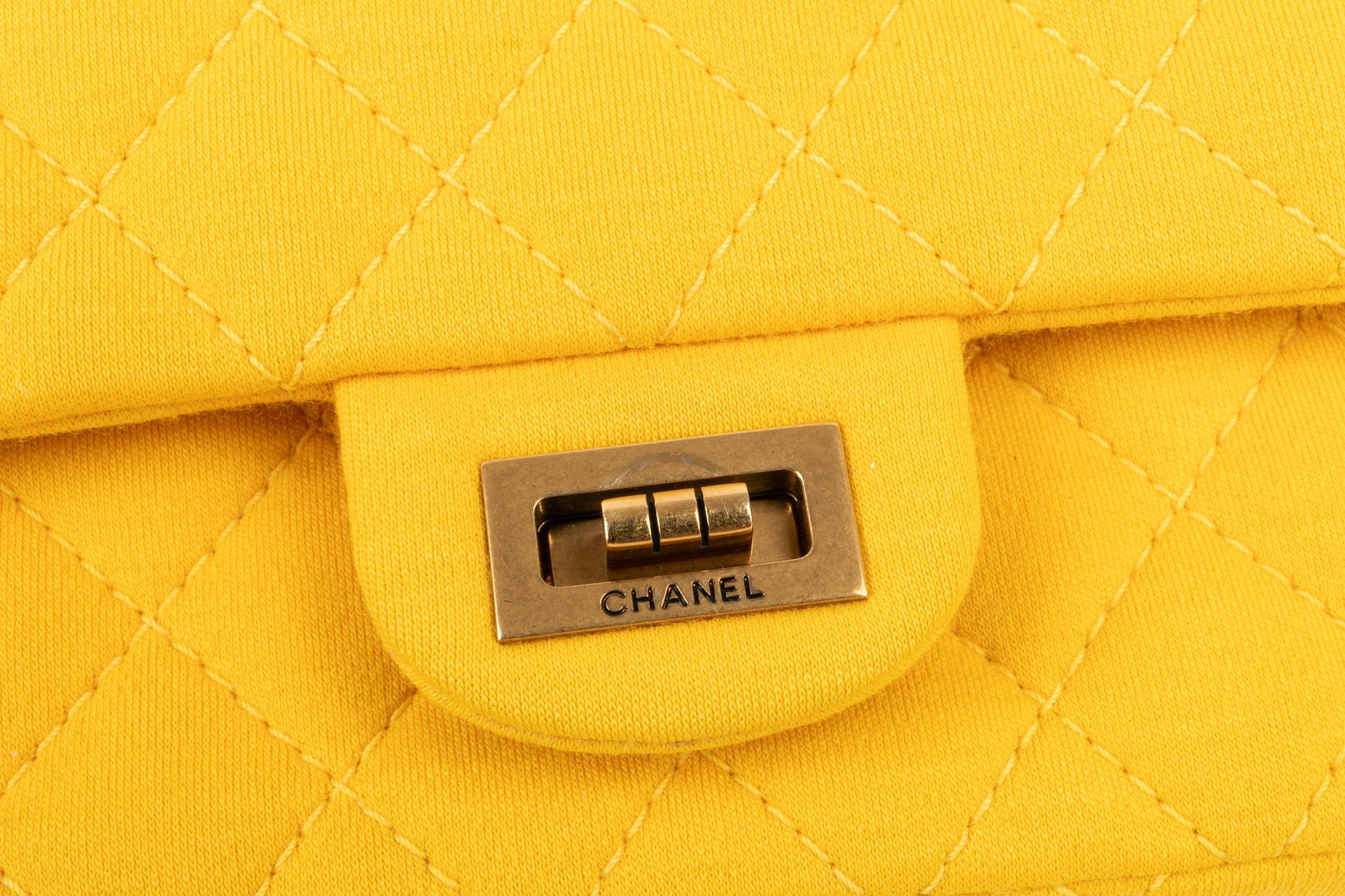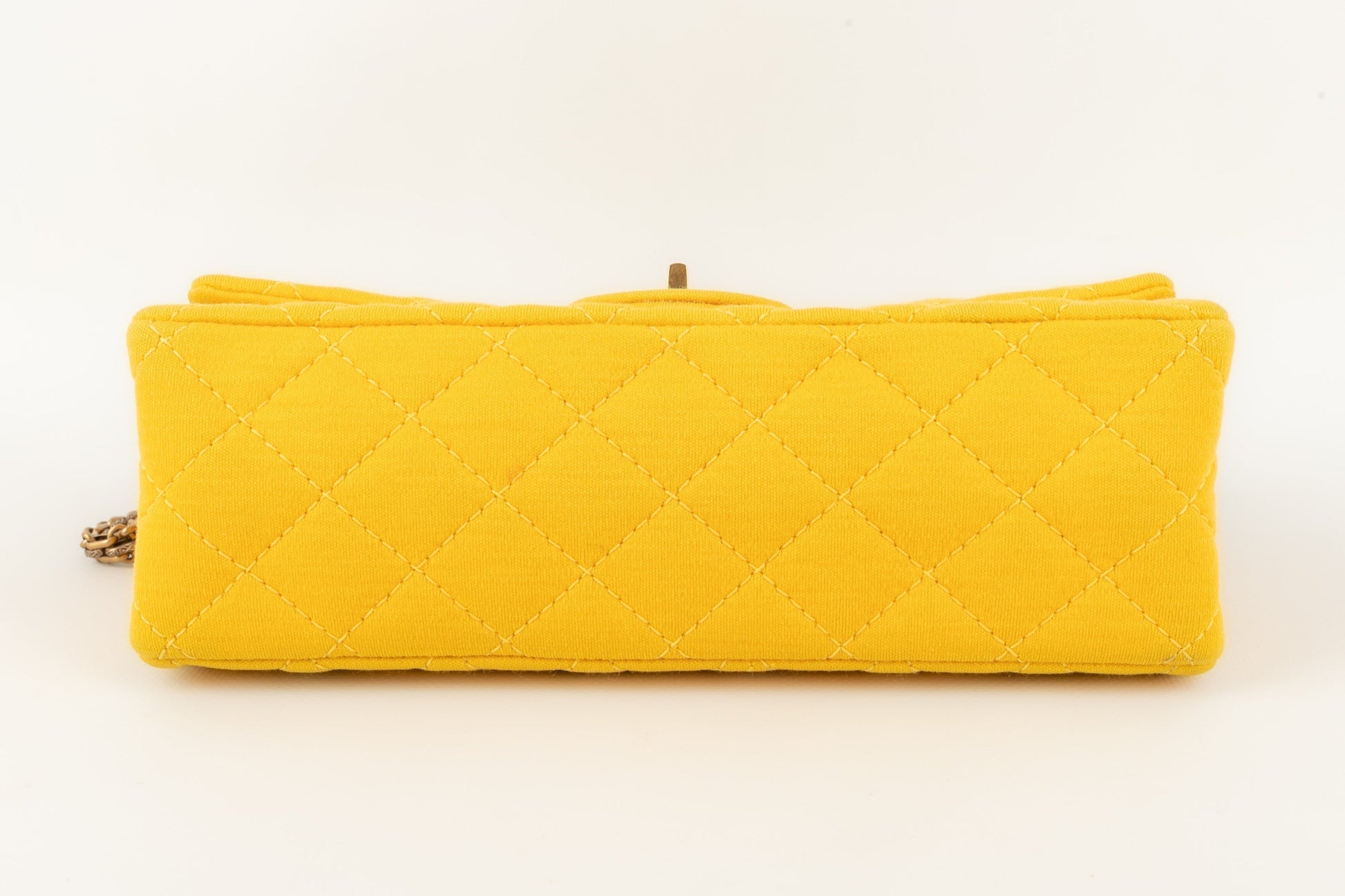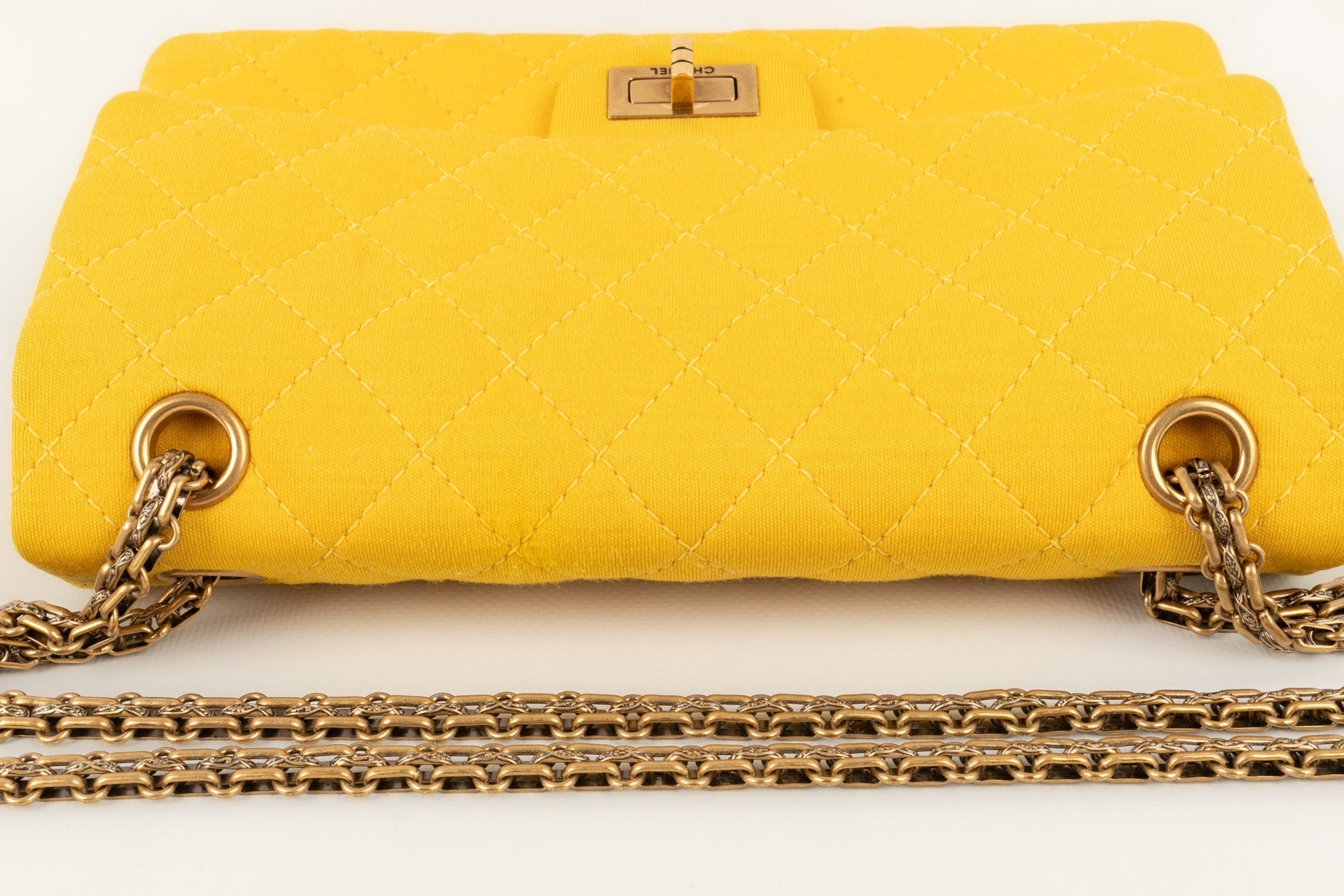 CHANEL -(Made in France) Sac en tissu jaune matelassé et intérieur en cuir. Attributs en métal doré. Numéro de série présent. Sac issu des ventes privées 2019. Collection 2015/2016.
