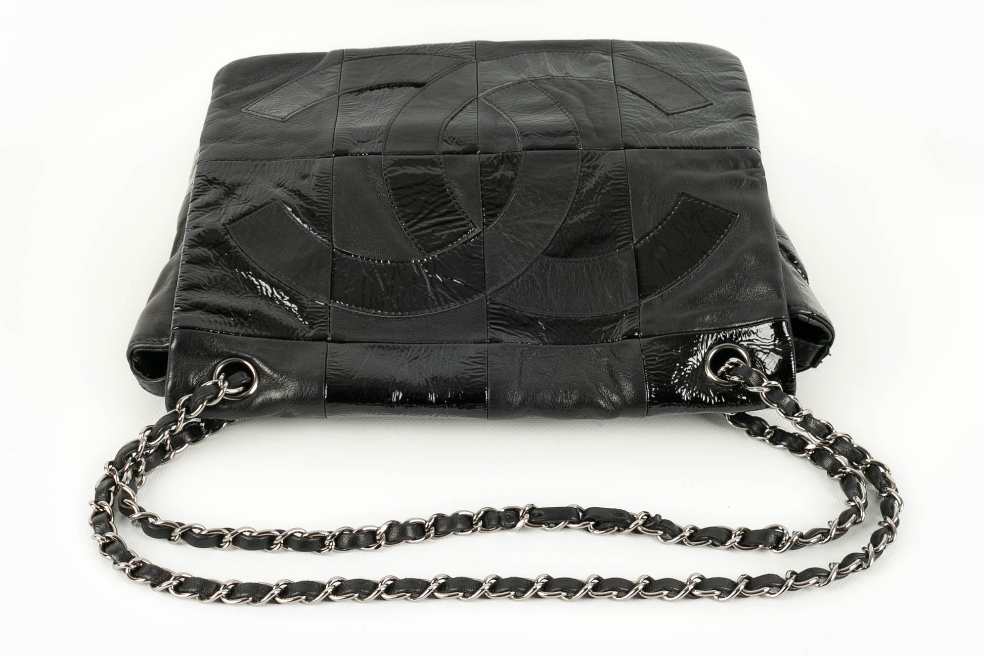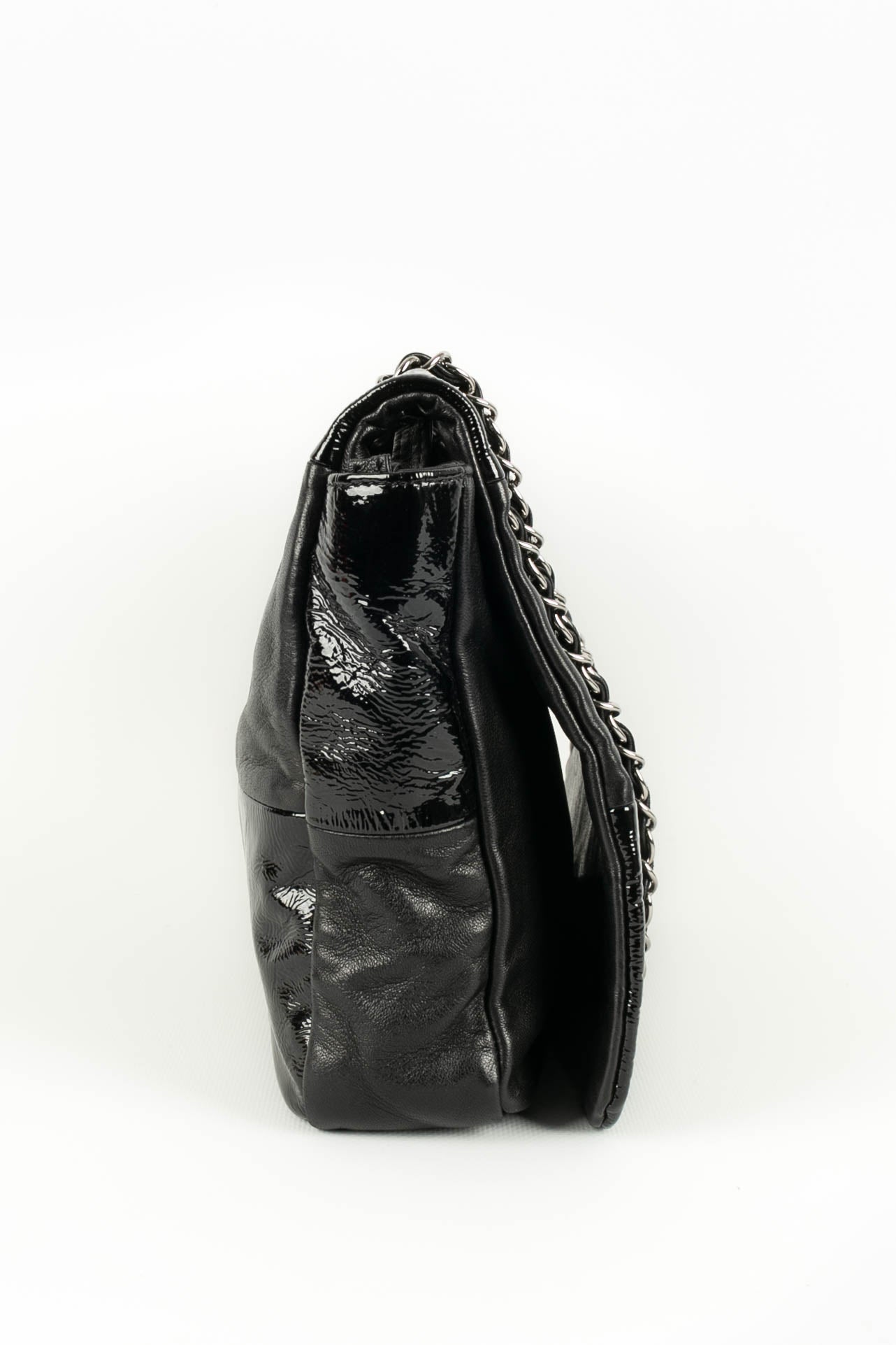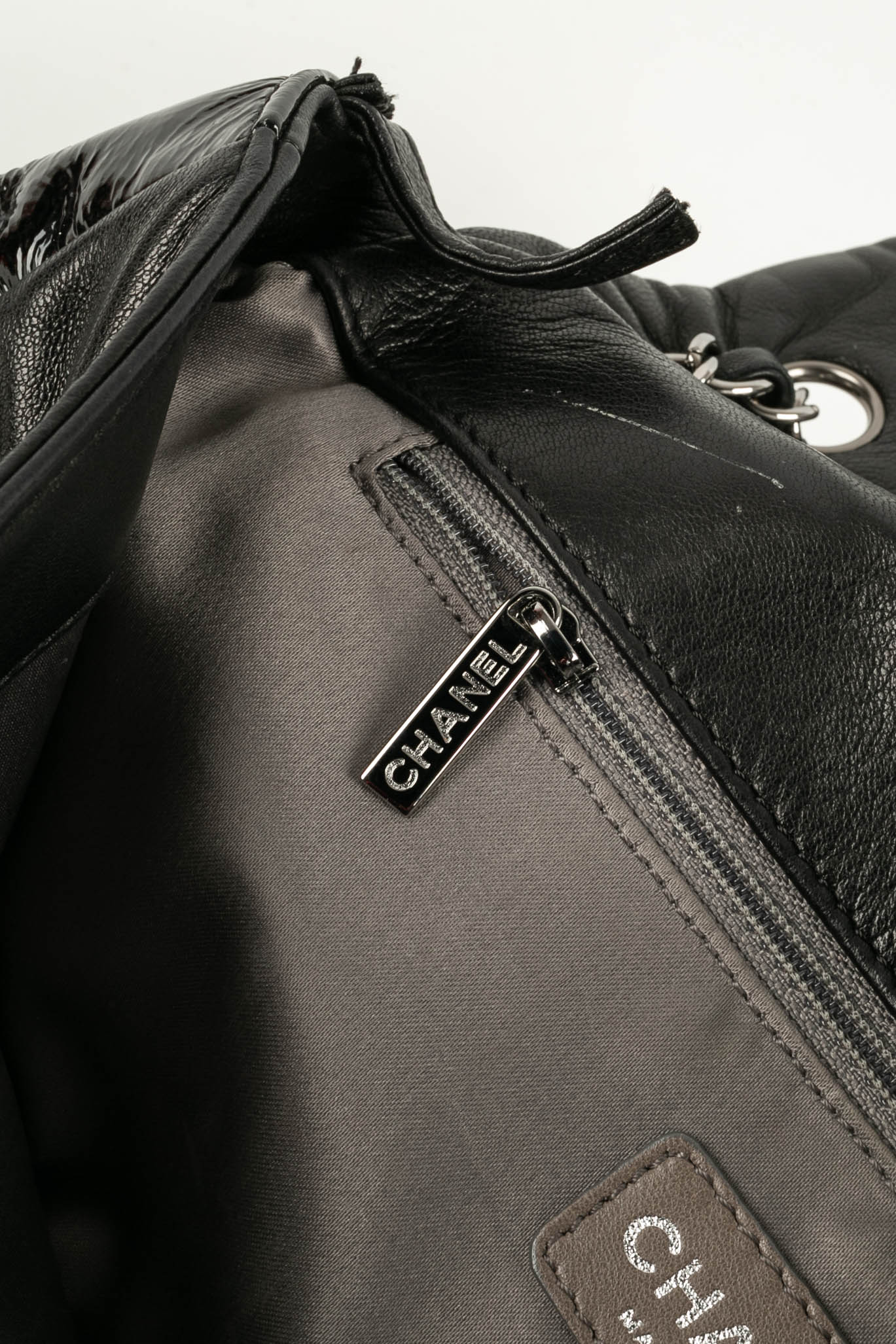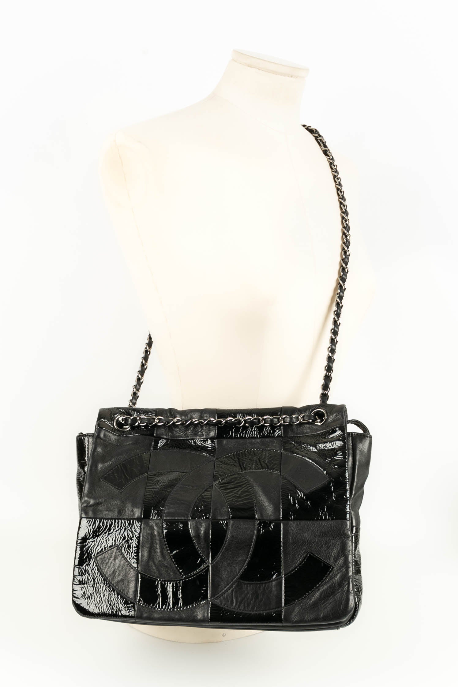 CHANEL - (Made in Italy) Sac patchwork en cuir et cuir verni noir. Attributs en m�tal argent�. Num�ro de s�rie pr�sent. Collection 2006/2007. A signaler, rares marques sur le cuir et le satin de la doublure.