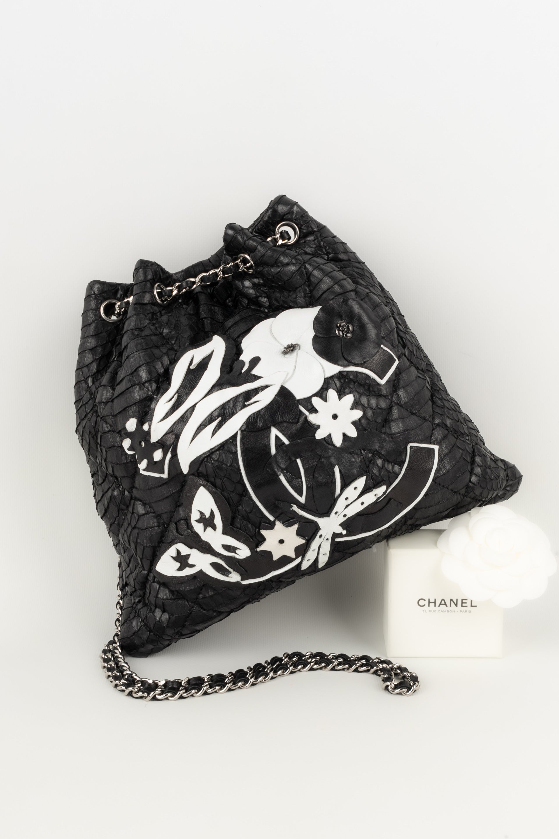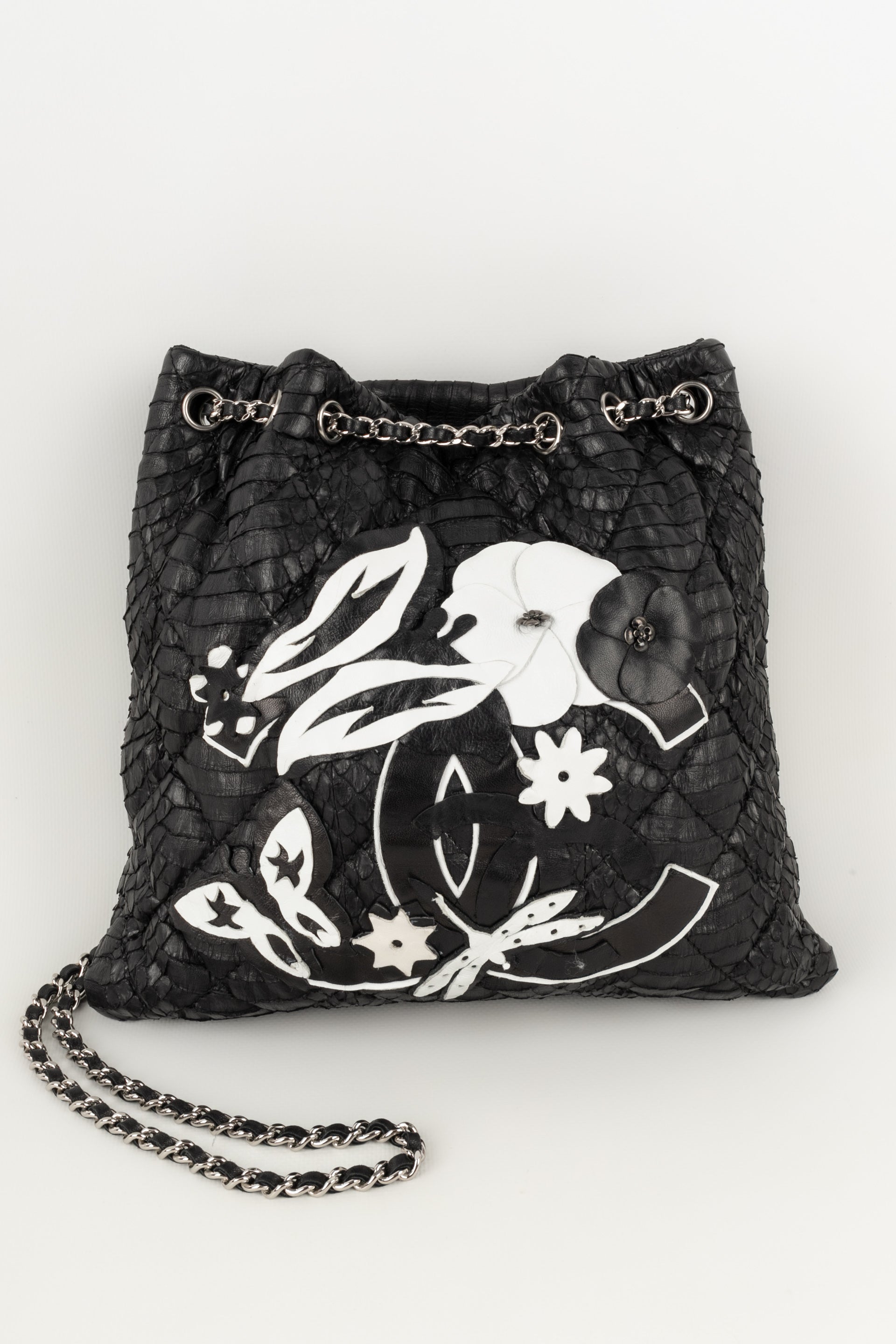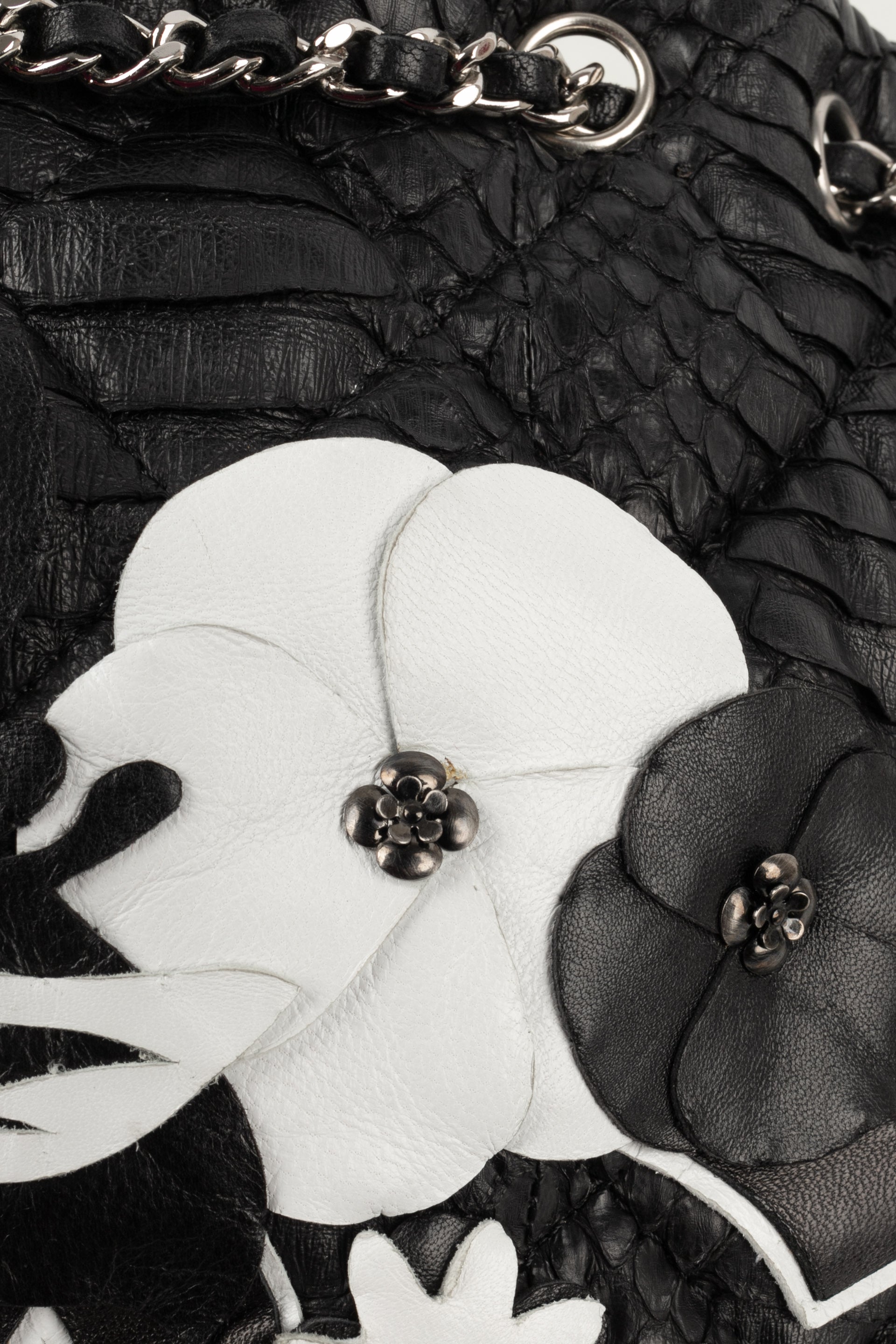 CHANEL - (Made in Italy) Sac en cuir exotique noir et cuir blanc, attributs en métal argenté. Numéro de série absent.