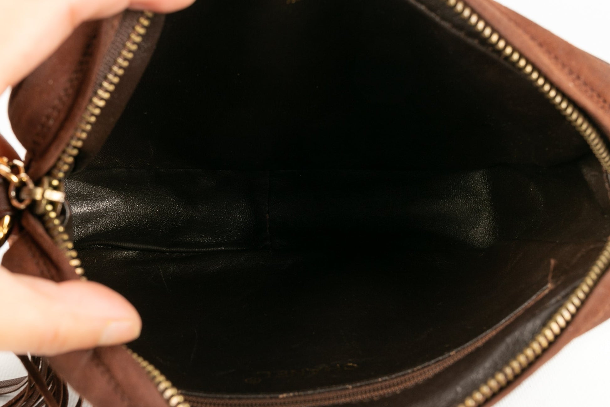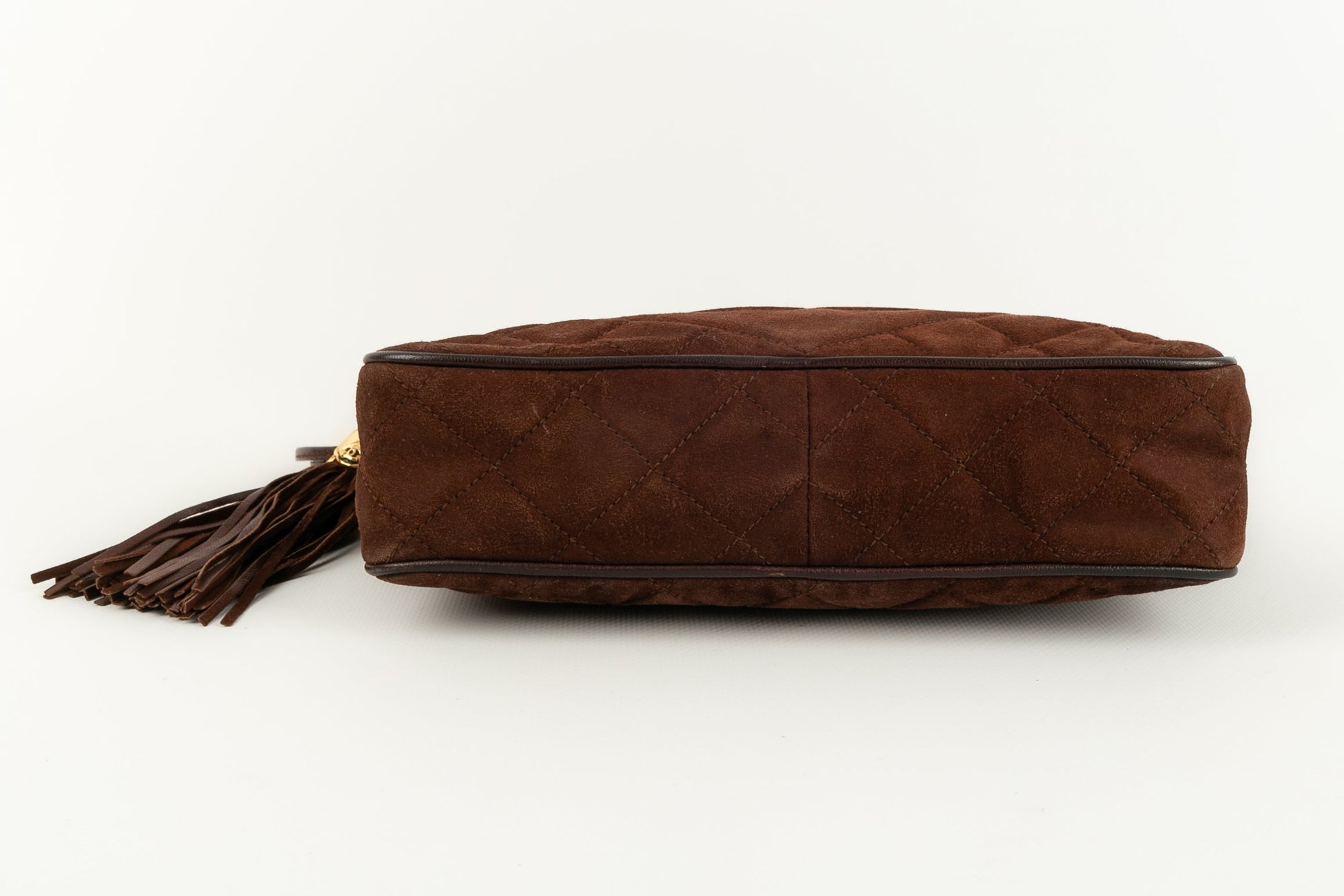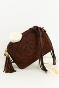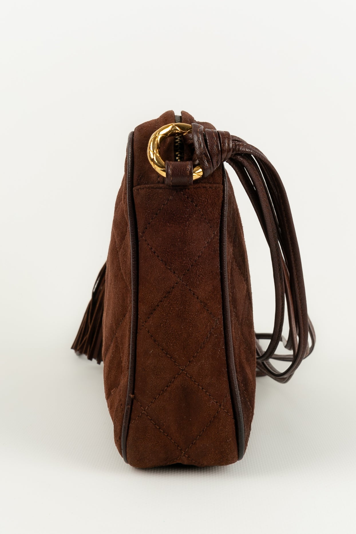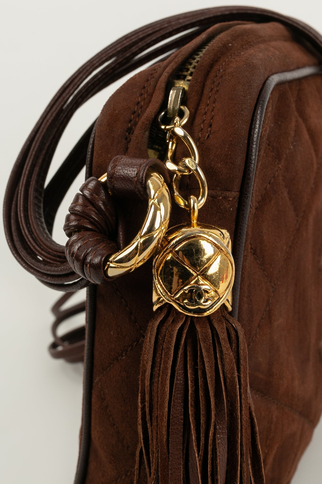 CHANEL - Sac en daim marron accompagn� d'un pompon. Attributs en m�tal dor�.