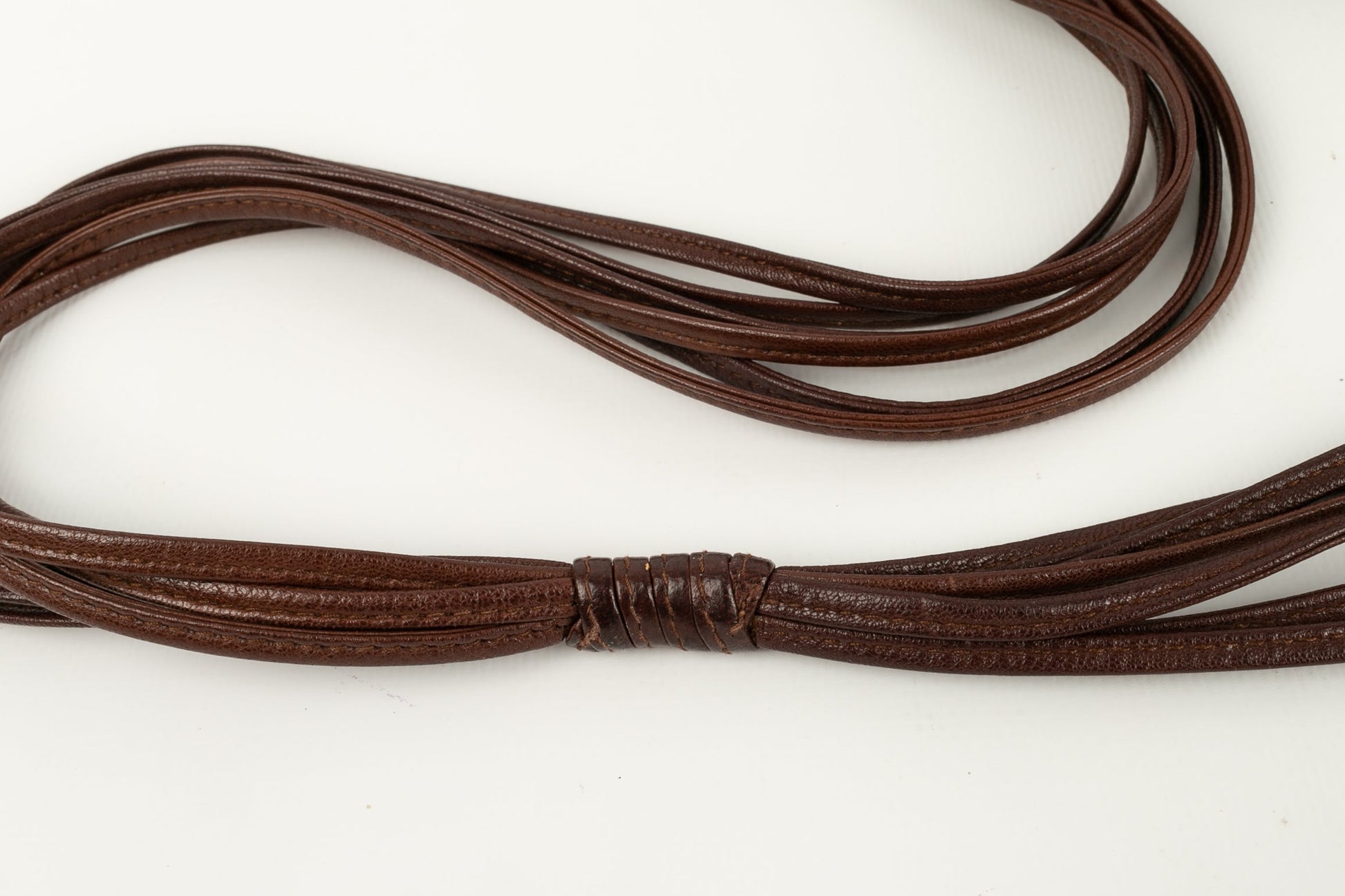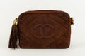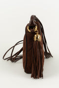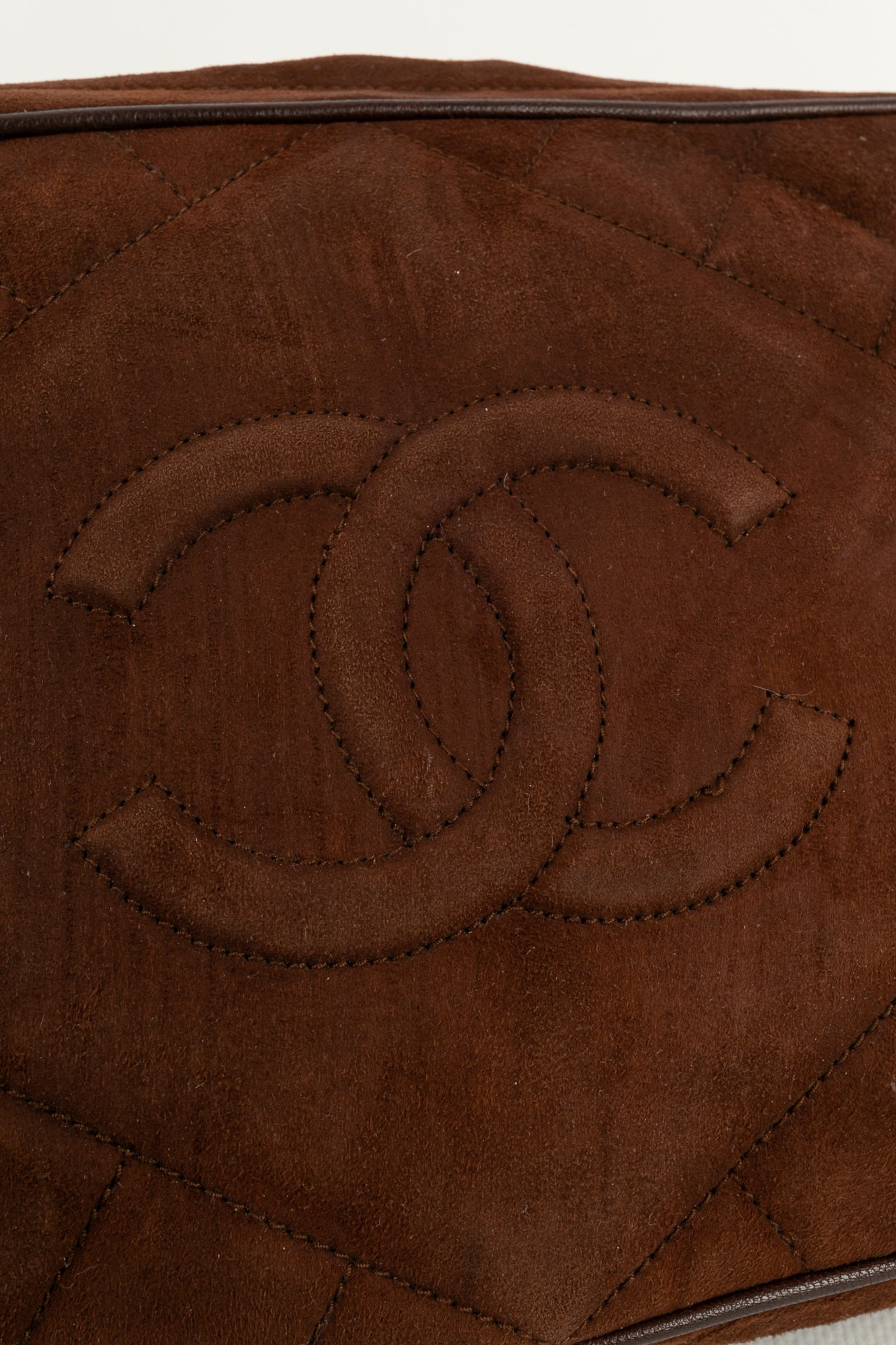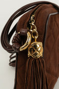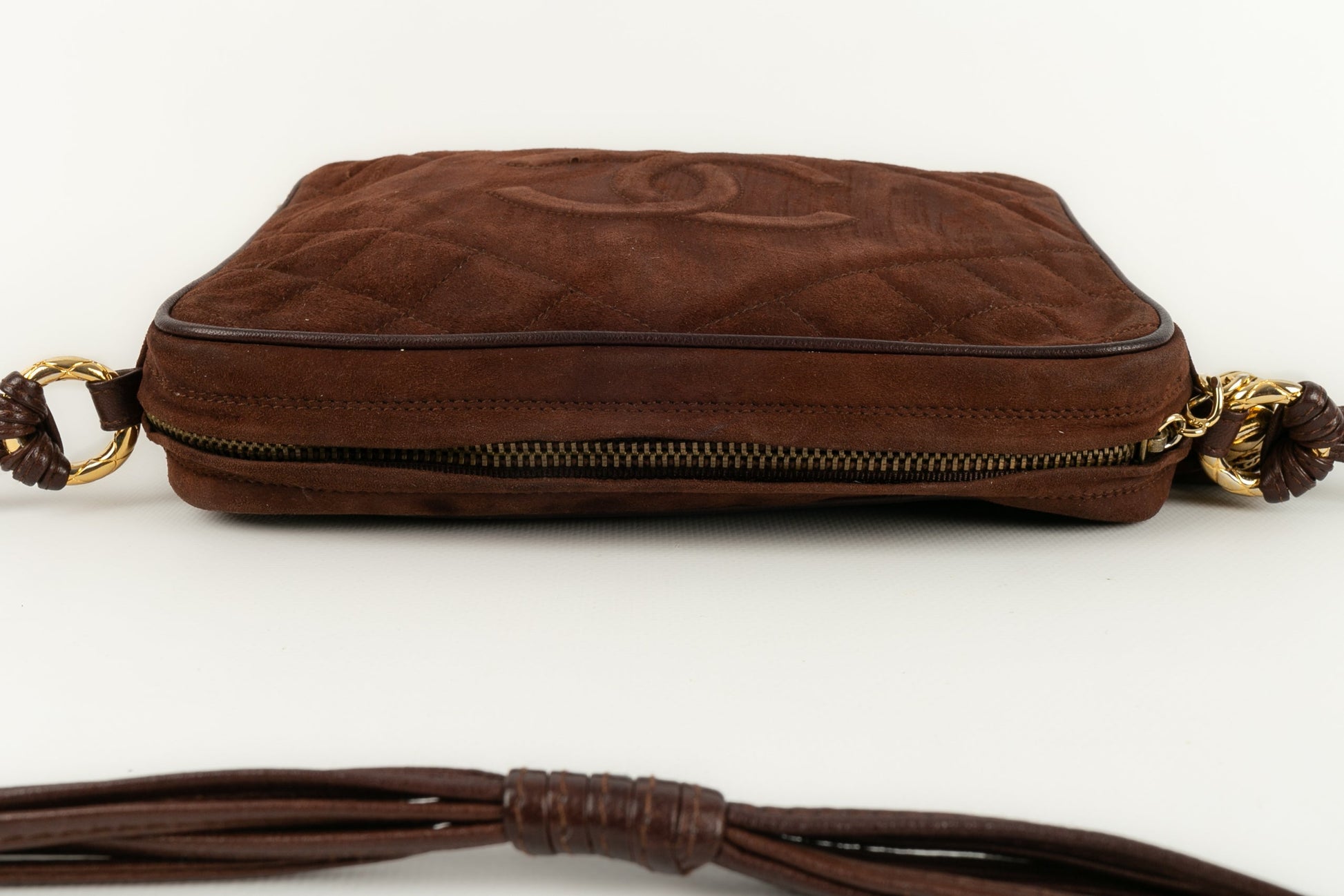CHANEL - Sac en daim marron accompagn� d'un pompon. Attributs en m�tal dor�.