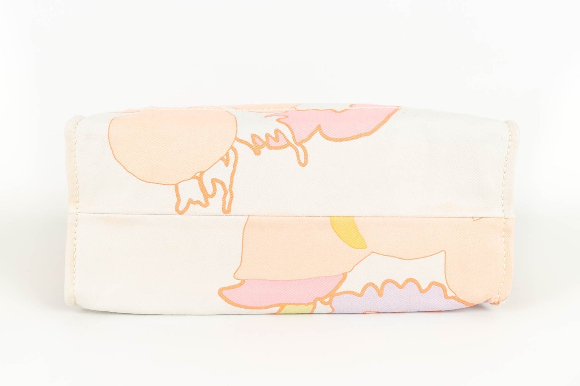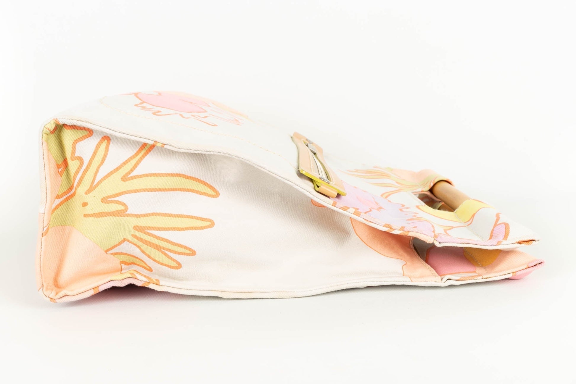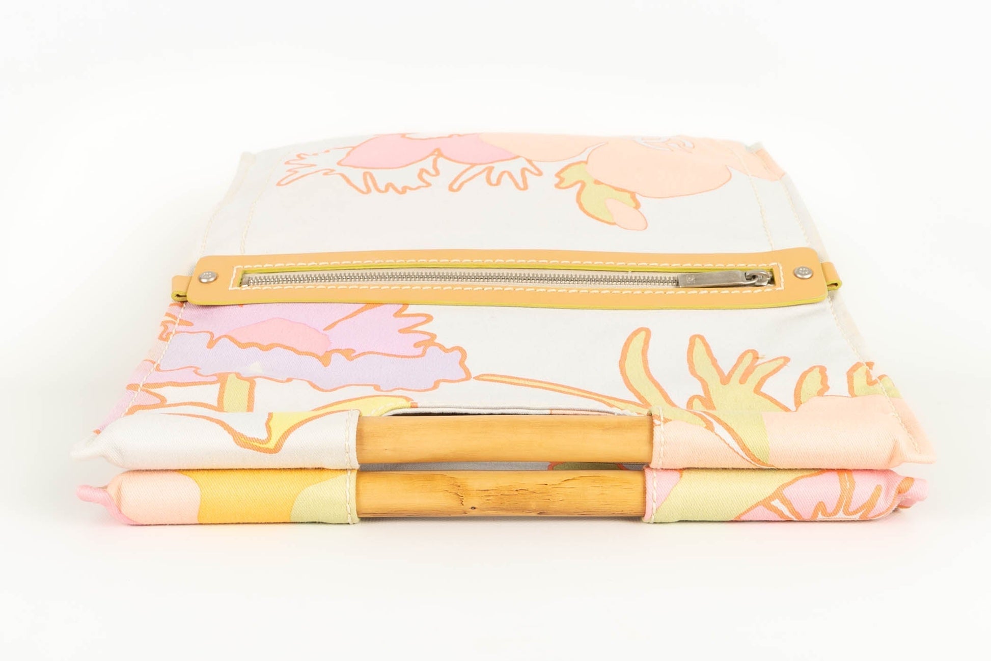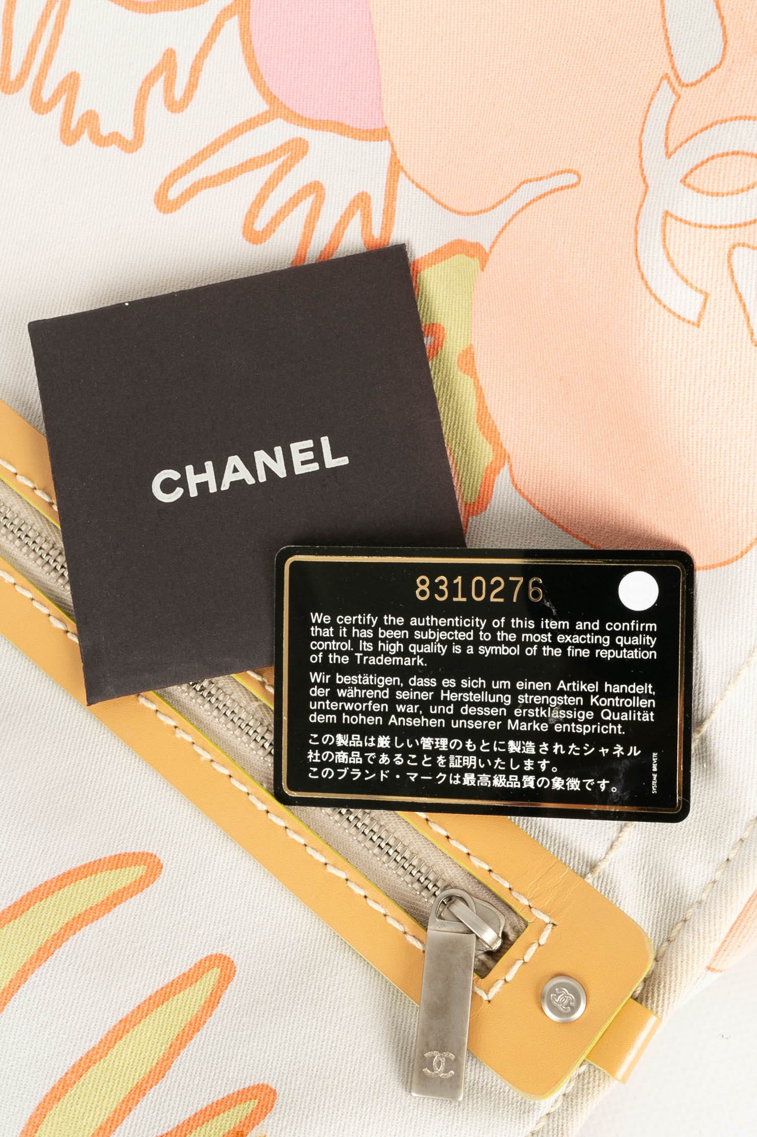 CHANEL - (Made in Italy) Sac en toile multicolore, cuir et anses en bois. Il est accompagn� d'un foulard en �tamine de coton. Num�ro de s�rie et carte d'it� pr�sents. Collection 2003/2004.