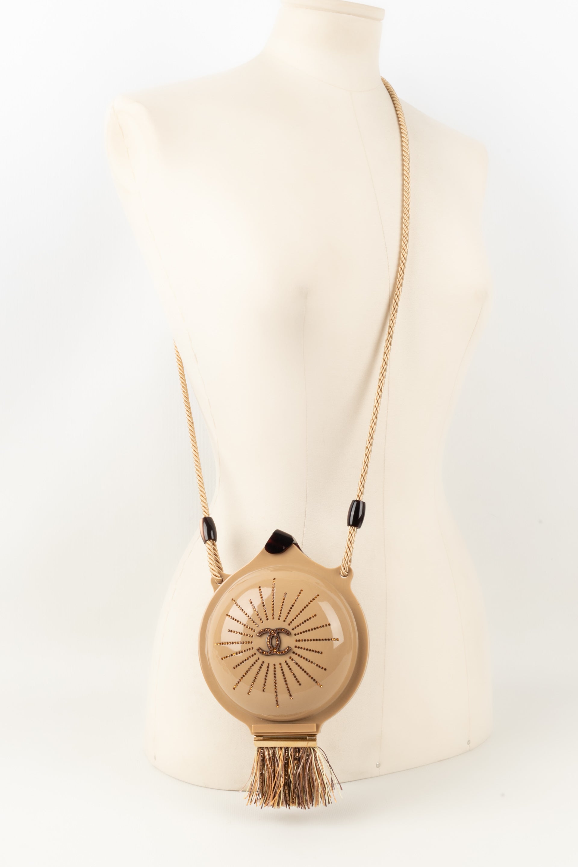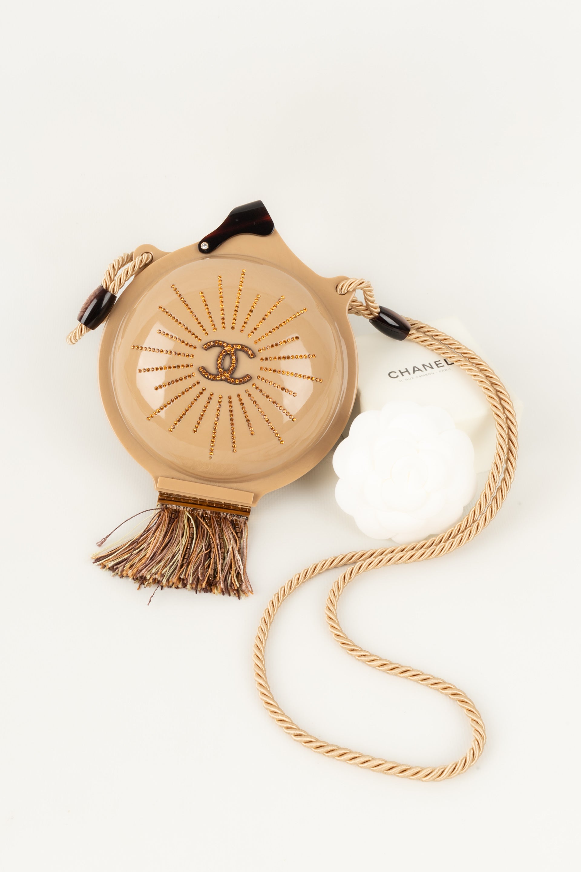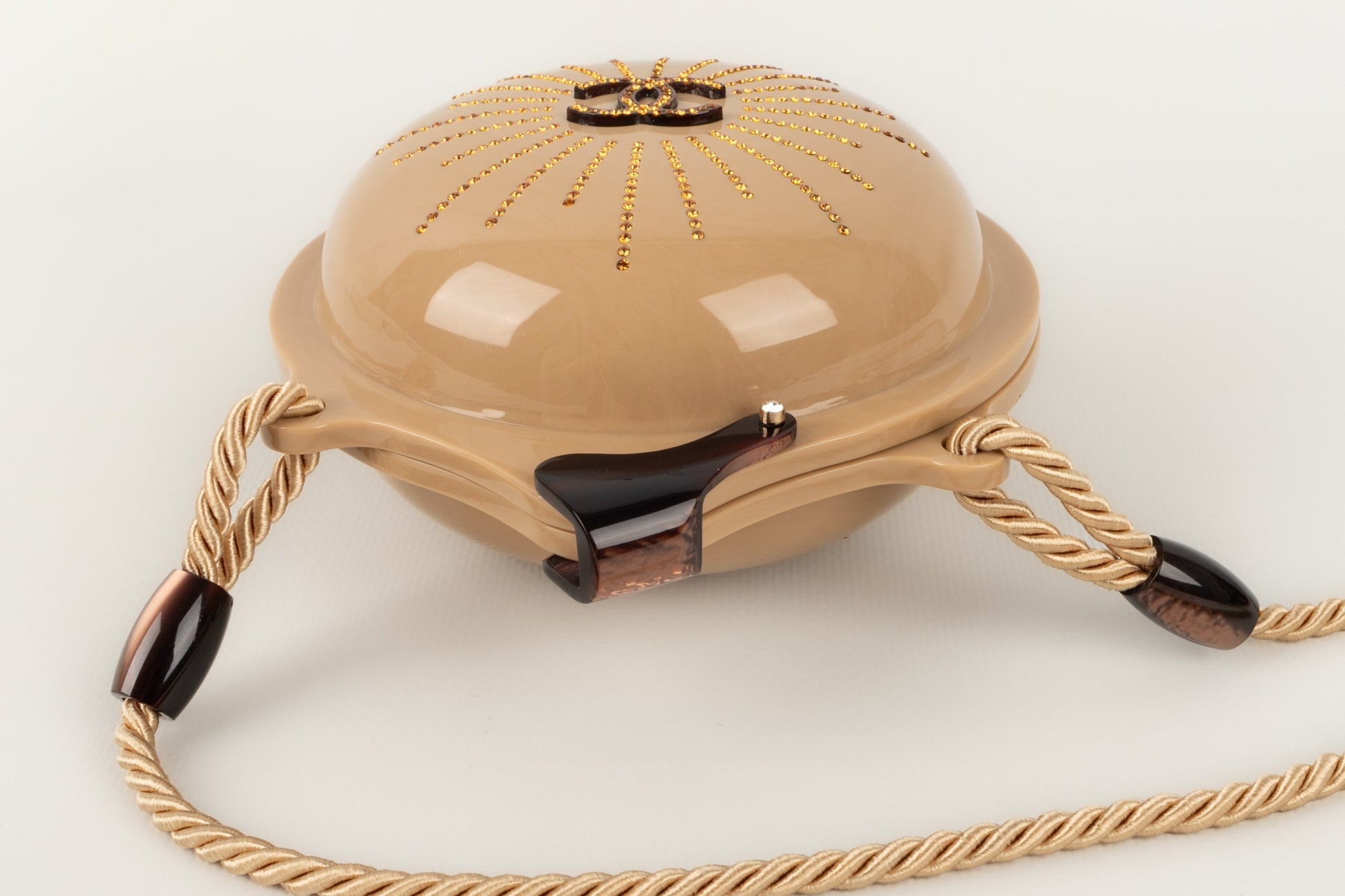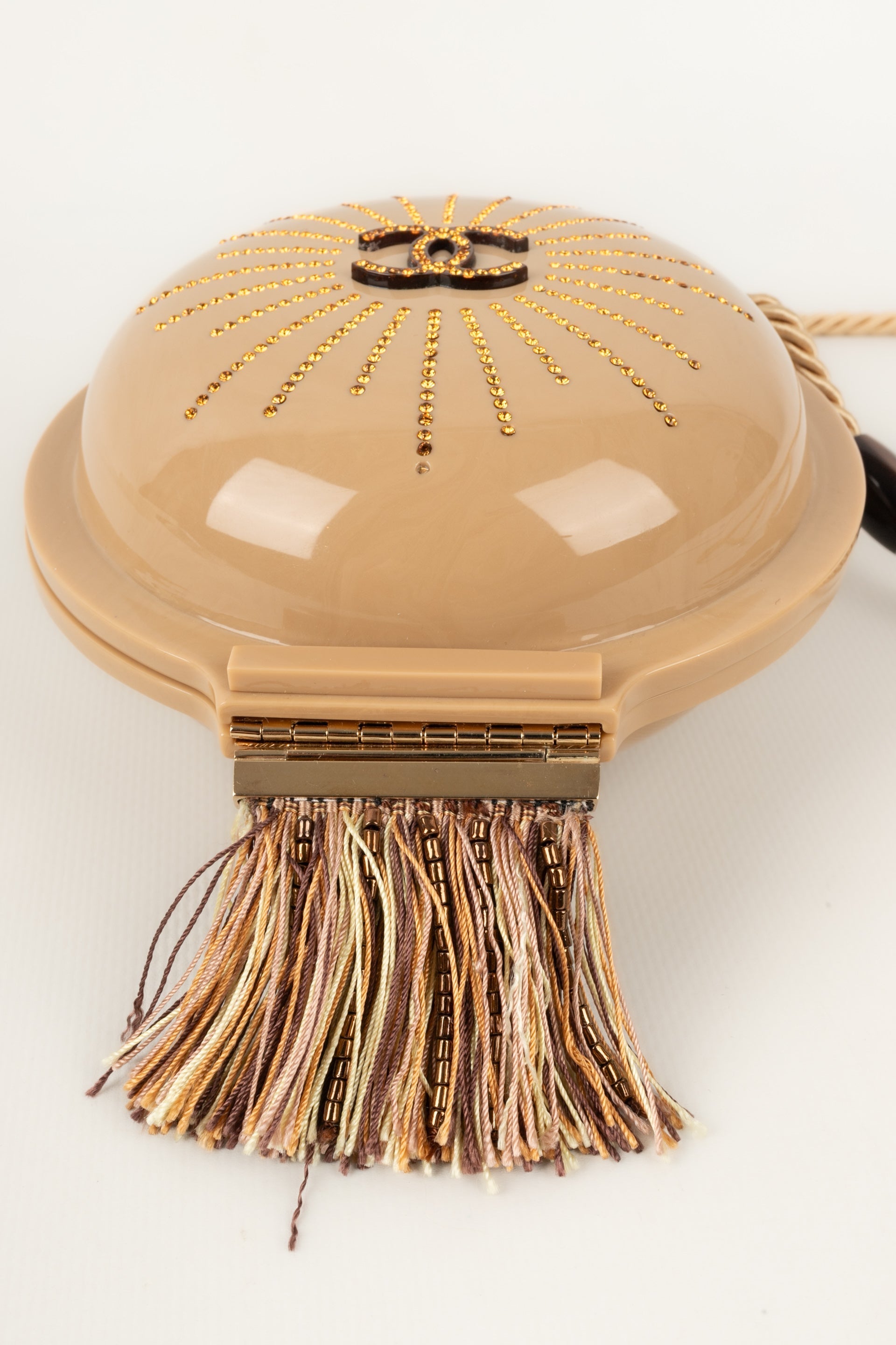 CHANEL -(Made in France) Minaudière en bakélite beige décorée de strass orangés, anse en passementerie. Intérieur en cuir d'agneau beige. Collection Printemps/Eté 2005. A signaler 3 strass manquants.