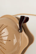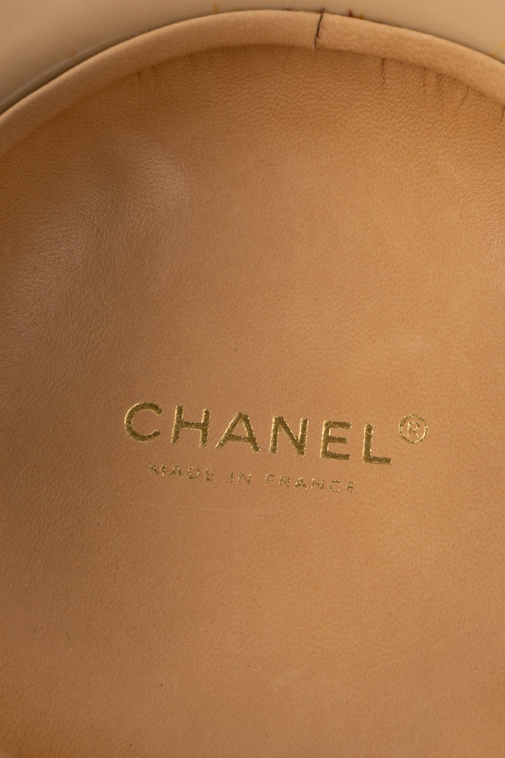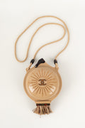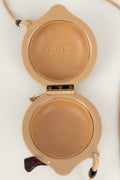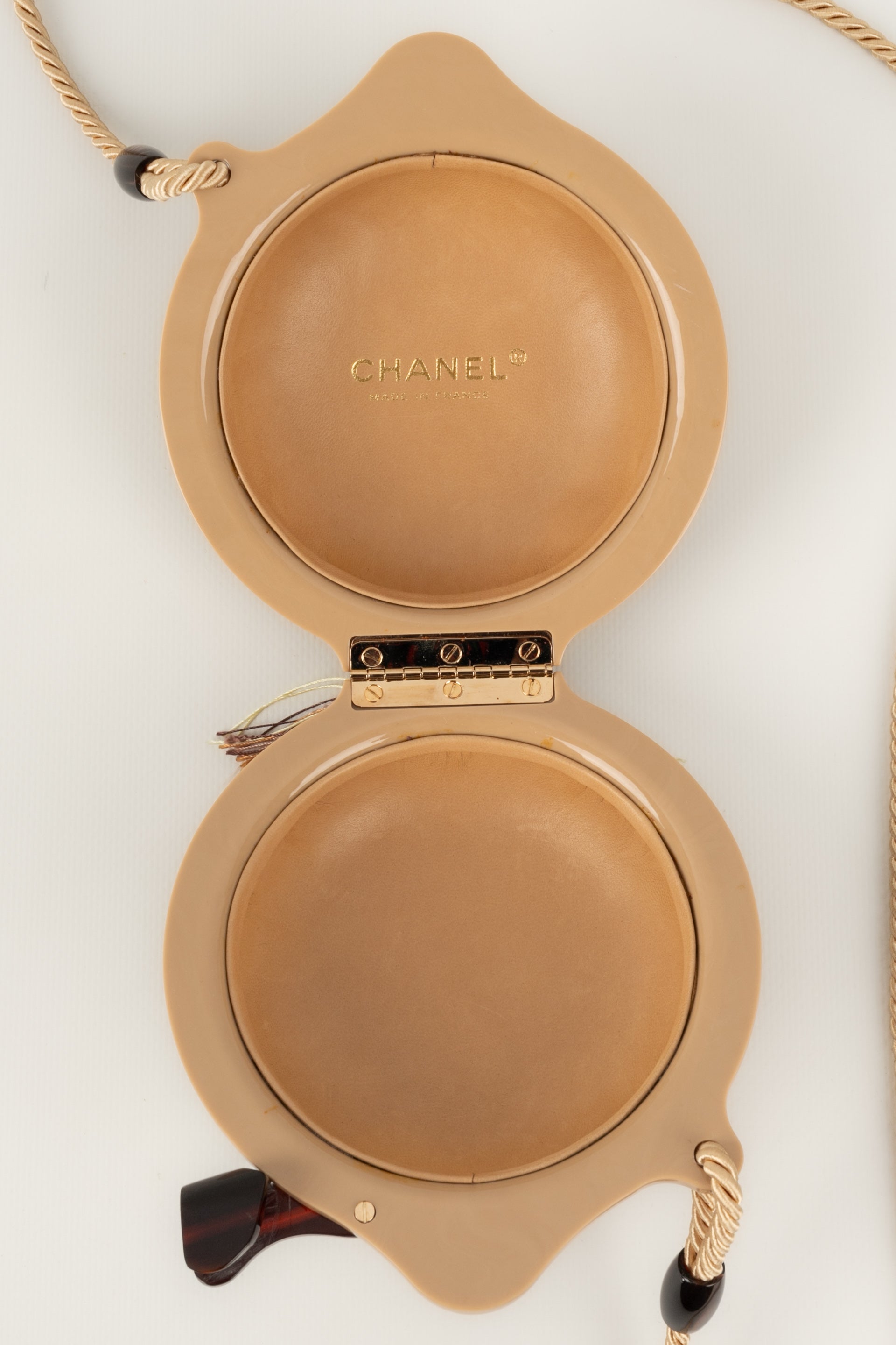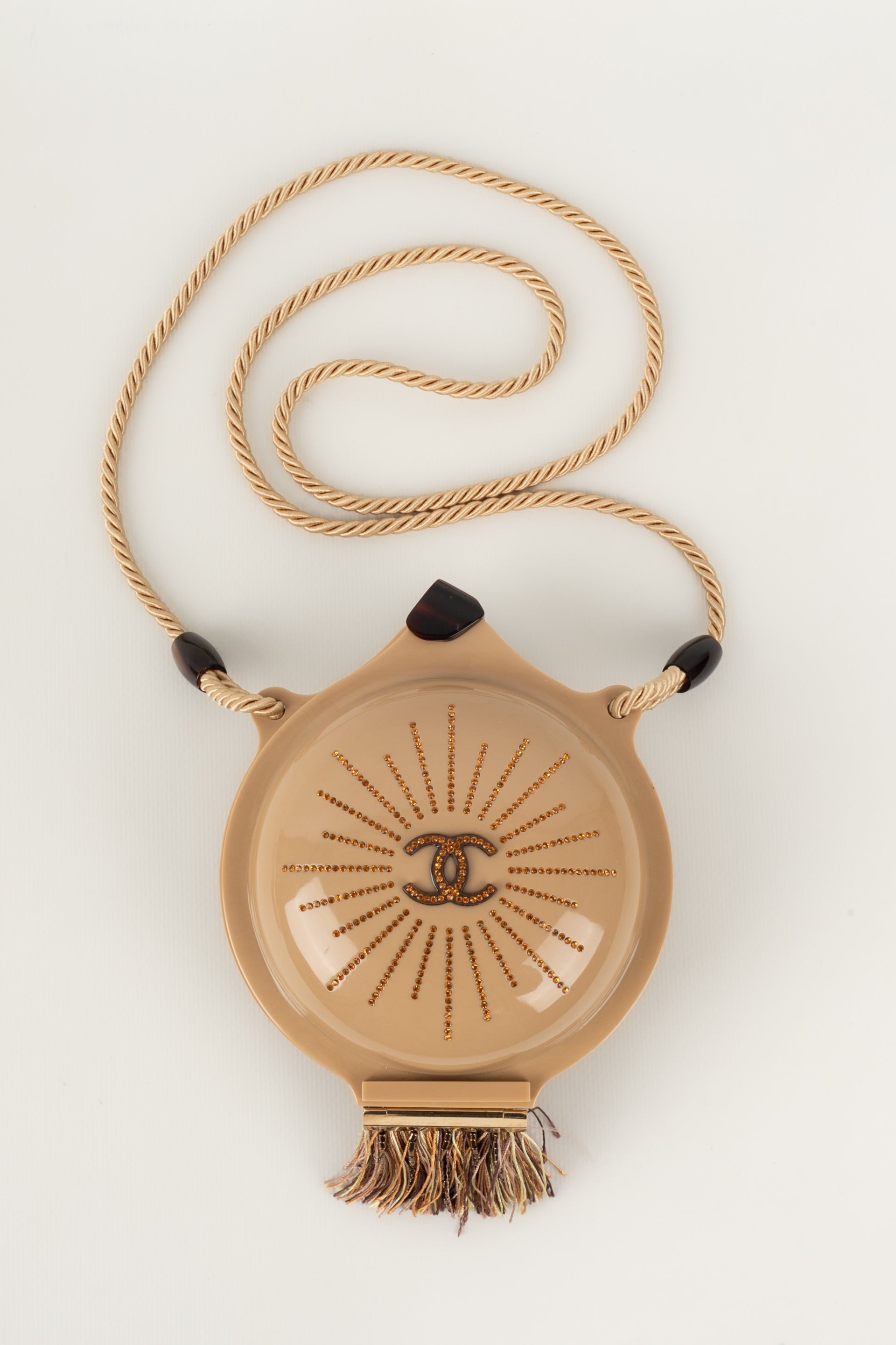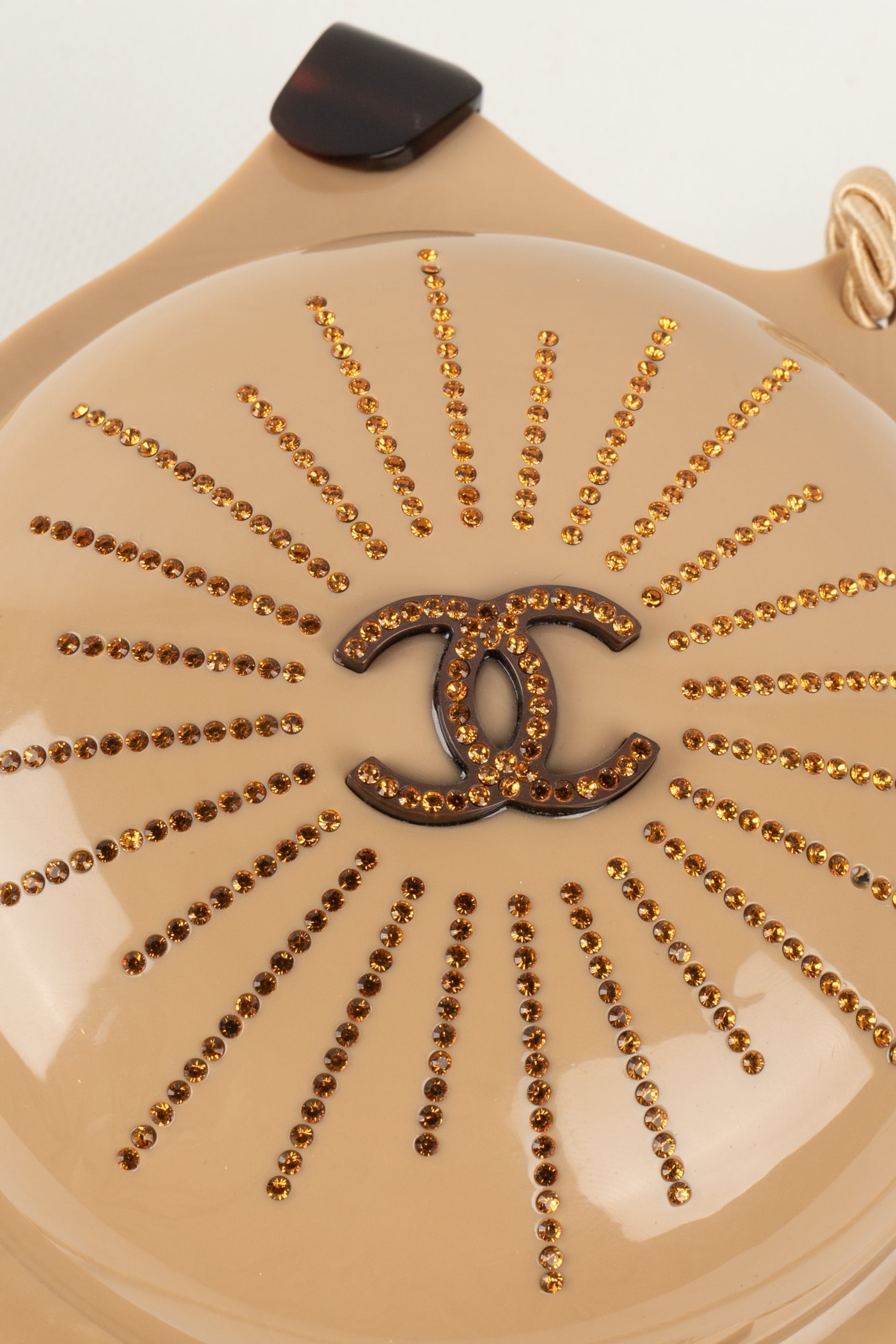CHANEL -(Made in France) Minaudière en bakélite beige décorée de strass orangés, anse en passementerie. Intérieur en cuir d'agneau beige. Collection Printemps/Eté 2005. A signaler 3 strass manquants.
