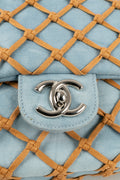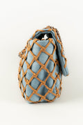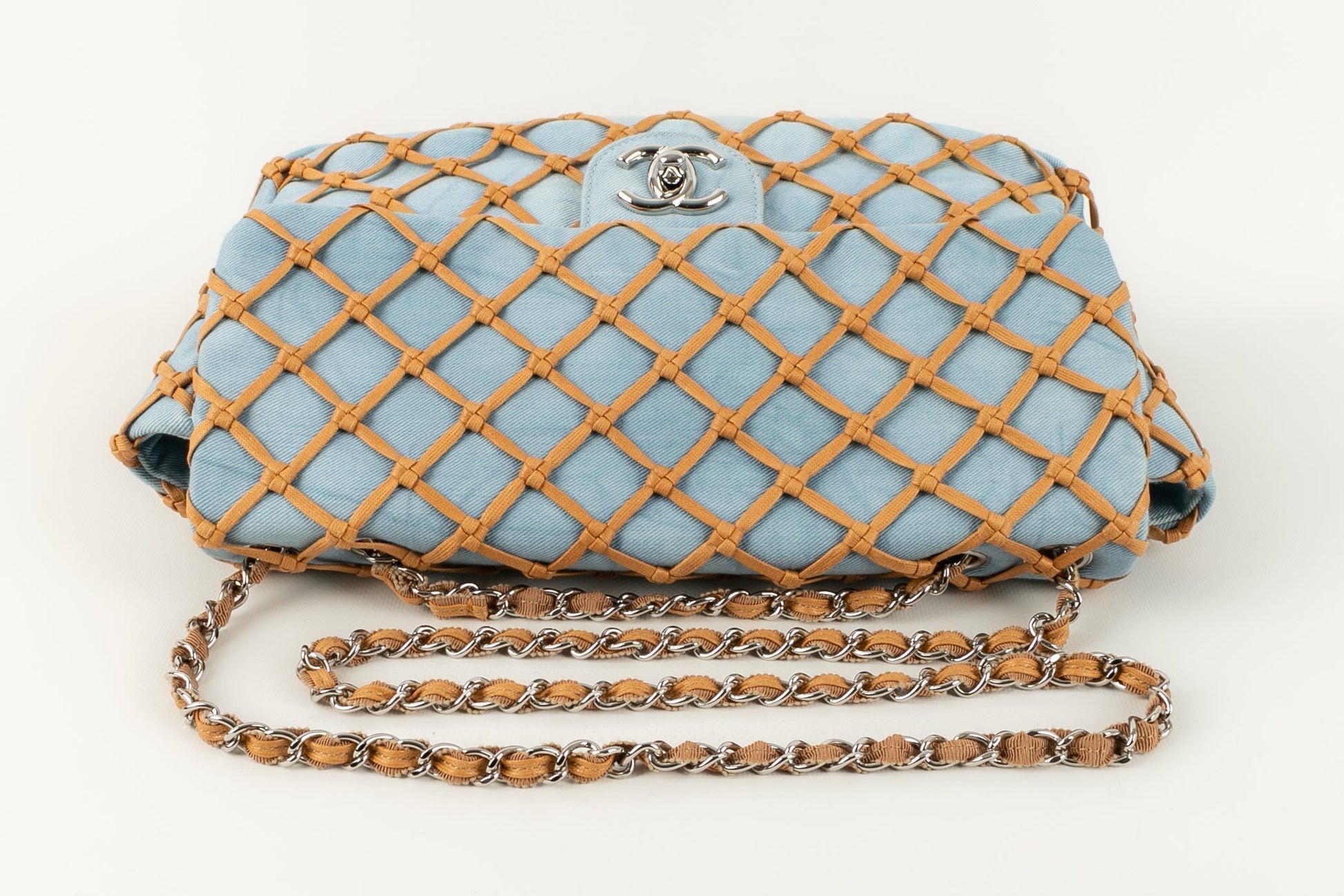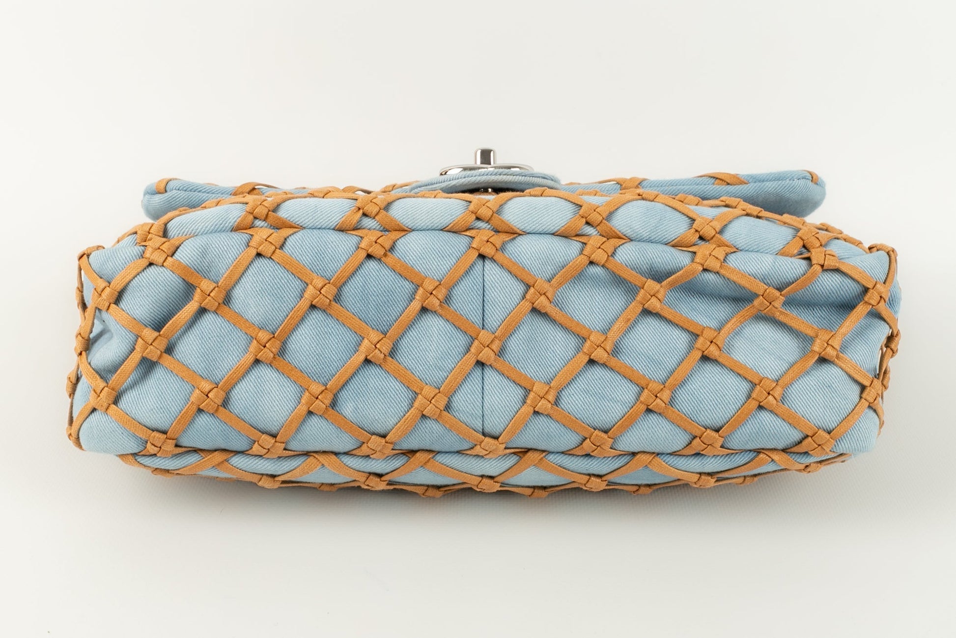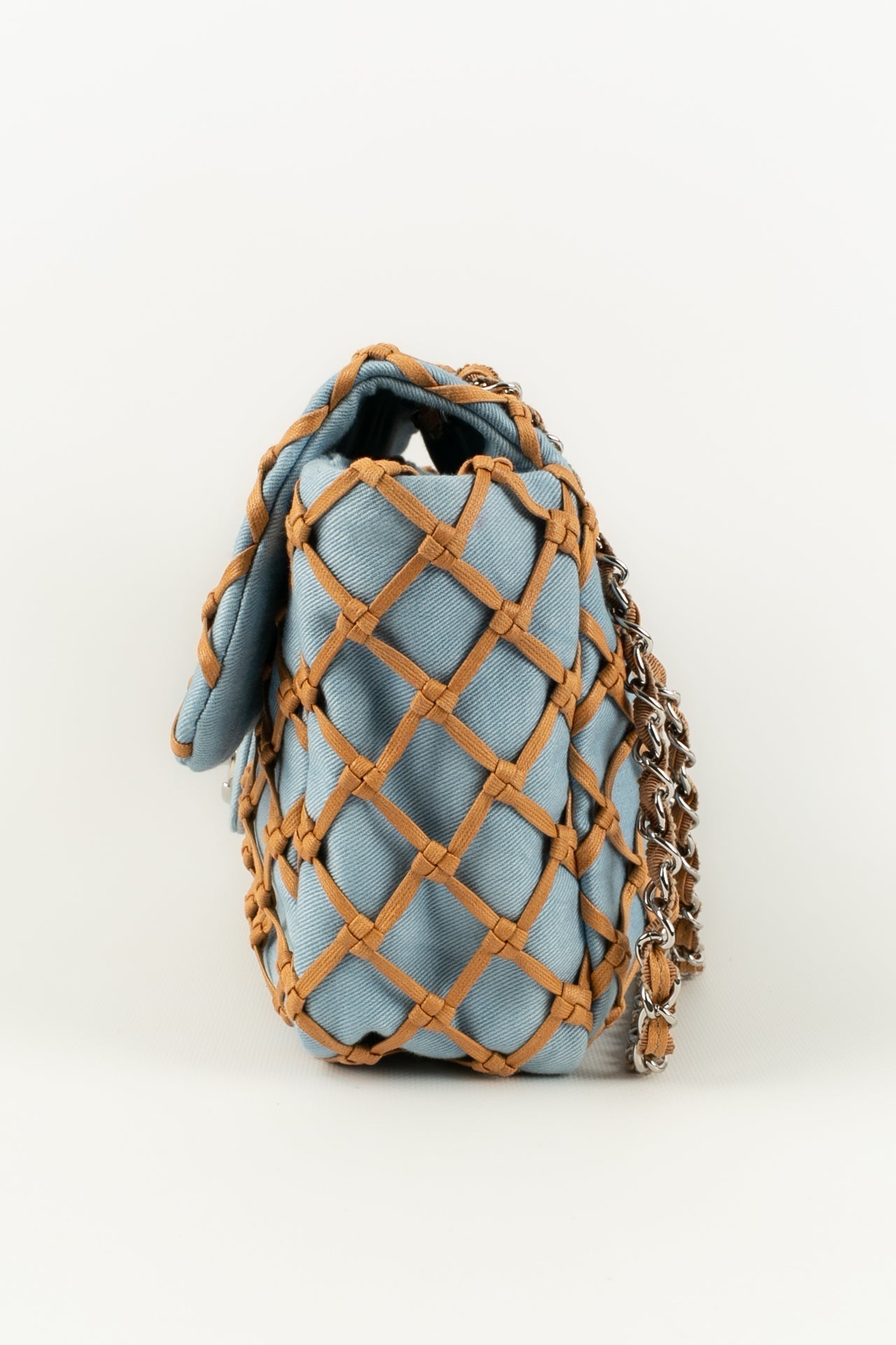 CHANEL -(Made in Italy) Sac en jeans bleu et cuir beige. Attributs en m�tal argent�. Collection Resort 2011.