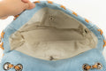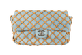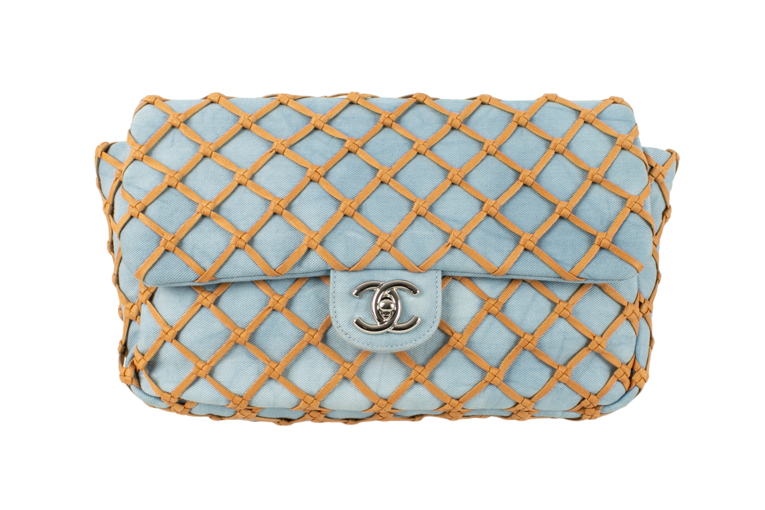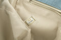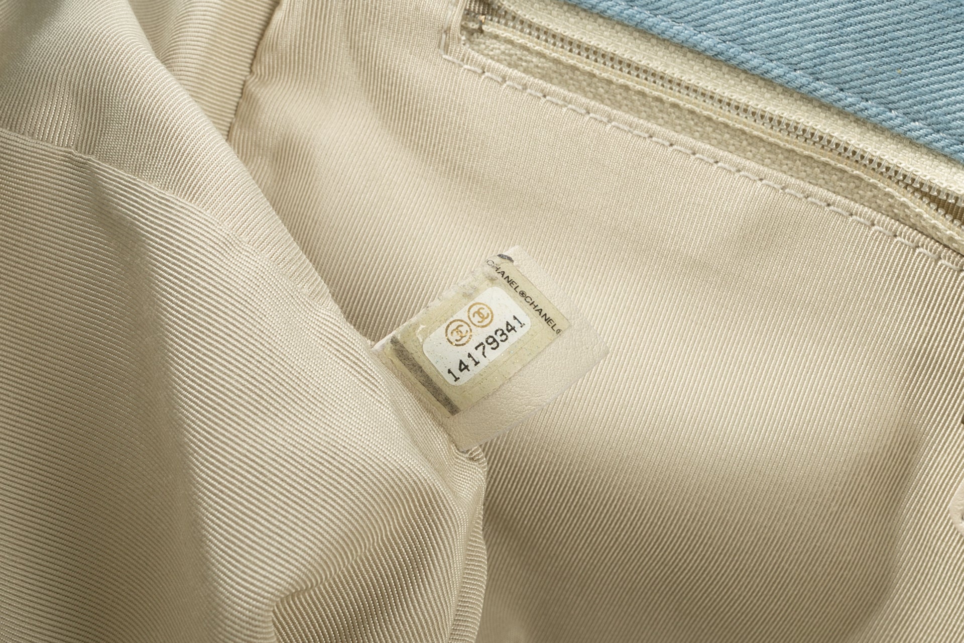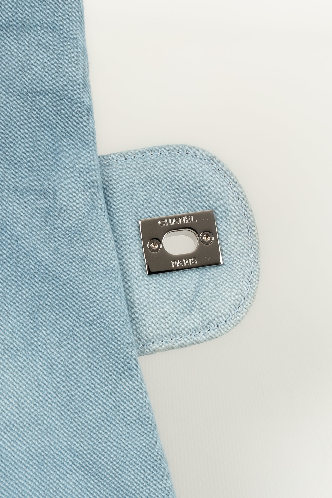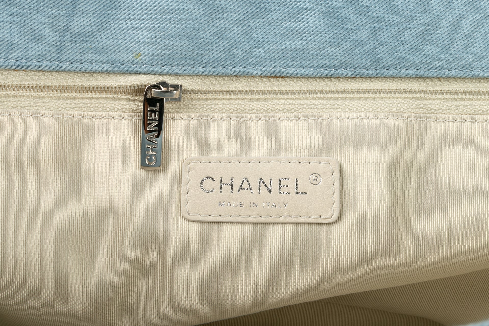 CHANEL -(Made in Italy) Sac en jeans bleu et cuir beige. Attributs en m�tal argent�. Collection Resort 2011.