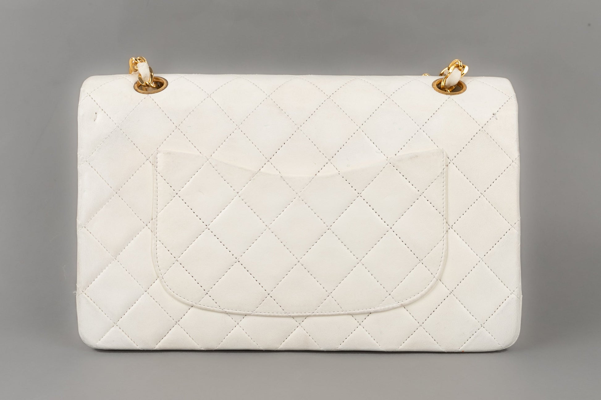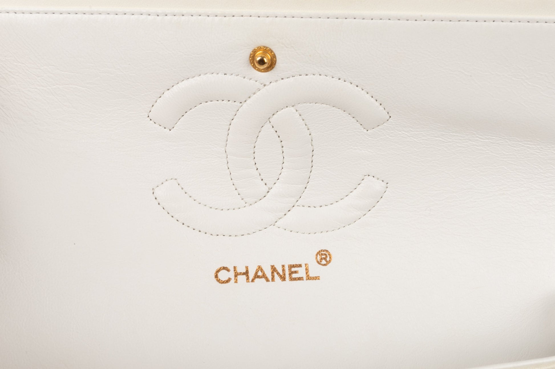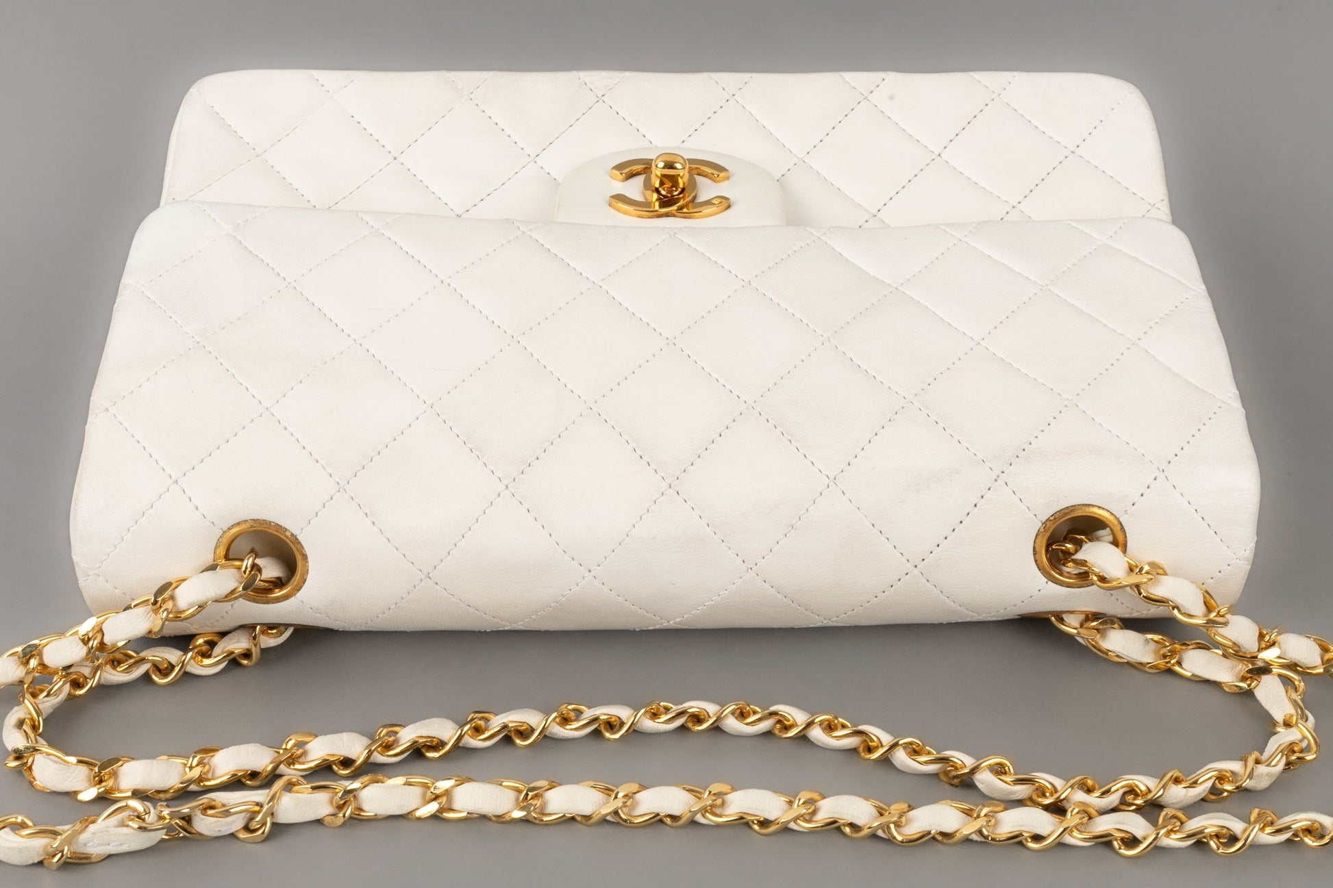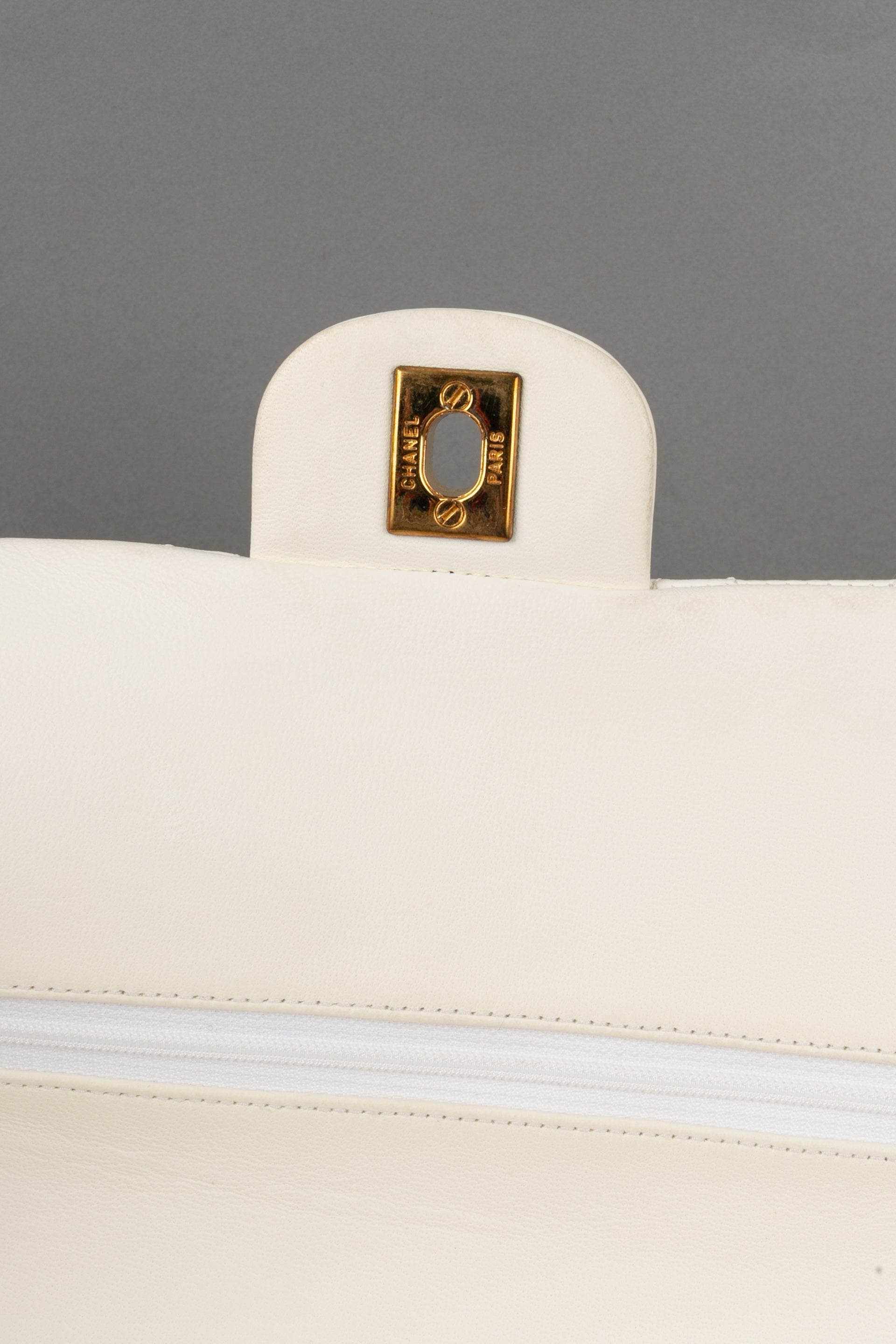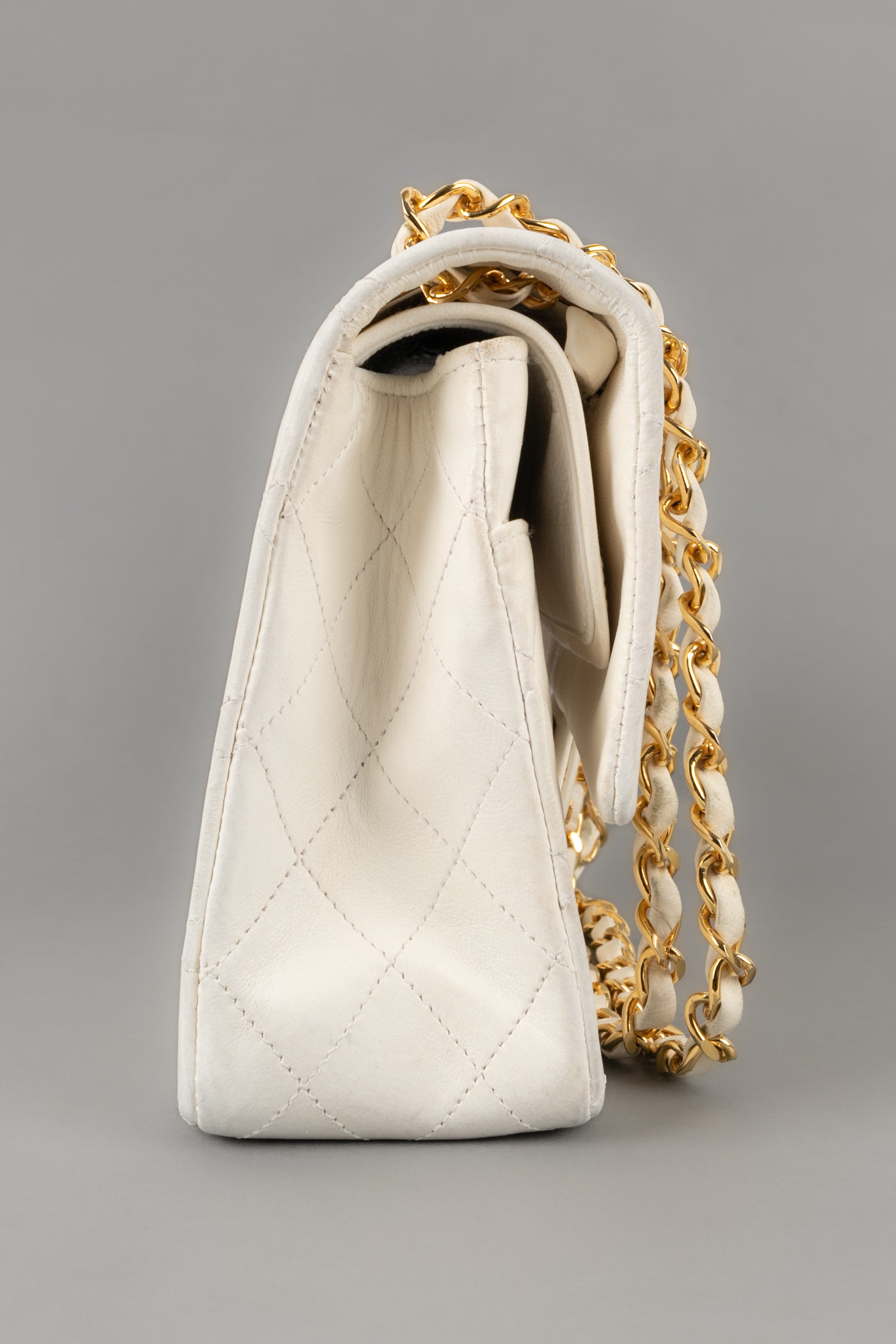 CHANEL - (Made in France) Sac Timeless en cuir blanc matelassé, attributs en métal doré. Numéro de série et carte d'ité présents. Collection 1986/1988. A signaler, quelques signes d'usure.