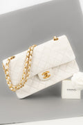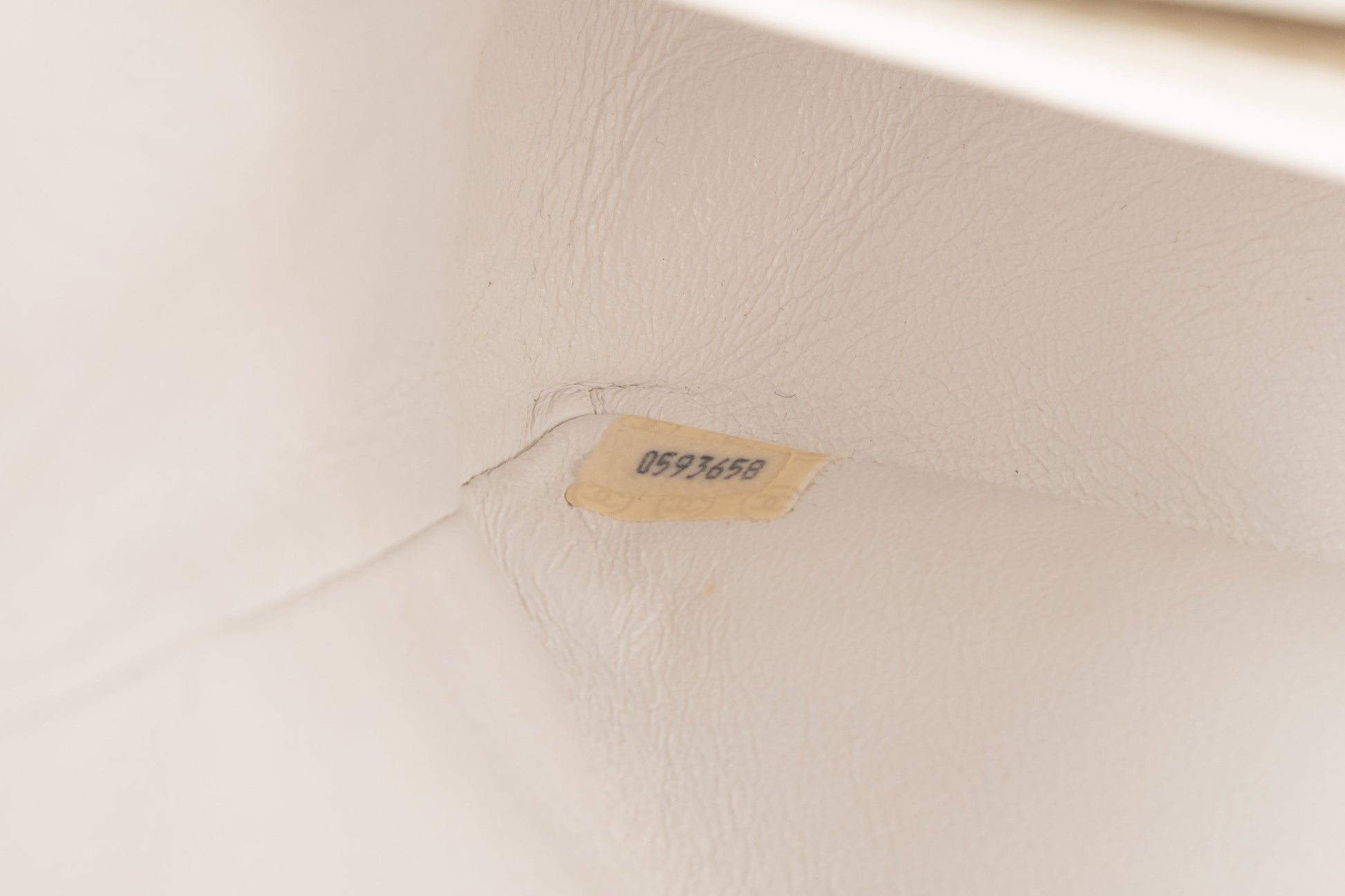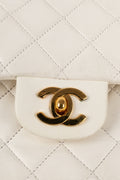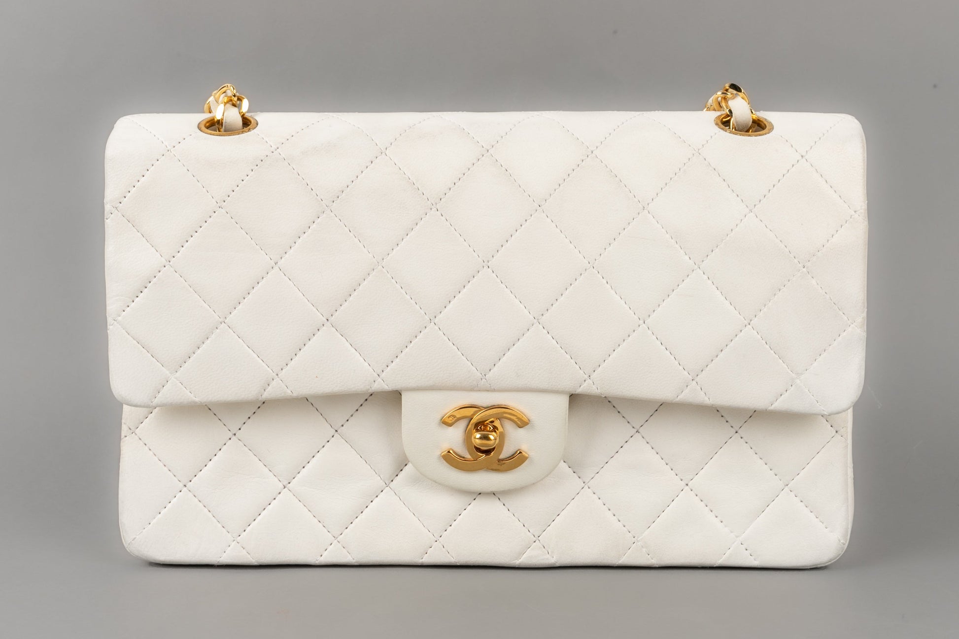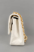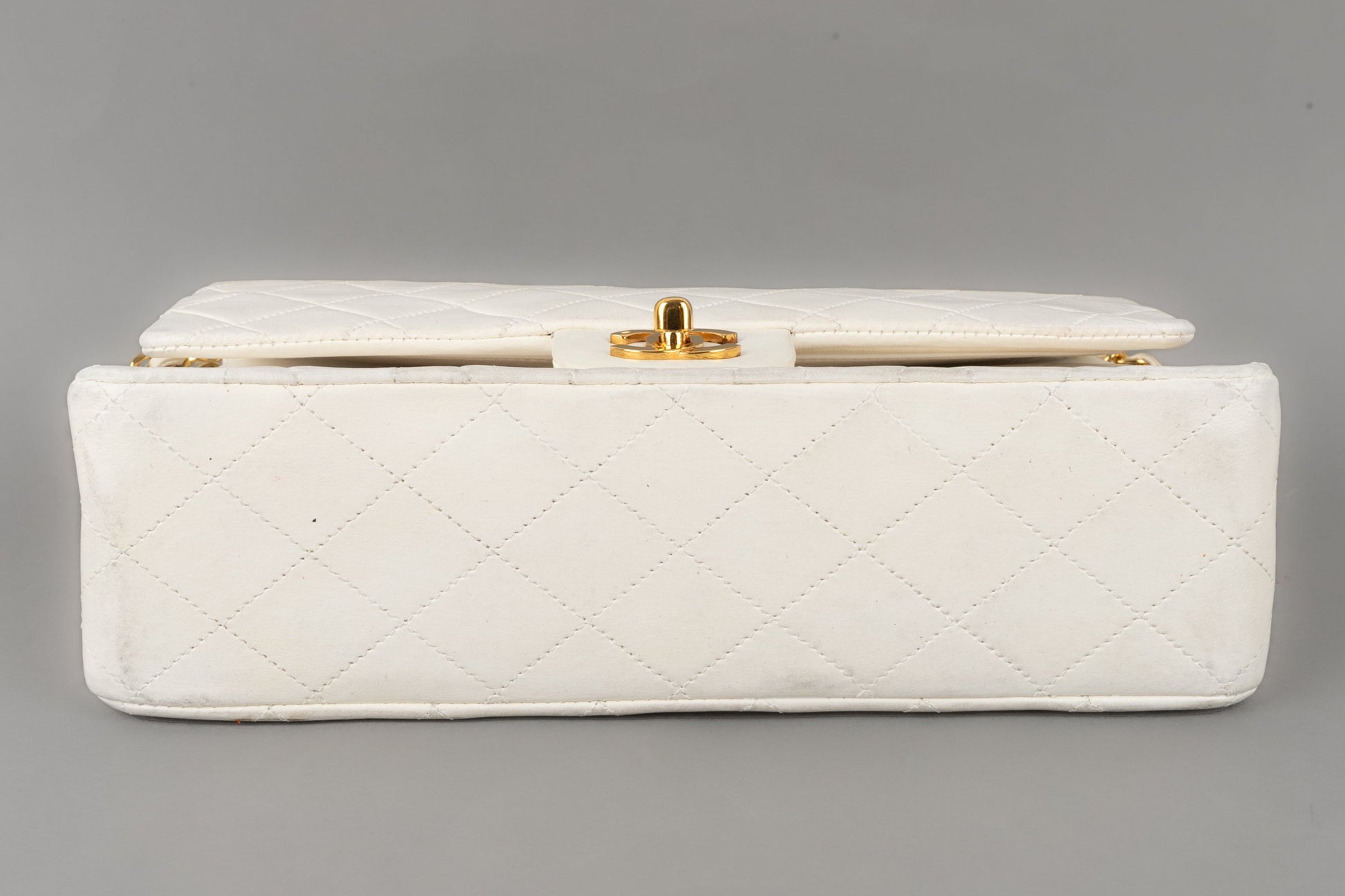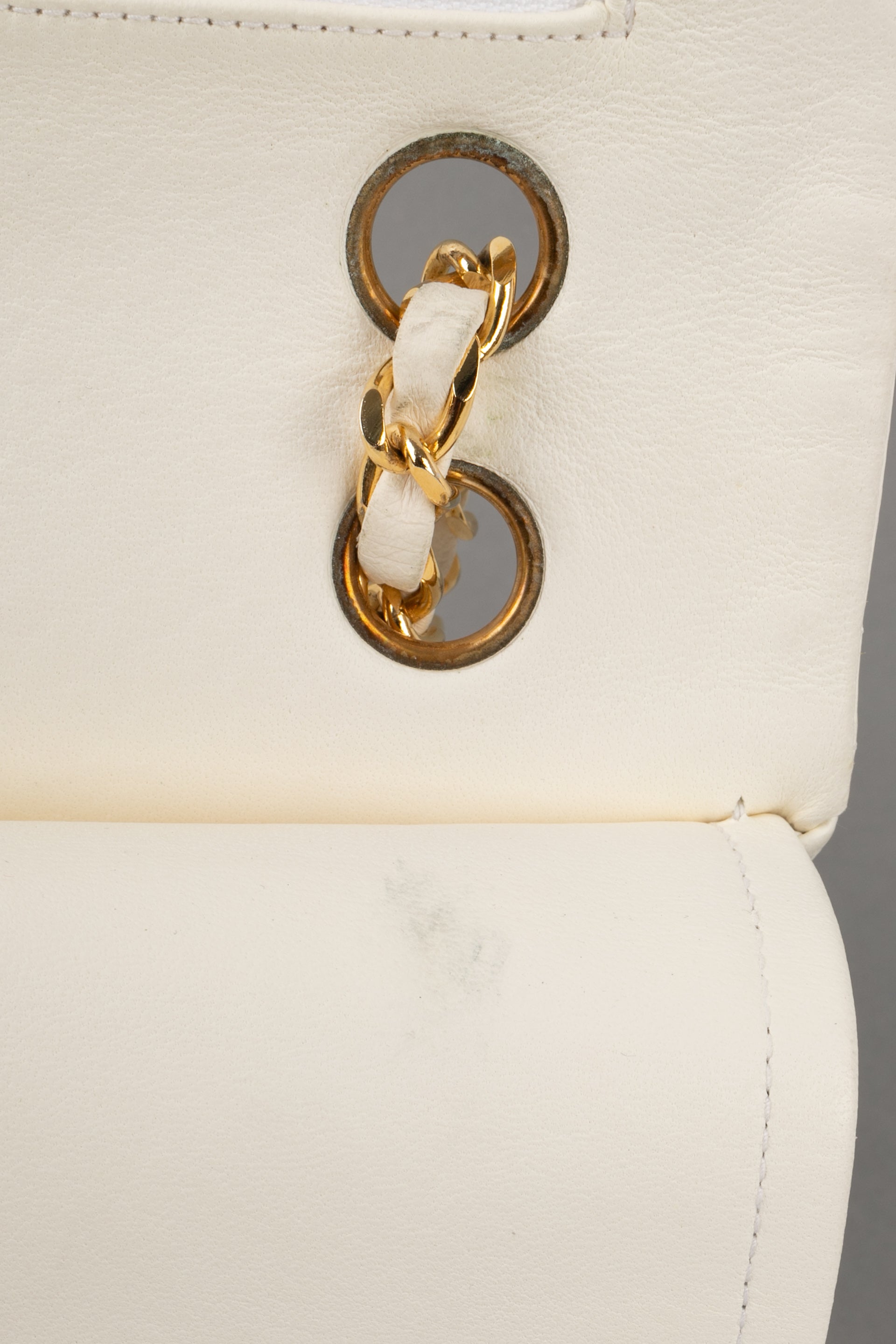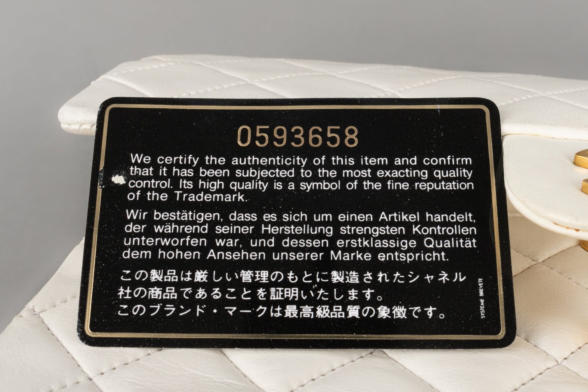 CHANEL - (Made in France) Sac Timeless en cuir blanc matelassé, attributs en métal doré. Numéro de série et carte d'ité présents. Collection 1986/1988. A signaler, quelques signes d'usure.