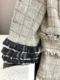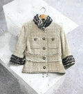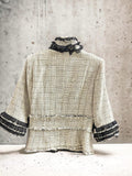 • Particularités : Boutons bijoux; fils dorés et argentés entremêlés dans le Tweed; col et manche en dentelle; ceintrée à la taille.