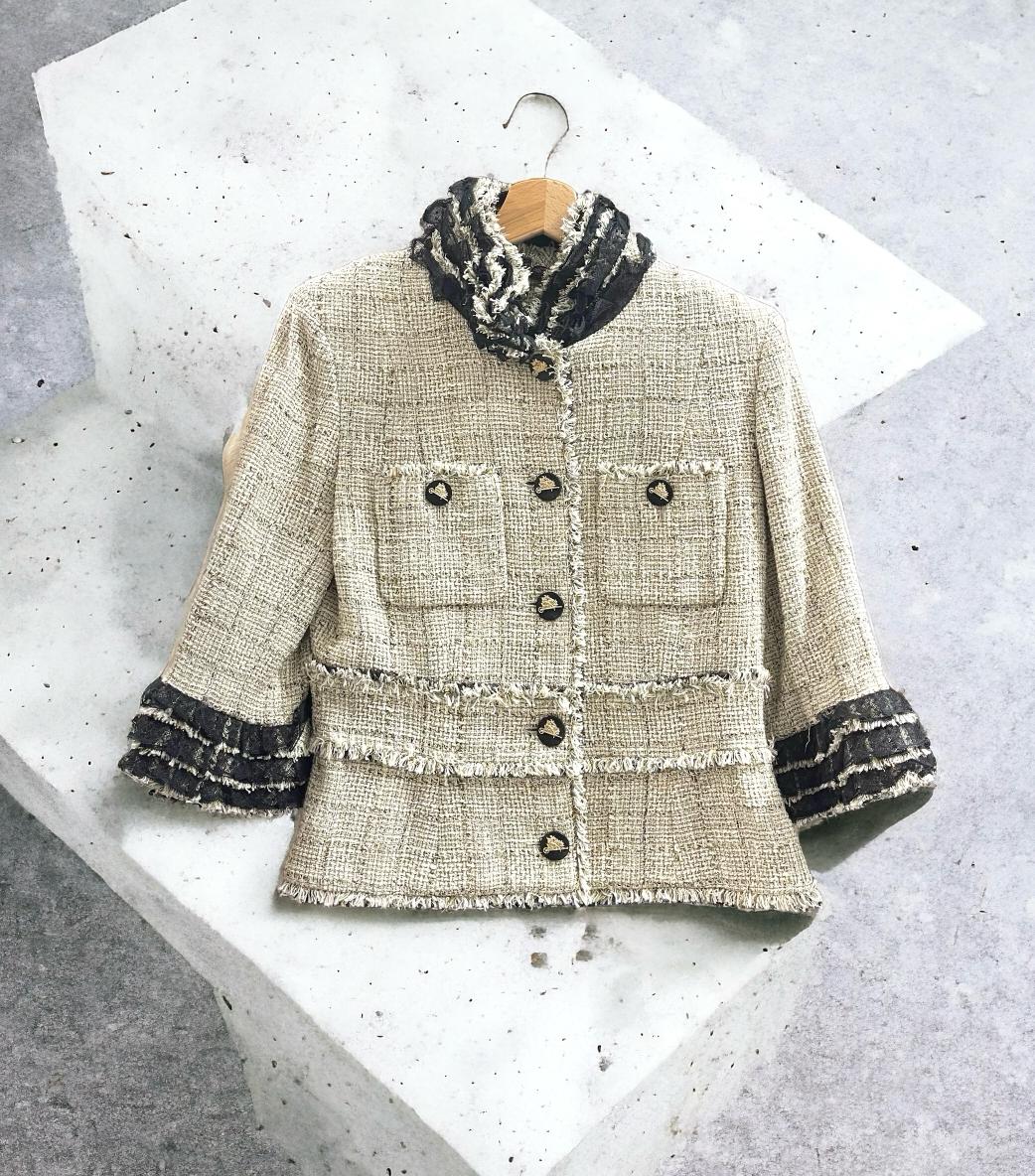 Cette sublime veste comporte bien entendu tous les détails d'une veste classique Chanel. Composée de poches; sa doublure intérieure en soie et sa chaînette promettent un tombé parfait.