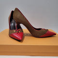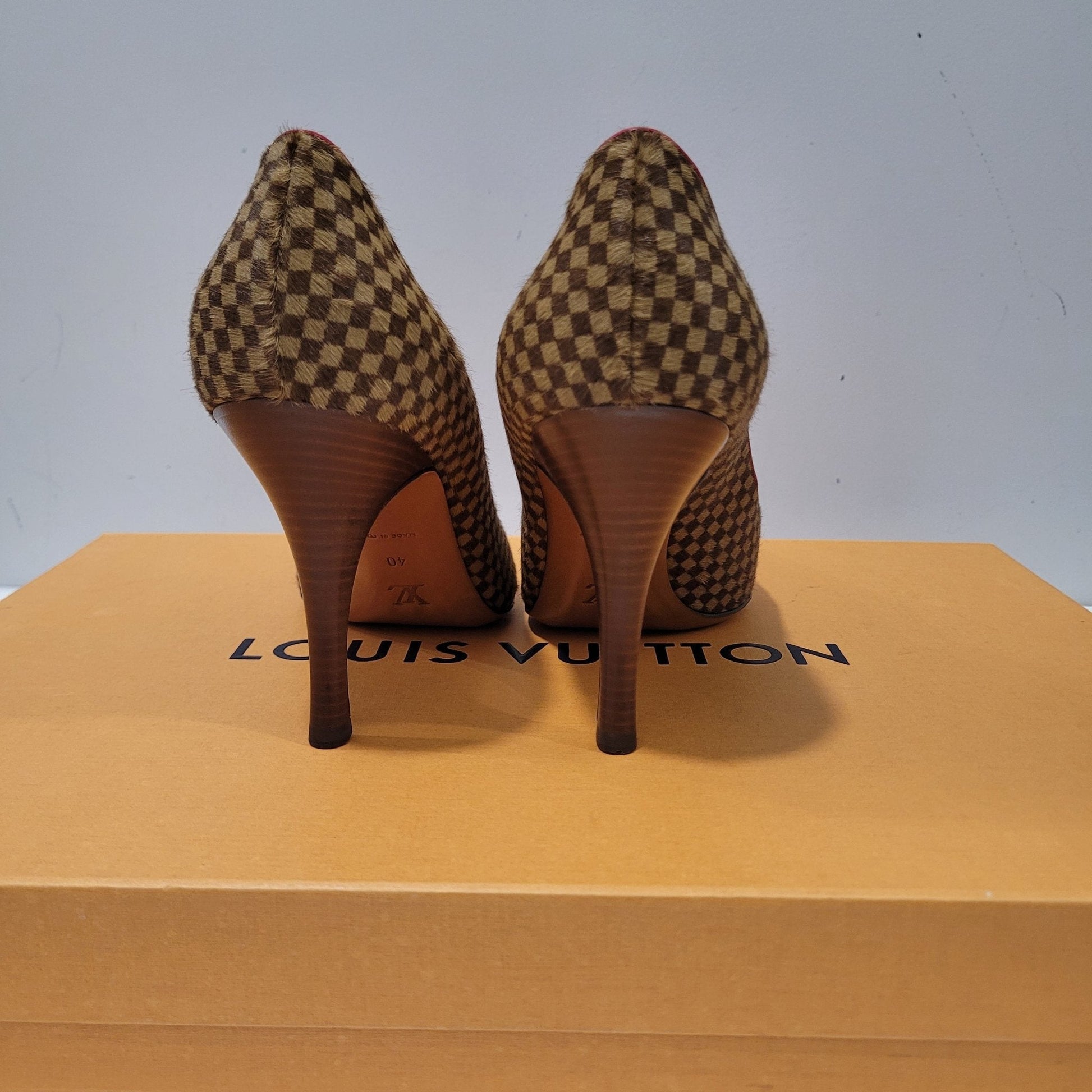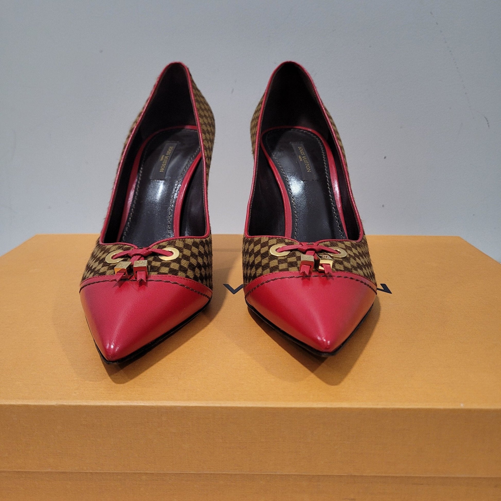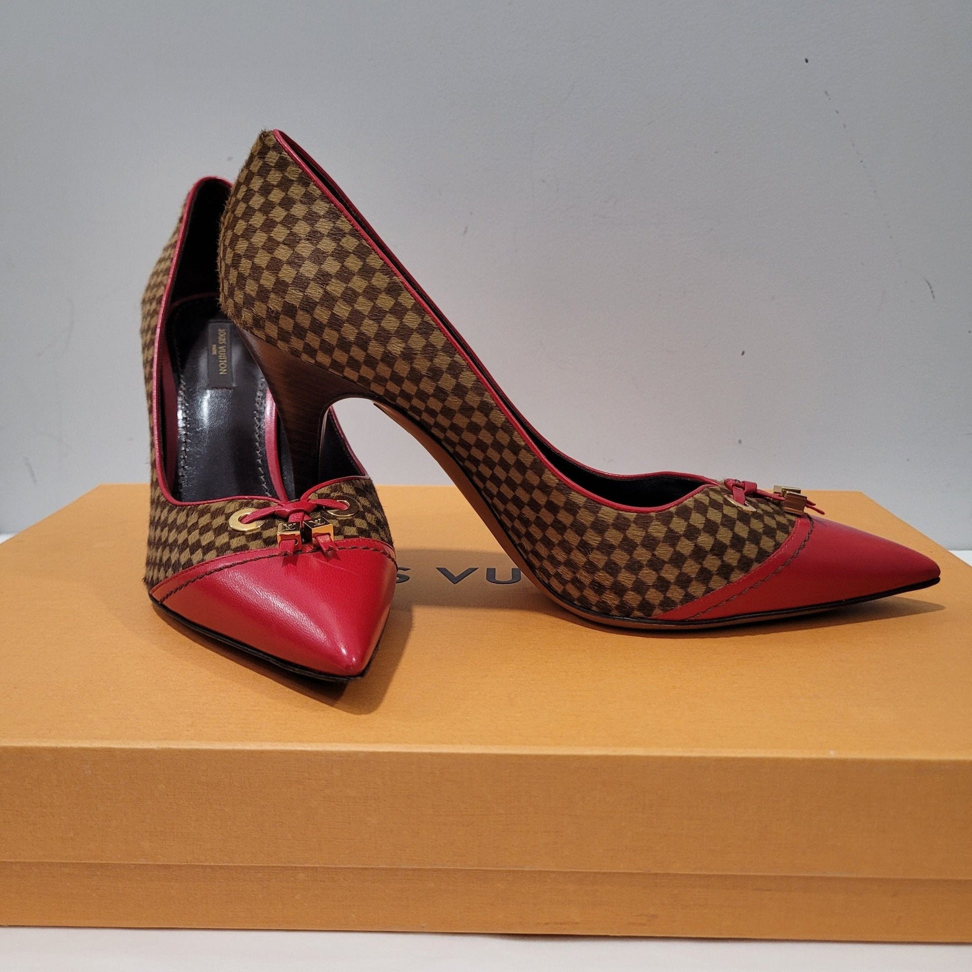 Escarpins de la marque Louis Vuitton en damier en fourrure de cheval et cuir rouge.