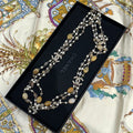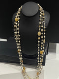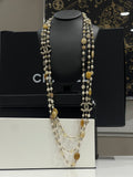 Élégant sautoir triple rang avec 2 logos Chanel réversibles perles ou métal travaillé. Perles de verres travail artisanal des collections métiers d’arts dans leur ateliers Gripoix.