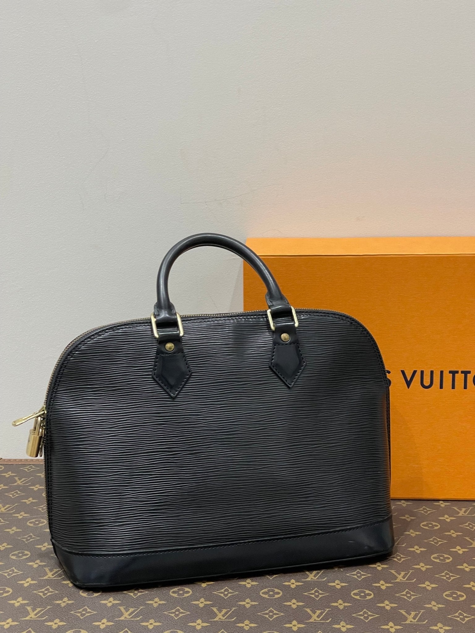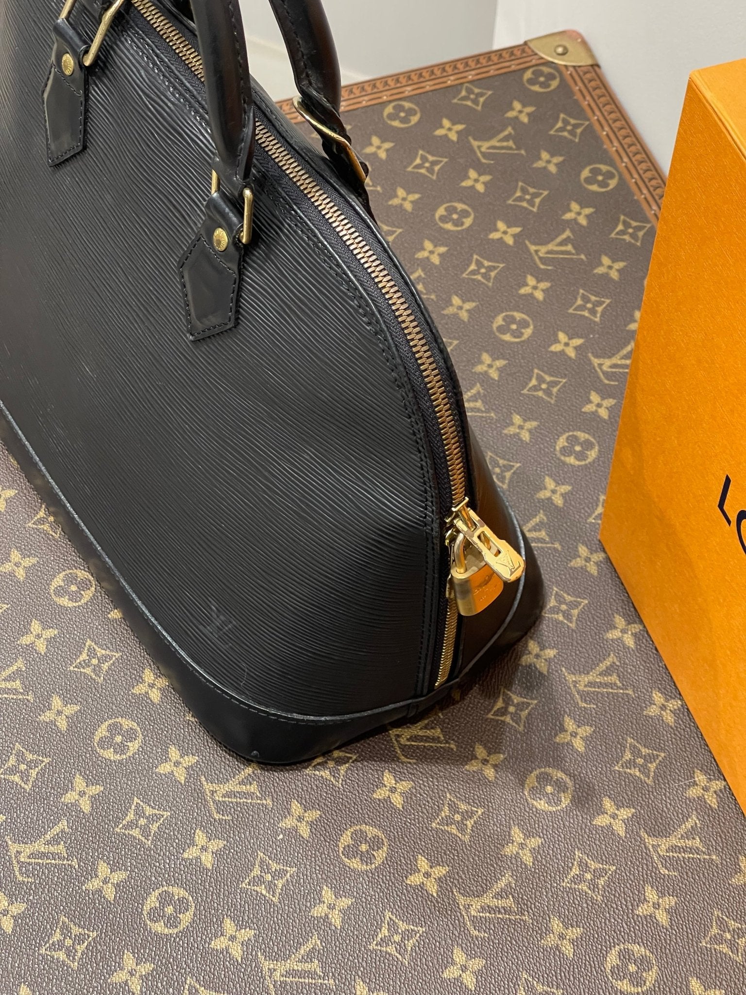 Sac classique intemporel, le sac Alma MM en cuir épi noir idéal pour le quotidien. Pièce rare car la taille MM épi n’est plus disponible auprès de LV.