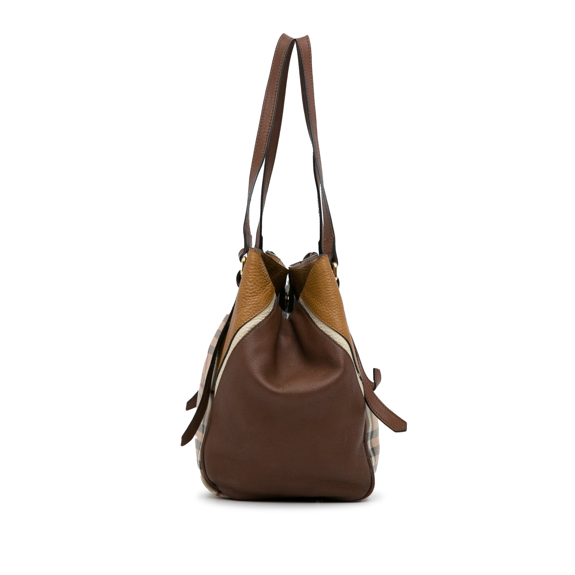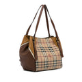 Product Details: Tan�Burberry Haymarket Check Canterbury Tote. This tote bag features a coated canvas body with leather trim, flat leather handles, an open top with magnetic button closure, and interior zip and slip pockets. 10.6" L x 11.8" W x 5.5" D, 9.1" drop. Serial number ITTIVGRO58CAL 3950171/64F.