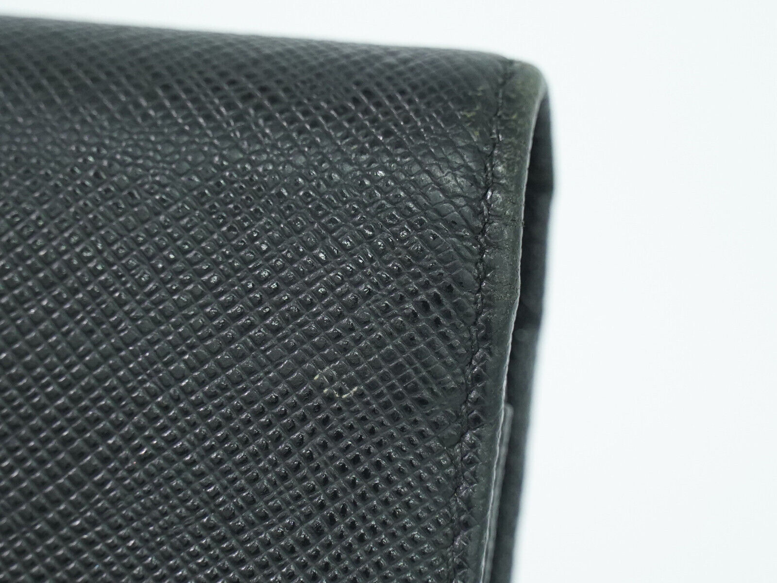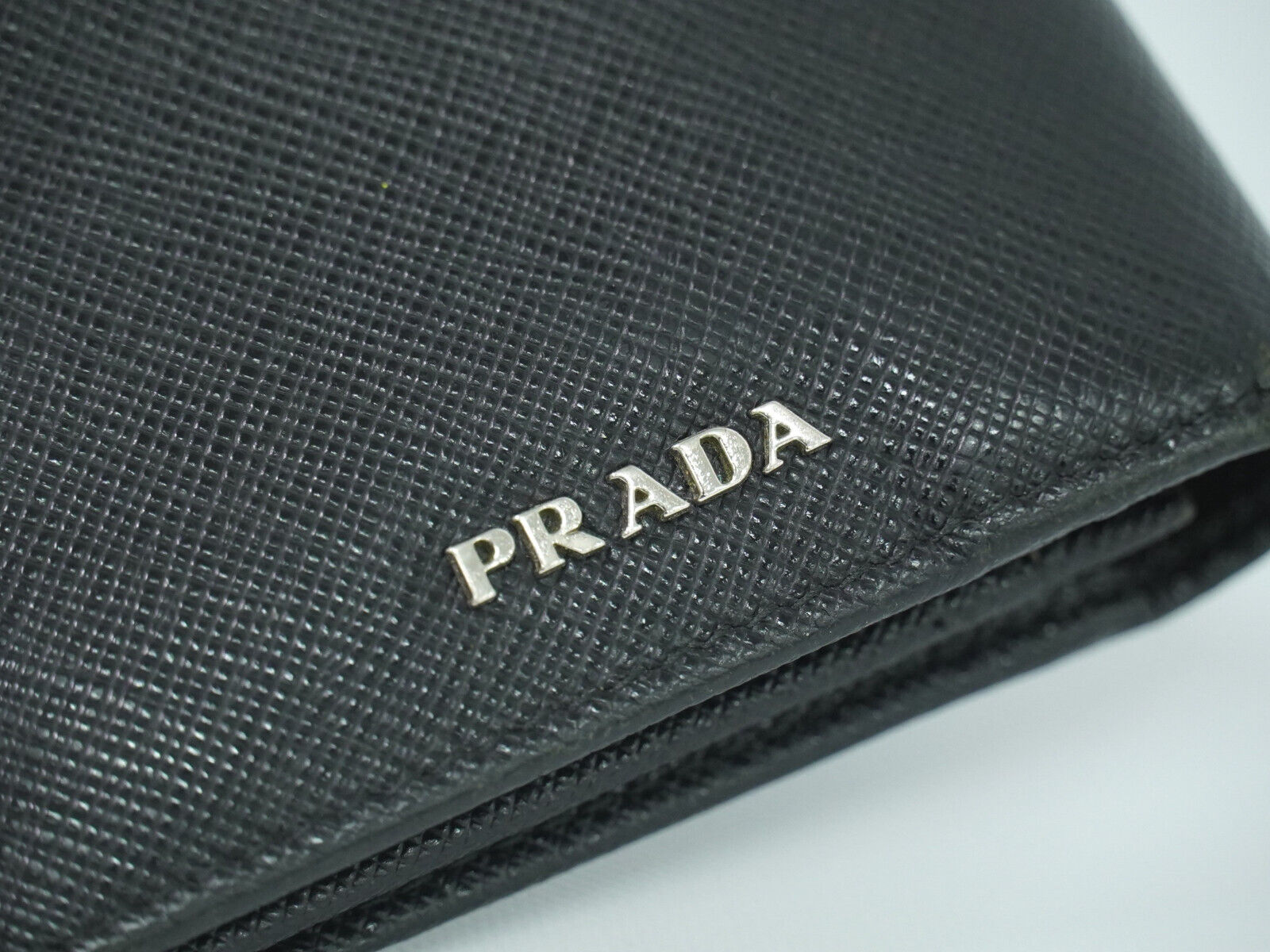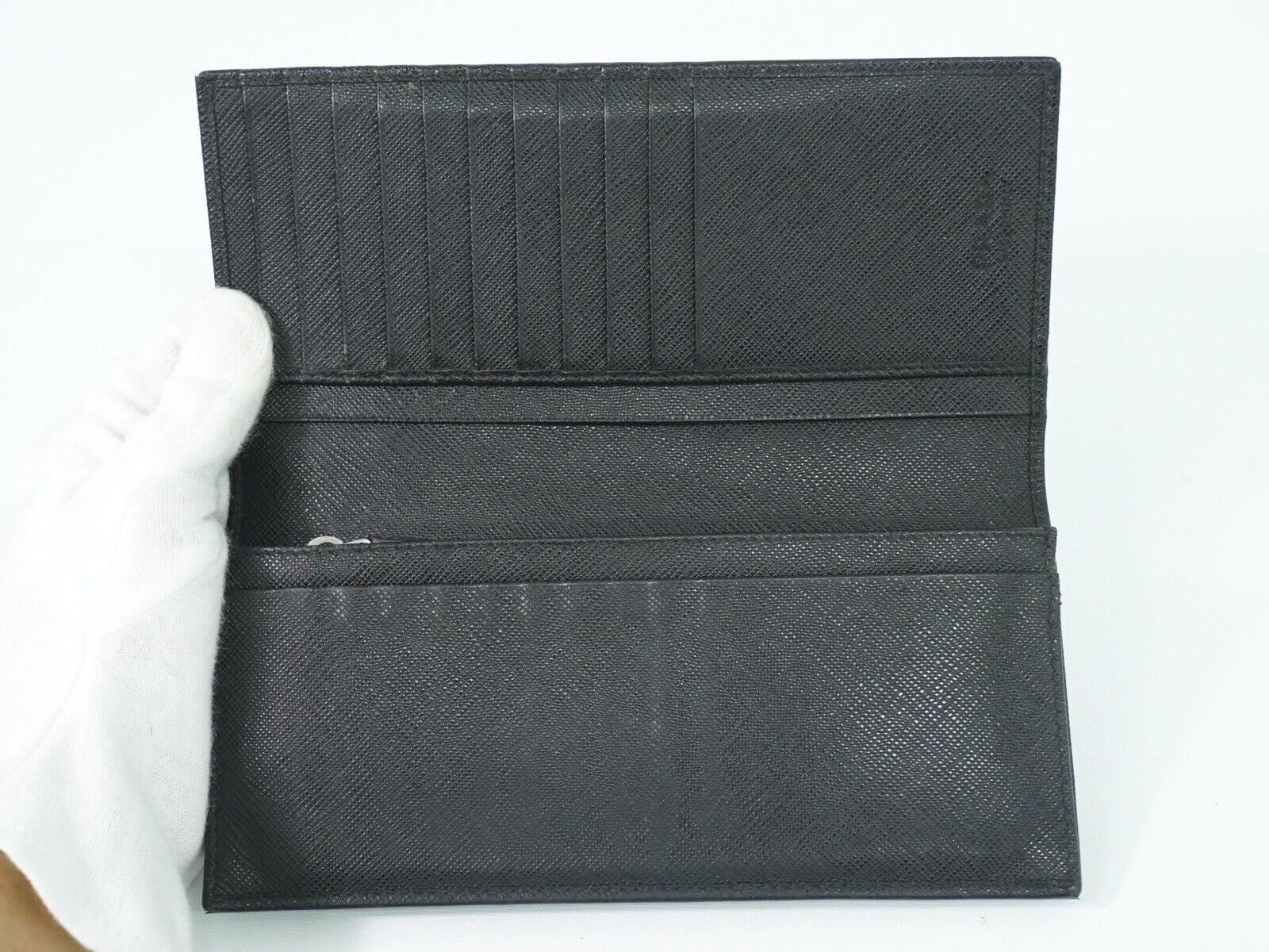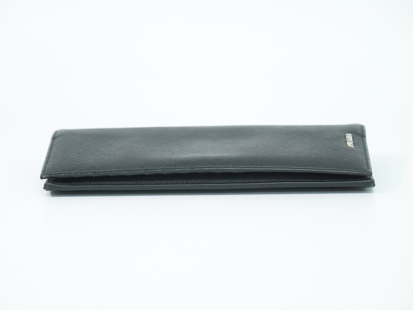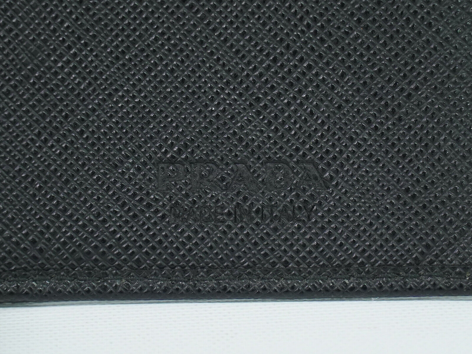 Brand: Prada Model: Saffiano Color: Black Material: Leather Inclusions: / Dimensions: W 9 x H 19 x D 1 cm Serial number: 181A Country of origin: Italy Condition: B - good condition. The Prada Saffiano bifold wallet in black leather combines elegance with practicality in a design suited for any gender. Made from the renowned Saffiano leather this long wallet features a textured finish that is both durable and stylish. Its bifold style offers a sleek profile while the well-organized interior includes multiple pockets for convenient storage of cards cash and other essentials. The exterior features wrinkles rubbing peeling and minor stains. The interior has slight rubbing minor stains card marks and additional rubbing and stains in the zipped pocket. The hardware shows slight scratches and a bit of tarnish. There is also a faint storage odor. We recommend that you look at all the photos before making your purchase to ensure that you are satisfied with the condition of the item.